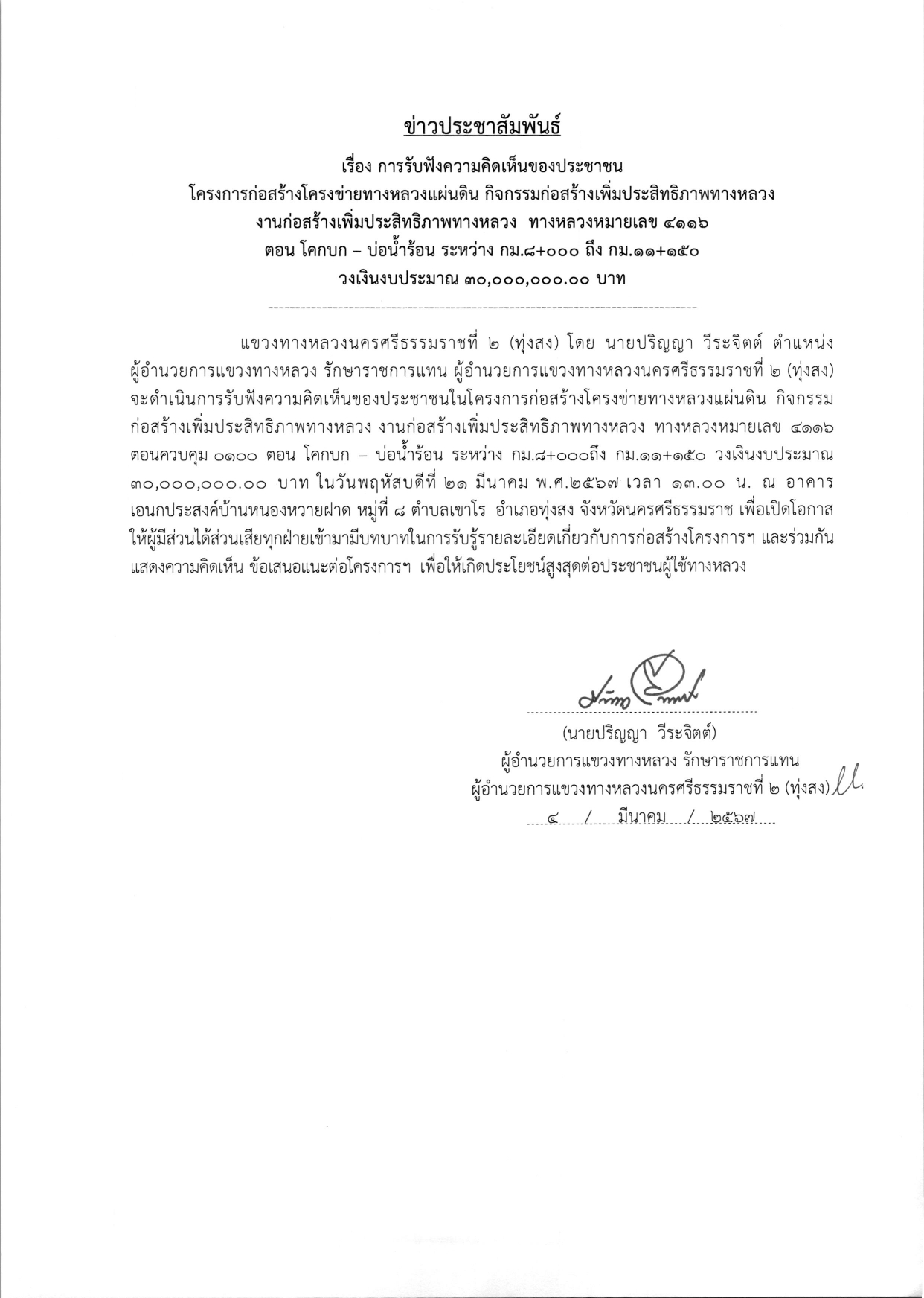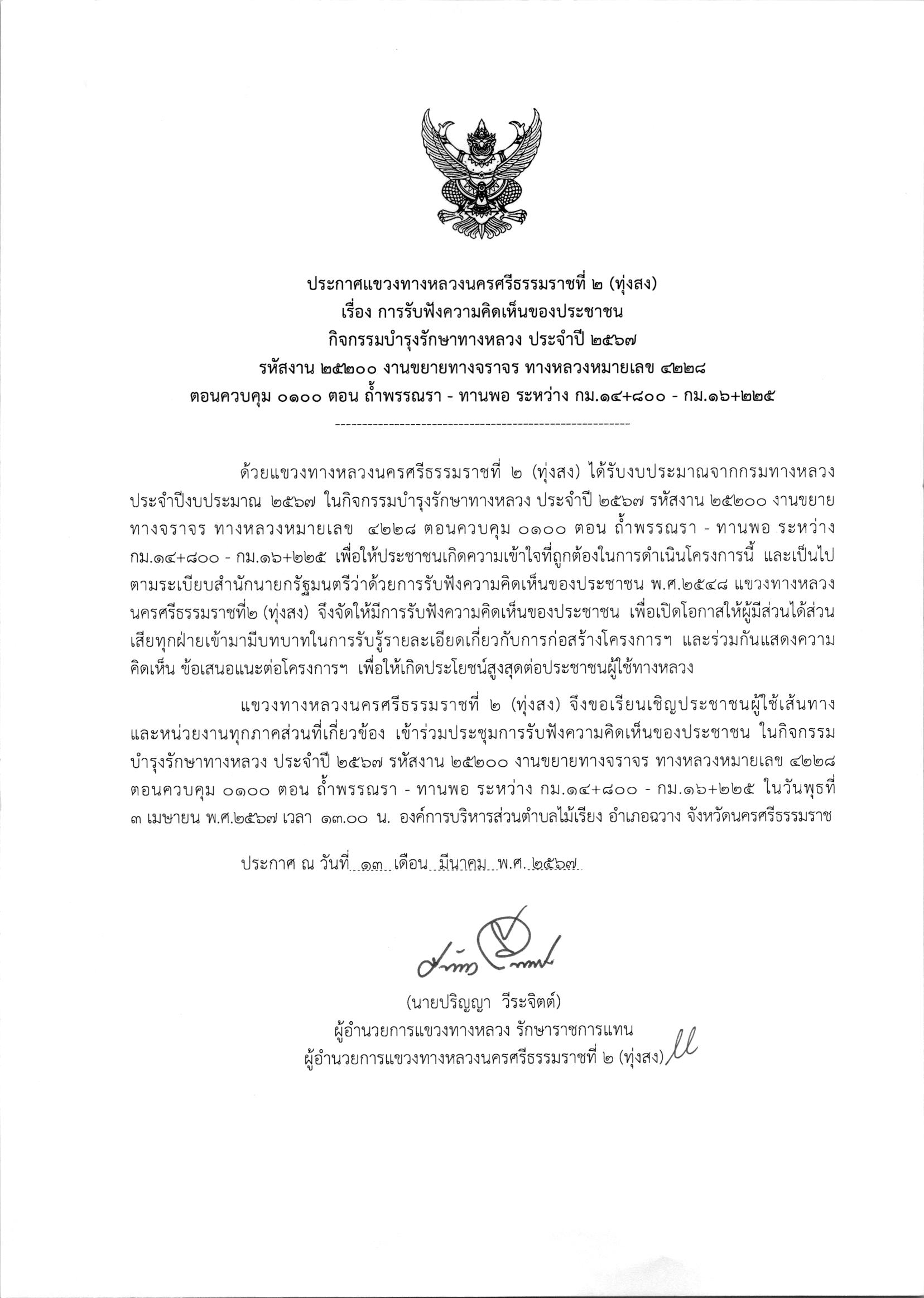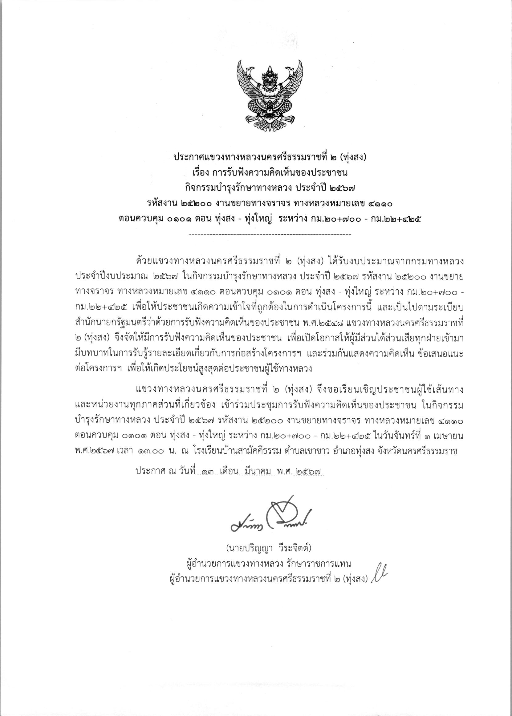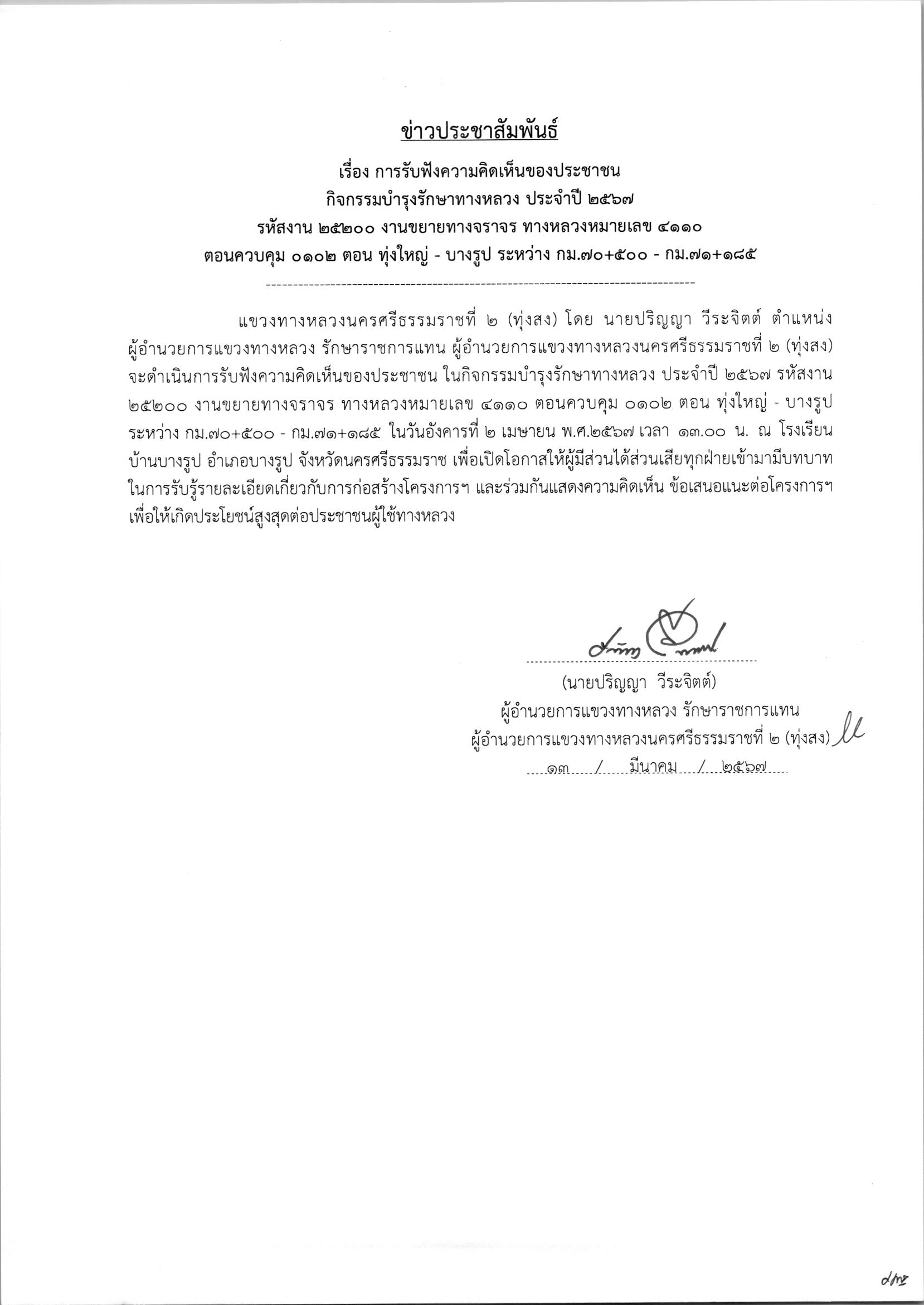 การรับฟังความคิดเห็นของประชาชน ในกิจกรรมบำรุงรักษาทางหลวง ประจำปี 2567 รหัสงาน 25200 งานงานขยายทางจราจร ทางหลวงหมายเลข 4110 ตอนควบคุม 0101 ตอน ทุ่งสง - ทุ่งใหญ่ ระหว่าง กม.20+700 - กม.22+425