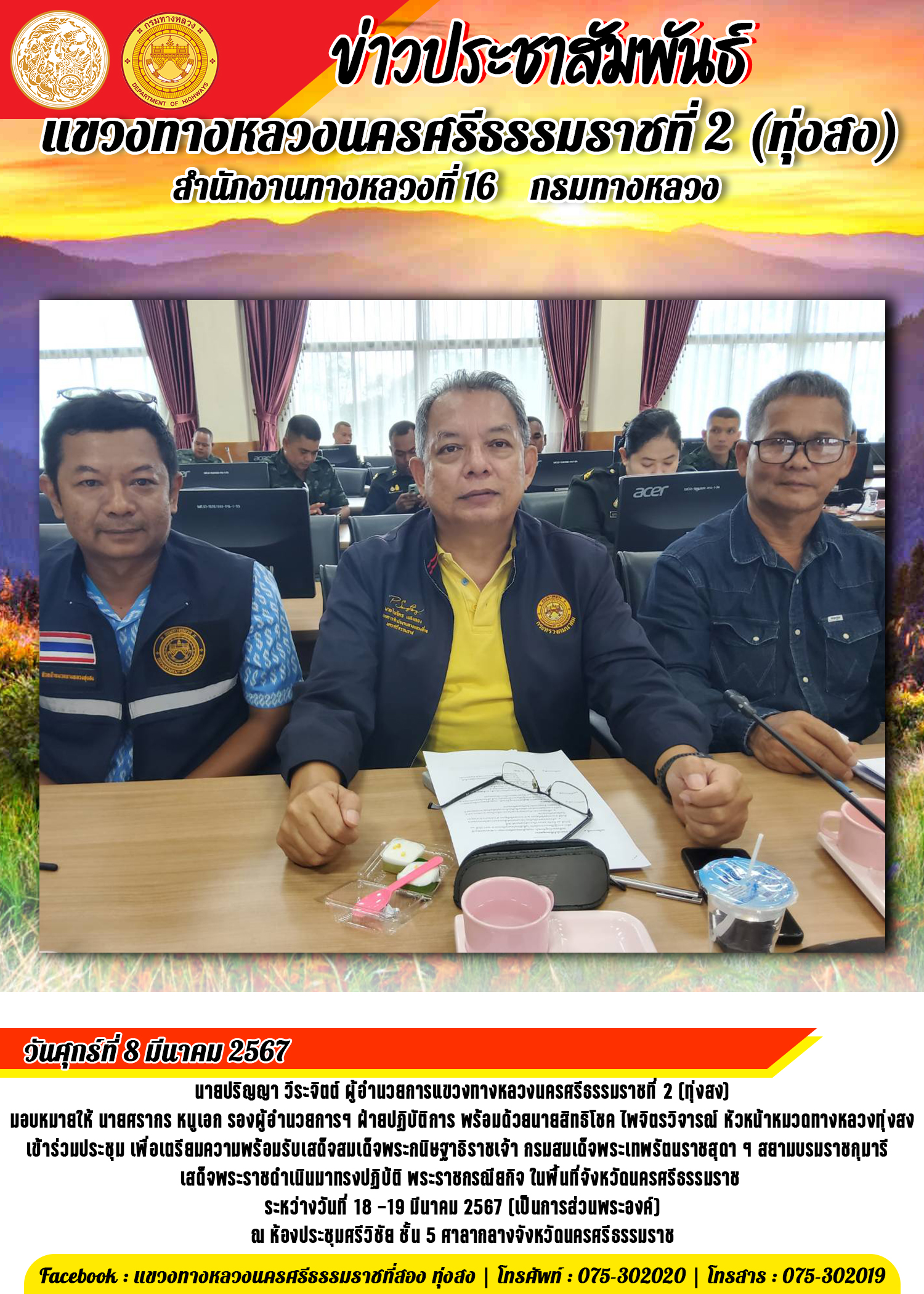 ประชุมเพื่อเตรียมความพร้อมรับเสด็จสมเด็จพระกนิษฐาธิราชเจ้า กรมสมเด็จพระเทพรัตนราชสุดา ฯ สยามบรมราชกุมารี เสด็จพระราชดำเนินมาทรงปฏิบ้ติ พระราชกรณียกิจ ในพื้นที่จังหวัดนครศรีธรรมราช ระหว่างวันที่ 18 -19 มีนาคม 2567 (เป็นการส่วนพระองค์)