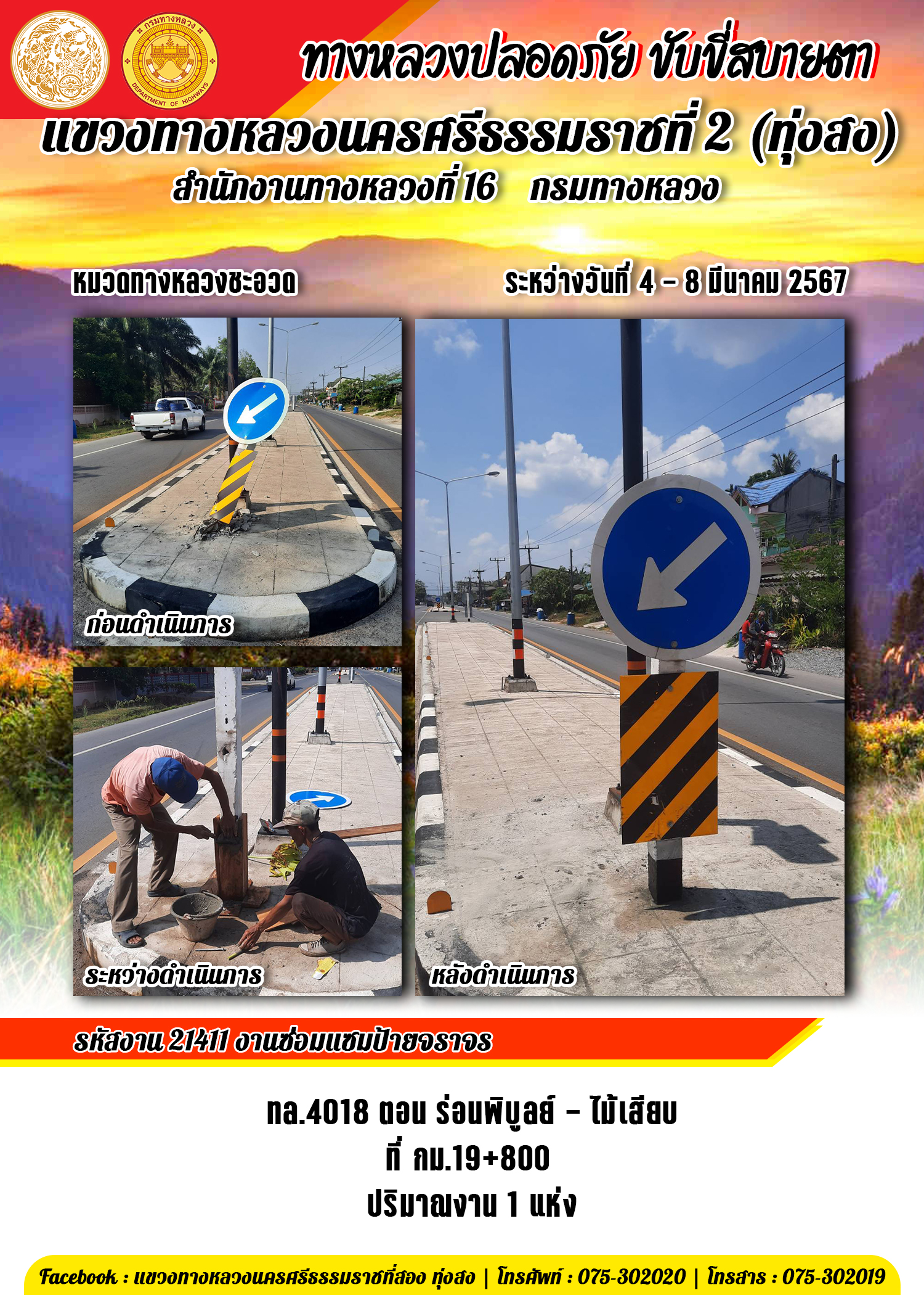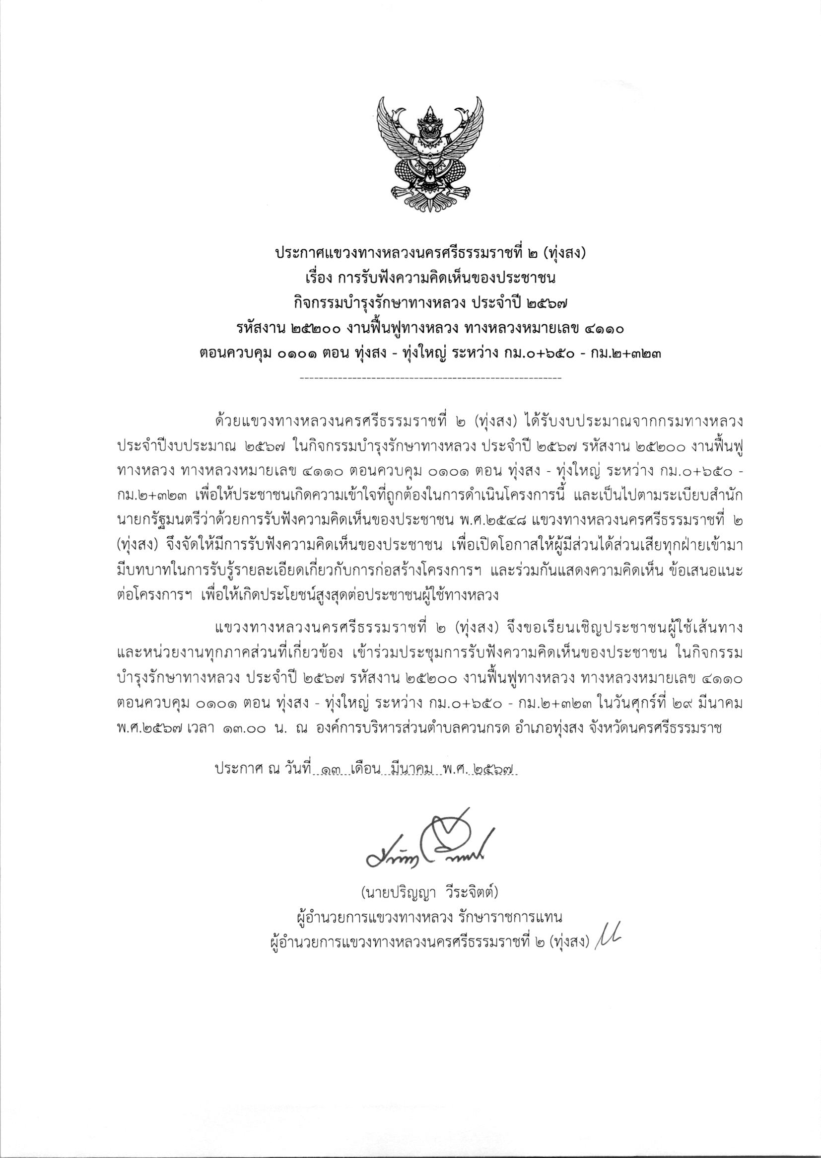 รับฟังความคิดเห็นของประชาชนในกิจกรรมบำรุงรักษาทางหลวง ประจำปี 2567 รหัสงาน 25200 งานฟื้นฟูทางหลวง ทางหลวงหมายเลข 4110 ตอนควบคุม 0101 ตอน ทุ่งสง - ทุ่งใหญ่ ระหว่าง กม.0+650 - กม.2+323