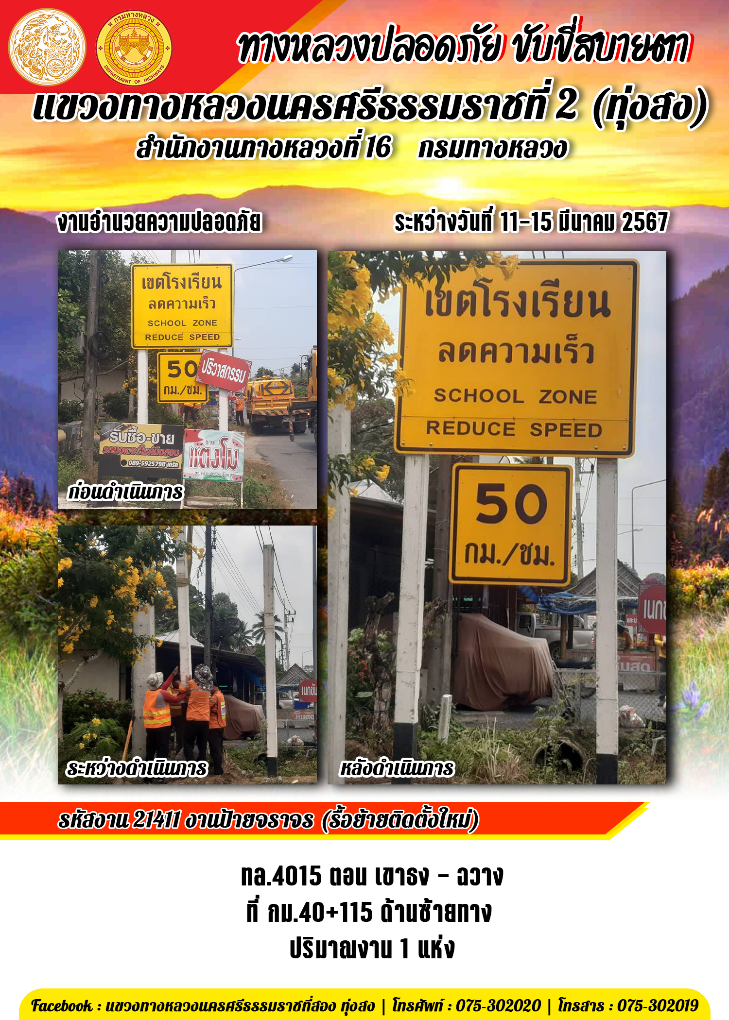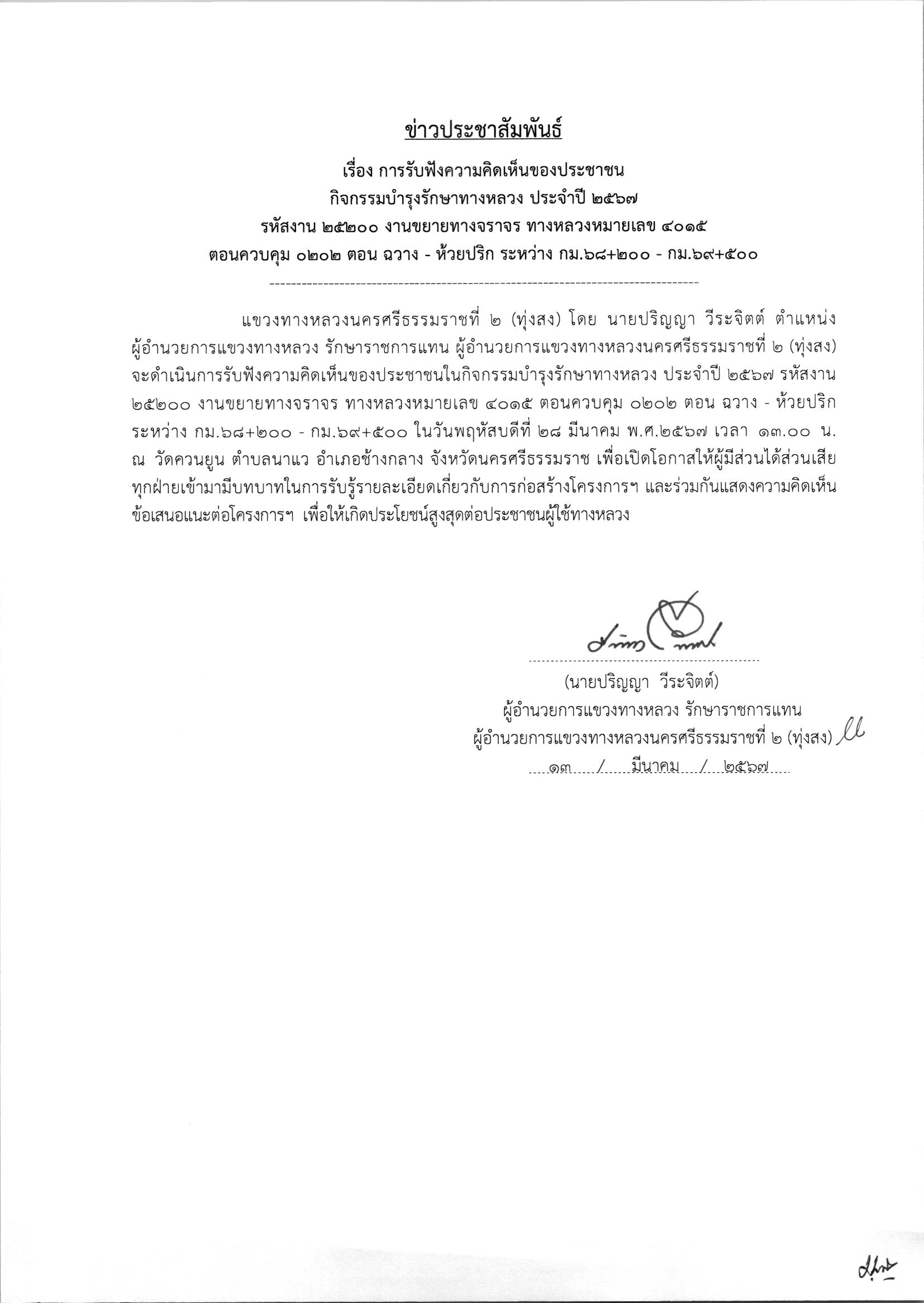รับฟังความคิดเห็นของประชาชนในกิจกรรมบำรุงรักษาทางหลวง ประจำปี 2567 รหัสงาน 25200 งานขยายทางจราจร ทางหลวงหมายเลข 4015 ตอนควบคุม 0202 ตอน ฉวาง - ห้วยปริก ระหว่าง กม.68+200 - กม.69+500