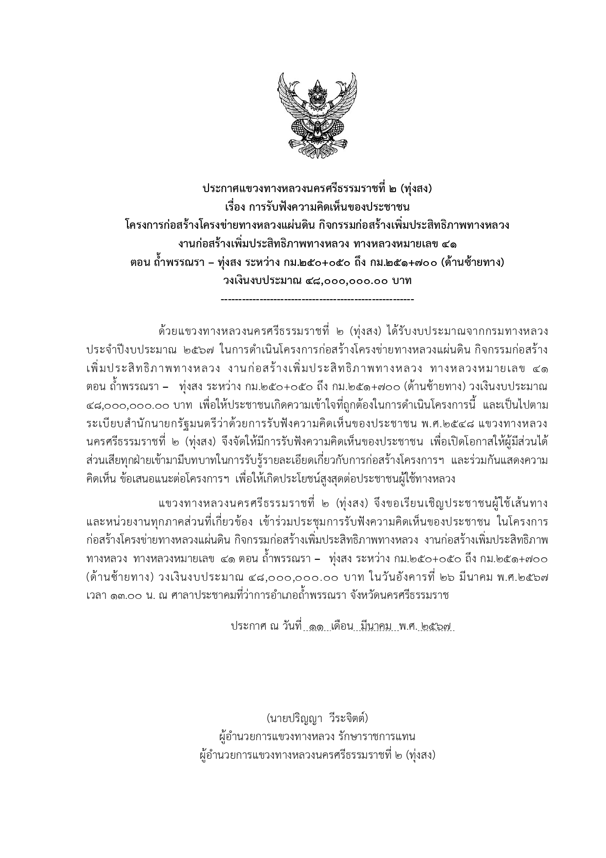 รับฟังความคิดเห็นของประชาชนในโครงการก่อสร้างโครงข่ายทางหลวงแผ่นดิน กิจกรรมก่อสร้าง เพิ่มประสิทธิภาพทางหลวง งานก่อสร้างเพิ่มประสิทธิภาพทางหลวง ทางหลวงหมายเลข 41 ตอน ถ้ำพรรณรา – ทุ่งสง ระหว่าง กม.250+050 ถึง กม.251+700 (ด้านซ้ายทาง) วงเงินงบประมาณ 48,000,000.00 บาท