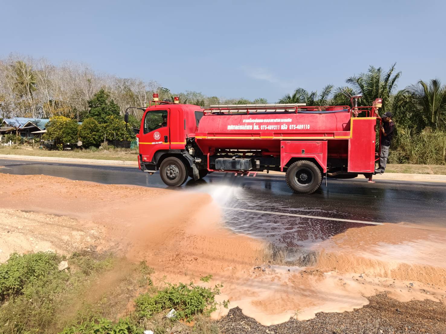 ดินหกเรี่ยราด ในทางหลวงหมายเลข 4019 ตอน ทุ่งใหญ่ - ช้างกลาง ระหว่าง กม.7+750 - กม.7+850 ด้านขวาทาง