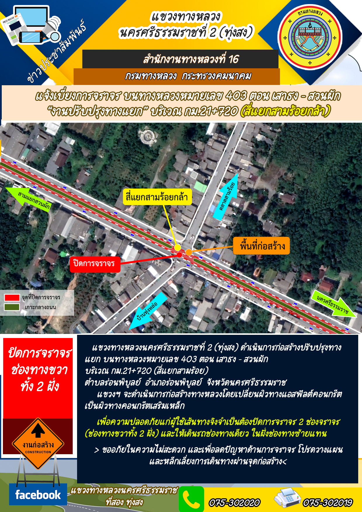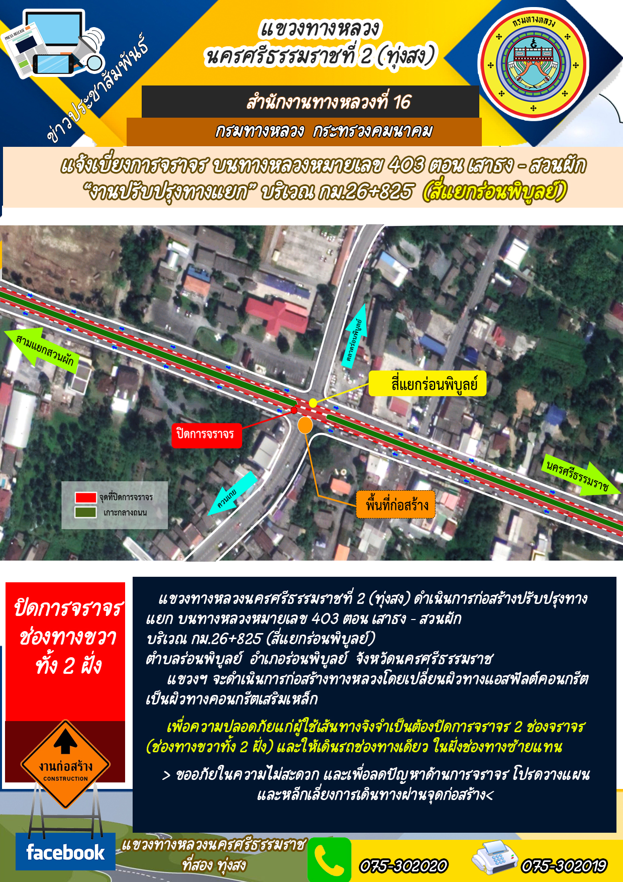 แจ้งเบี่ยงการจราจร ทล. 403 บริเวณ กม.26+825 (สี่แยกร่อนพิบูลย์)
