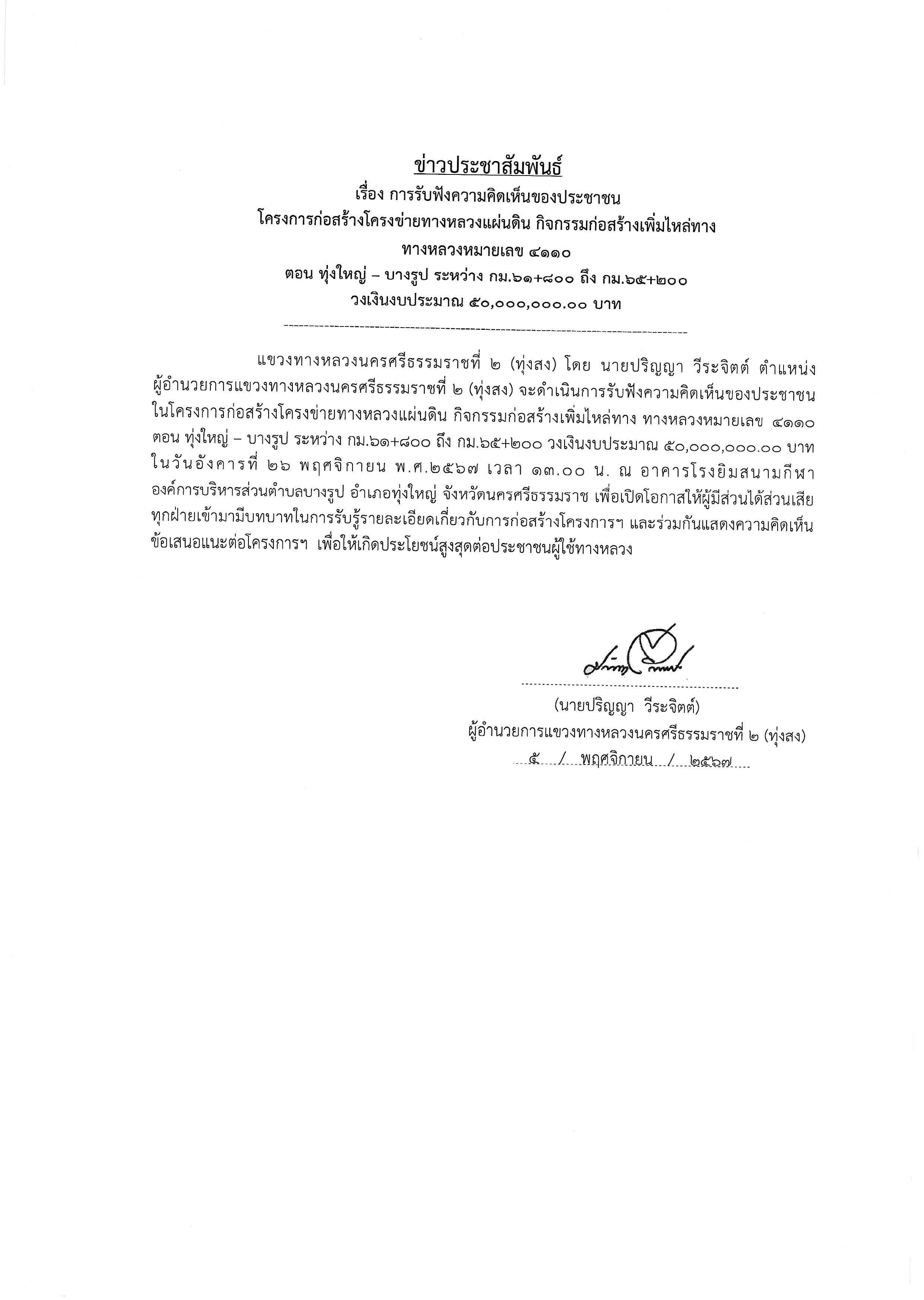 การรับฟังความคิดเห็นของประชาชน โครงการก่อสร้างโครงข่ายทางหลวงแผ่นดิน กิจกรรมก่อสร้างเพิ่มไหล่ทาง ทางหลวงหมายเลข 4110 ตอนควบคุม 0102 ตอน ทุ่งใหญ่ - บางรูป ระหว่าง กม.61+800 - กม.65+200