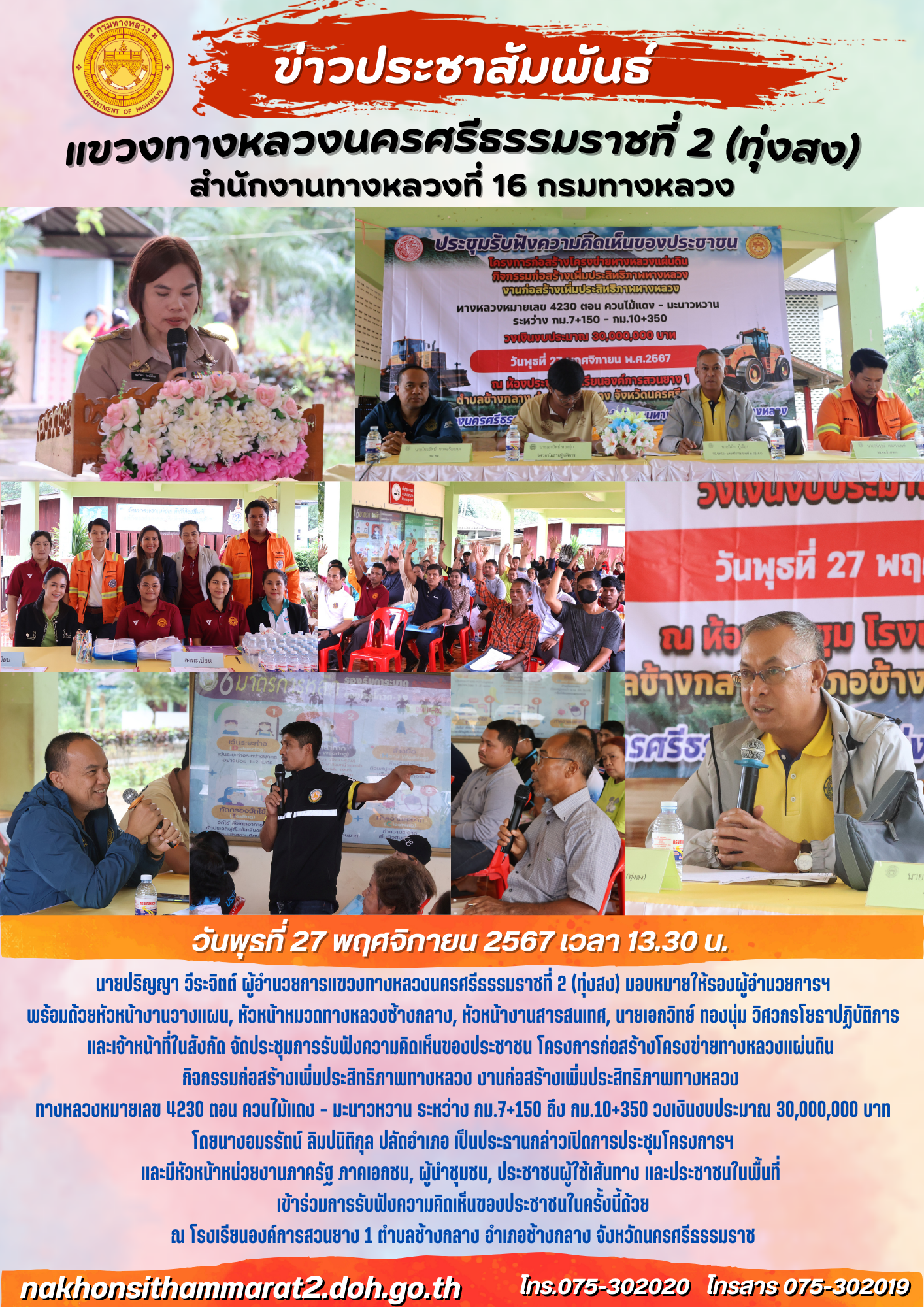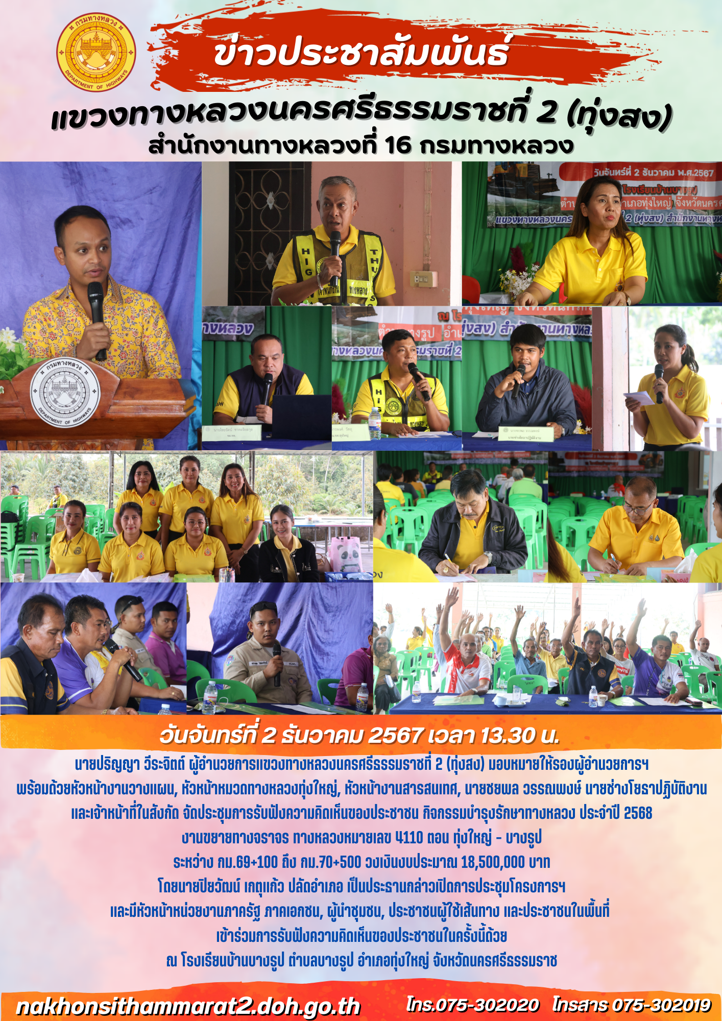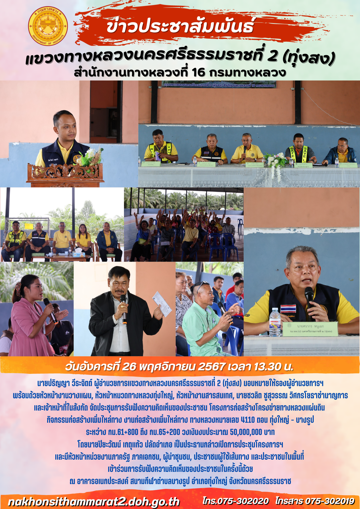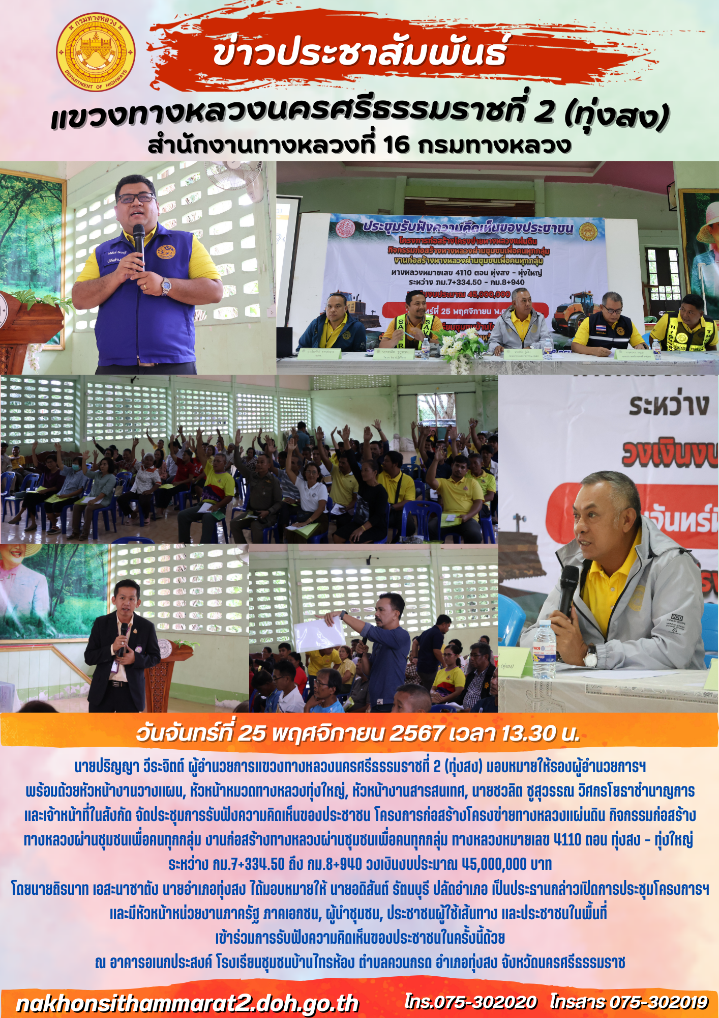 ประชุมการรับฟังความคิดเห็นของประชาชน โครงการก่อสร้างโครงข่ายทางหลวงแผ่นดิน กิจกรรมก่อสร้างทางหลวงผ่านชุมชนเพื่อคนทุกกลุ่ม งานก่อสร้างทางหลวงผ่านชุมชนเพื่อคนทุกกลุ่ม ทางหลวงหมายเลข 4110 ตอน ทุ่งสง - ทุ่งใหญ่ ระหว่าง กม.7+334.50 ถึง กม.8+940