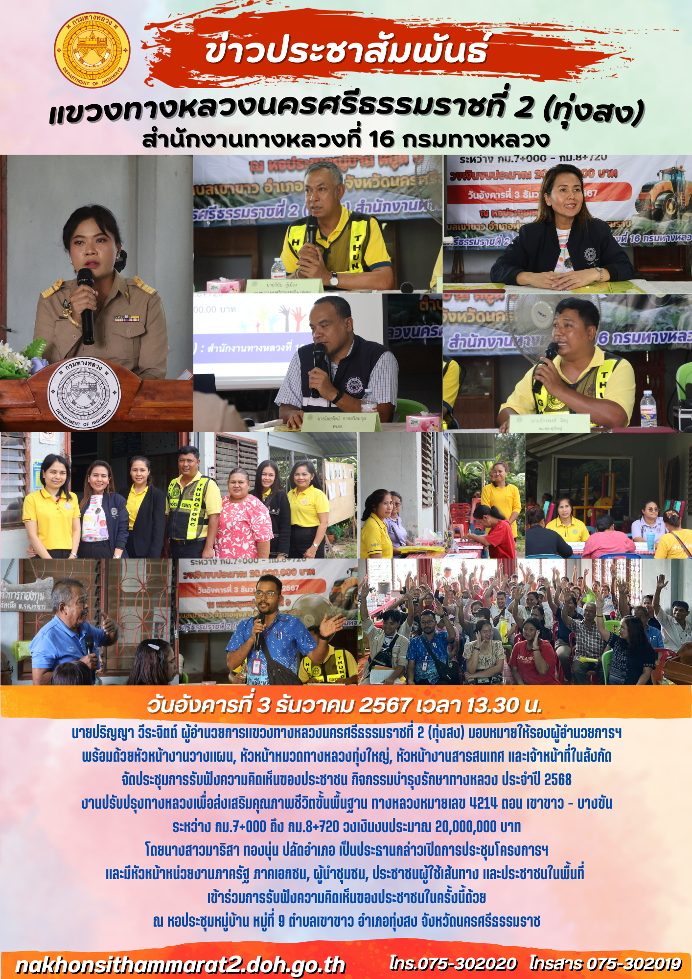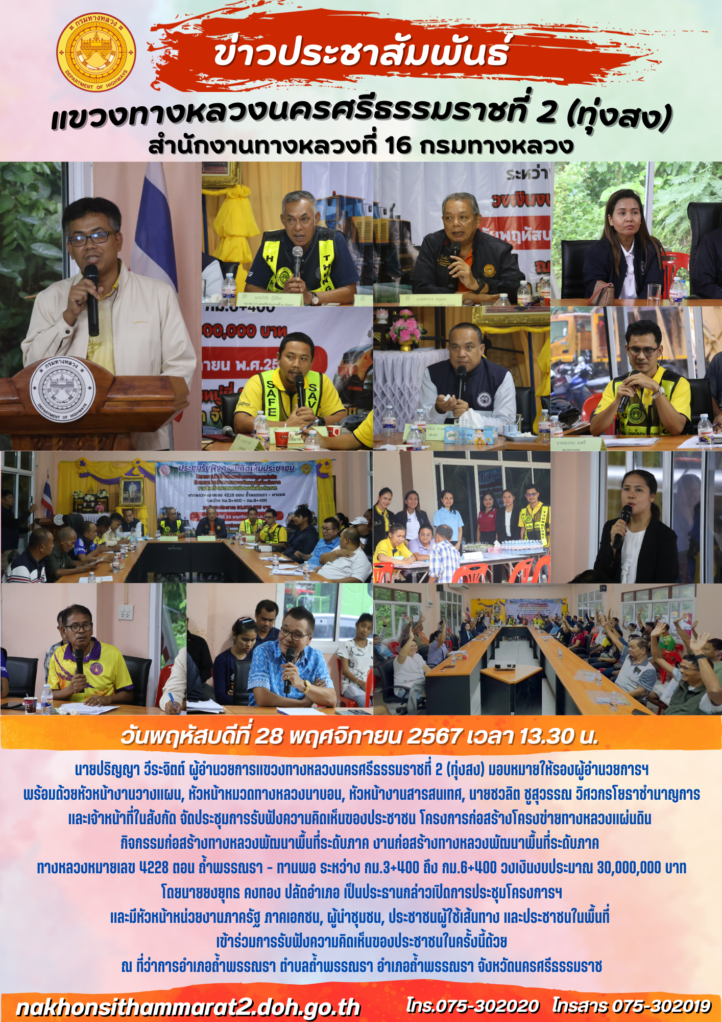 ประชุมการรับฟังความคิดเห็นของประชาชน กิจกรรมบำรุงรักษาทางหลวง ประจำปี 2568 งานปรับปรุงทางหลวงเพื่อส่งเสริมคุณภาพชีวิตขั้นพื้นฐาน ทางหลวงหมายเลข 4214 ตอน เขาขาว - บางขัน ระหว่าง กม.7+000 ถึง กม.8+720