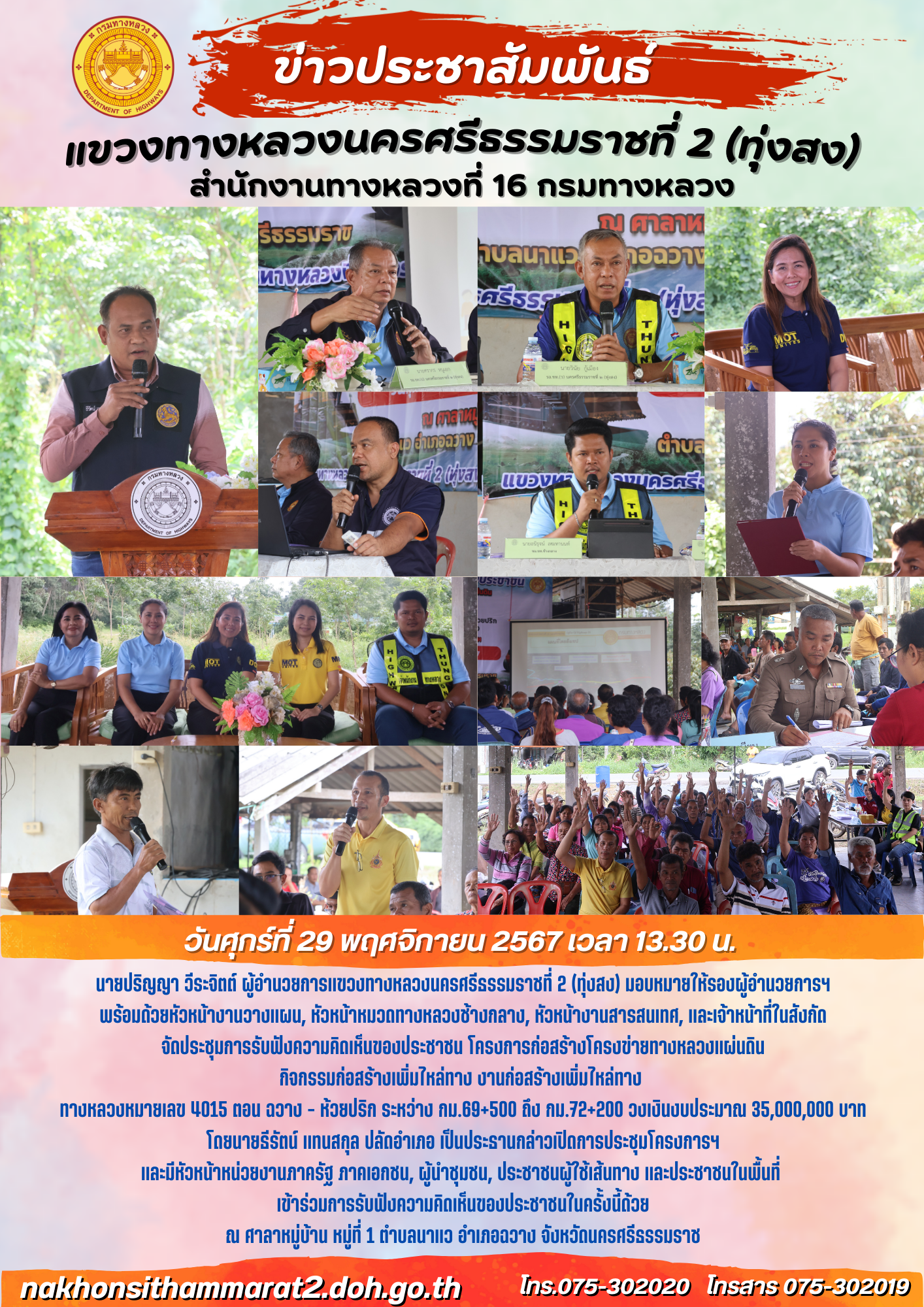 ประชุมการรับฟังความคิดเห็นของประชาชน โครงการก่อสร้างโครงข่ายทางหลวงแผ่นดิน กิจกรรมก่อสร้างเพิ่มไหล่ทาง งานก่อสร้างเพิ่มไหล่ทาง ทางหลวงหมายเลข 4015 ตอน ฉวาง - ห้วยปริก ระหว่าง กม.69+500 ถึง กม.72+200