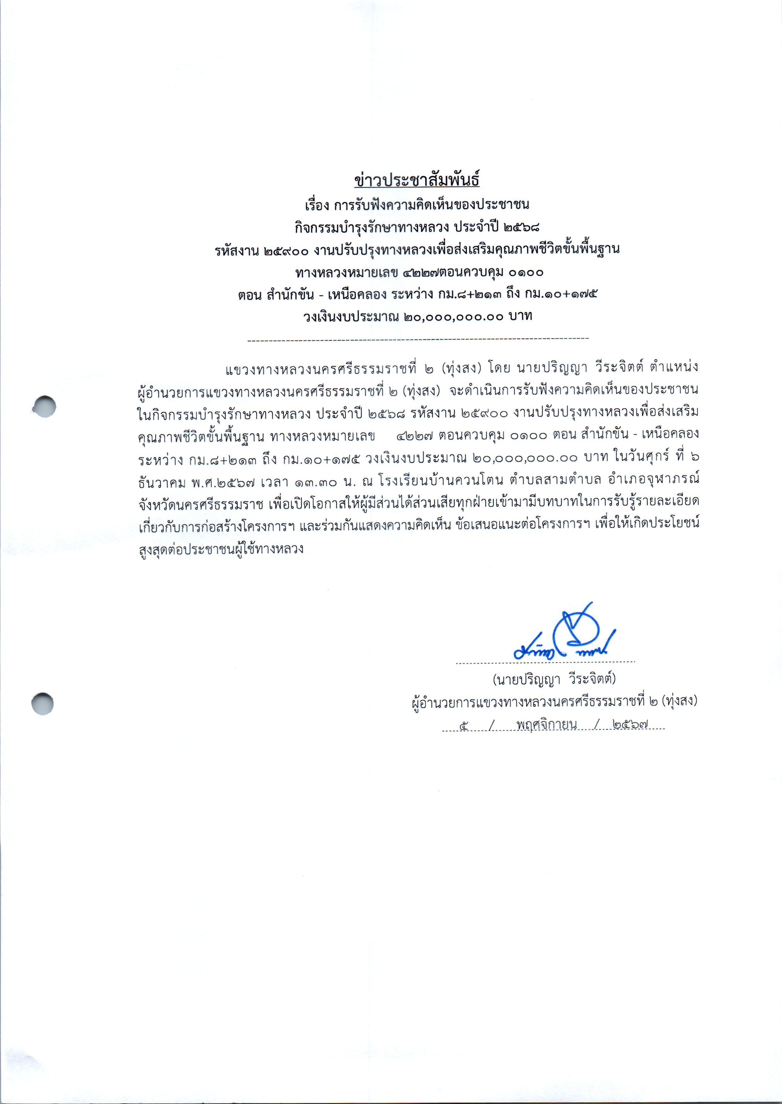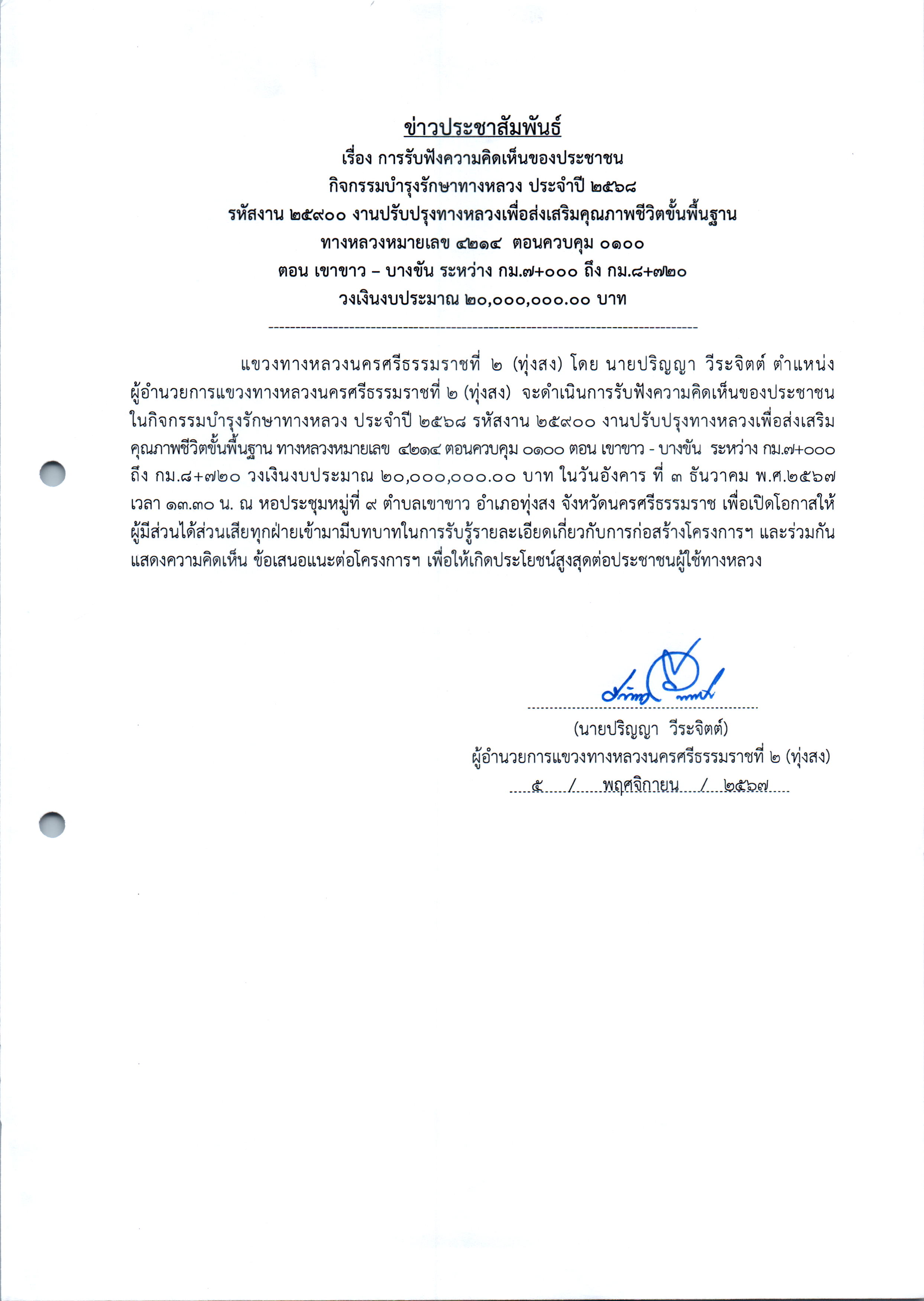 การรับฟังความคิดเห็นของประชาชน ในกิจกรรมบำรุงรักษาทางหลวงประจำปี 2568 รหัสงาน 25900 งานปรับปรุงทางหลวงเพื่อส่งเสริมคุณภาพชีวิตขั้นพื้นฐาน ทางหลวงหมายเลข 4214 ตอนควบคุม 0100 ตอน เขาขาว - บางขัน ระหว่าง กม.7+000 ถึง กม.8+720