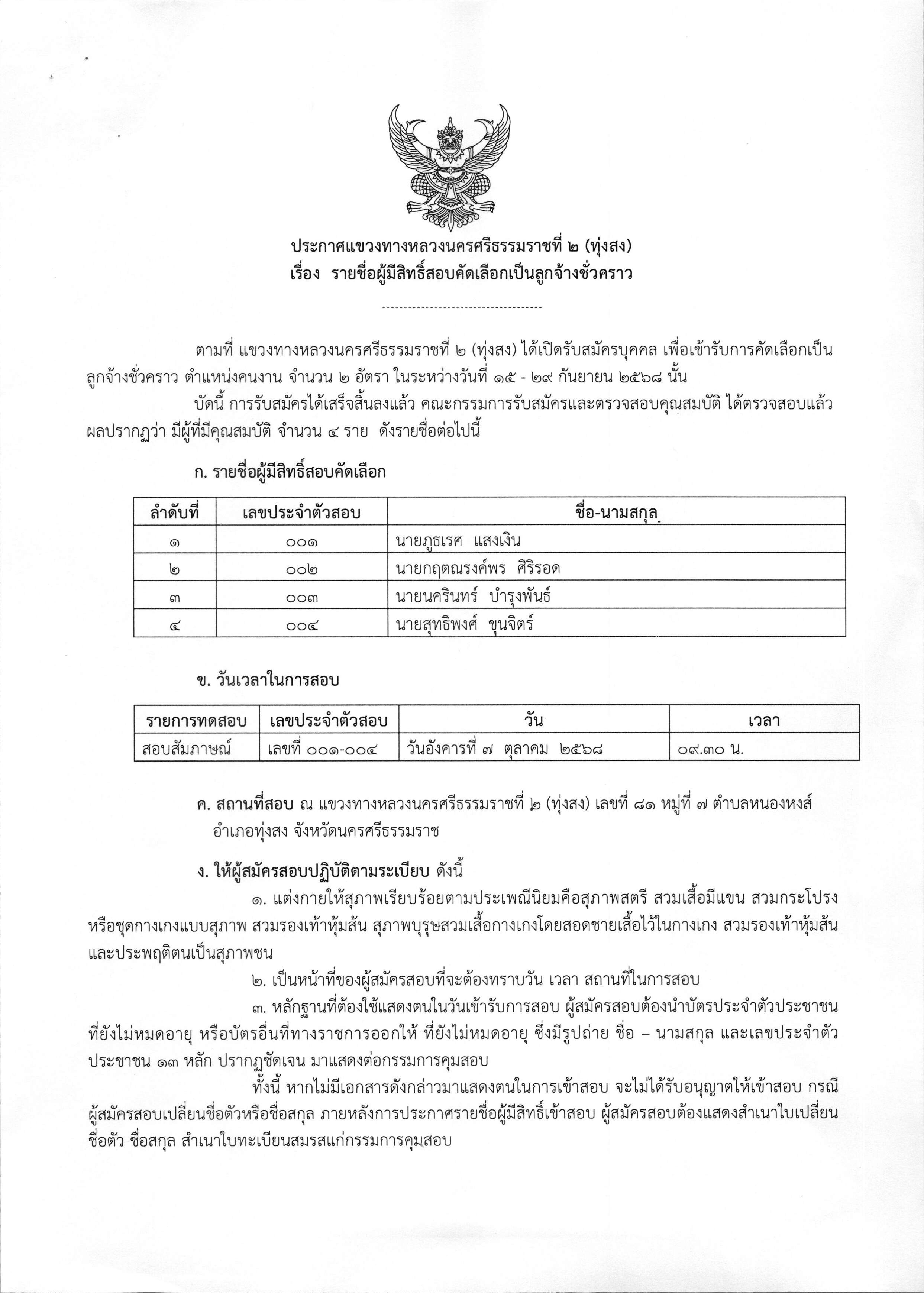 รายชื่อผู้มีสิทธิ์สอบคัดเลือกเป็นลูกจ้างชั่วคราว