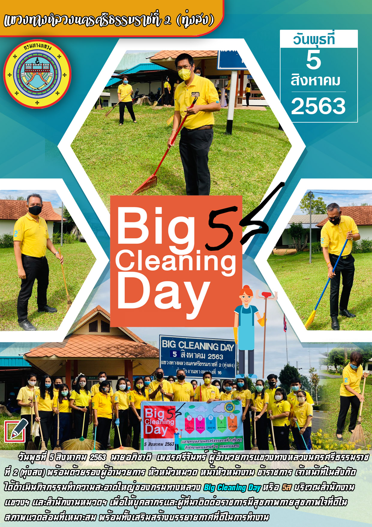 วันพุธที่ 5 สิงหาคม 2563 นายอภิชาติ เพชรศรีจันทร์ ผู้อำนวยการแขวงทางหลวงนครศรีธรรมราชที่ 2 (ทุ่งสง) พร้อมด้วยรองผู้อำนวยการ หัวหน้าหมวด หัวหน้างาน ข้าราชการ เจ้าหน้าที่ในสังกัด ได้ดำเนินกิจกรรมทำความสะอาดใหญ่ของกรมทางหลวง Big Cleaning Day หรือ 5ส บริเวณสำนักงานแขวงฯ และสำนักงานหมวดฯ เพื่อให้บุคลากรและผู้ที่มาติดต่อราชการมีสุขภาพกายสุขภาพใจที่ดีในสภาพแวดล้อมที่เหมาะสม พร้อมทั้งเสริมสร้างบรรยายกาศที่ดีในการทำงาน