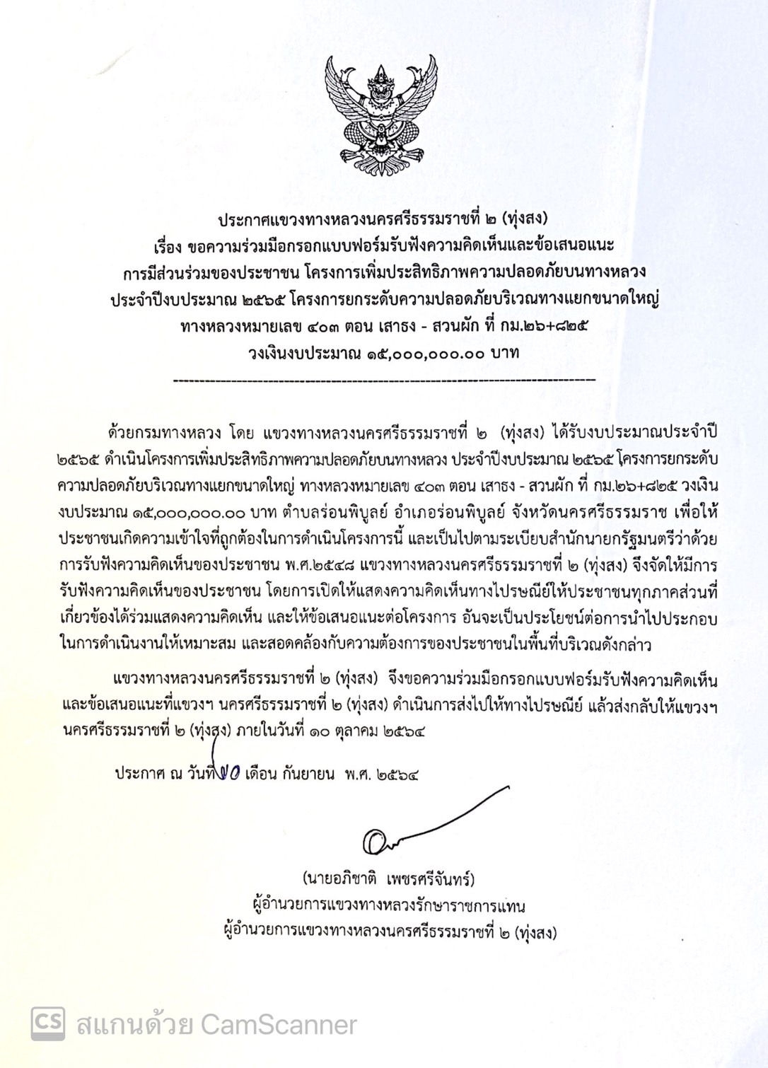 นายอภิชาติ เพชรศรีจันทร์ ตำแหน่ง ผู้อำนวยการแขวงทางหลวง รักษาราชการแทน ผู้อำนวยการแขวงทางหลวงนครศรีธรรมราชที่ 2 (ทุ่งสง) จะดำเนินการ รับฟังความคิดเห็นของประชาชนในโครงการการมีส่วนร่วมของประชาชนทางไปรษณีย์ ระหว่างวันที่ 20 กันยายน 2564 – วันที่ 10 ตุลาคม 2564 โครงการเพิ่มประสิทธิภาพความปลอดภัยบนทางหลวง ประจำปีงบประมาณ 2565 โครงการยกระดับความปลอดภัยบริเวณทางแยกขนาดใหญ่ ทางหลวงหมายเลข 403 ตอน เสาธง - สวนผัก ที่ กม.26+825 วงเงินงบประมาณ 15,000,000.00 บาท ตำบลร่อนพิบูลย์ อำเภอร่อนพิบูลย์ จังหวัดนครศรีธรรมราช เพื่อเปิดโอกาสให้ผู้มีส่วนได้ส่วนเสียทุกฝ่ายเข้ามามีบทบาทในการรับรู้ แสดงความคิดเห็นอย่างกว้างขวาง และนำข้อมูลที่ได้รับมาใช้ประโยชน์ในโครงการได้อย่างเหมาะสม และเกิดประโยชน์สูงสุดต่อประชาชนบริเวณดังกล่าว