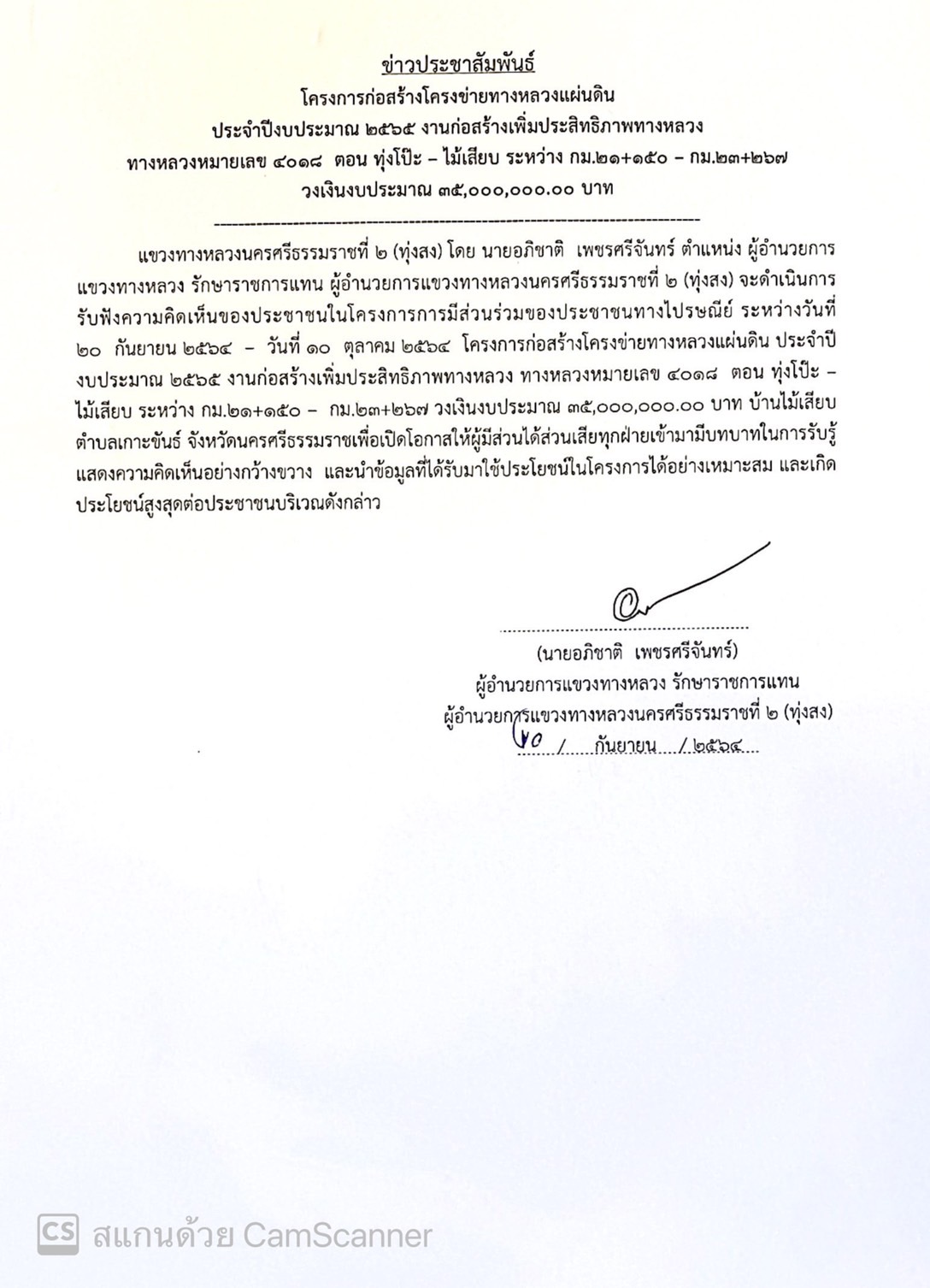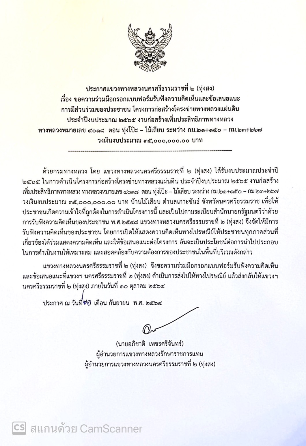 แขวงทางหลวงนครศรีธรรมราชที่ 2 (ทุ่งสง) โดย นายอภิชาติ เพชรศรีจันทร์ ตำแหน่ง ผู้อำนวยการแขวงทางหลวง รักษาราชการแทน ผู้อำนวยการแขวงทางหลวงนครศรีธรรมราชที่ 2 (ทุ่งสง) จะดำเนินการ รับฟังความคิดเห็นของประชาชนในโครงการการมีส่วนร่วมของประชาชนทางไปรษณีย์ ระหว่างวันที่ 20 กันยายน 2564 – วันที่ 10 ตุลาคม 2564 โครงการก่อสร้างโครงข่ายทางหลวงแผ่นดิน ประจำปีงบประมาณ 2565 งานก่อสร้างเพิ่มประสิทธิภาพทางหลวง ทางหลวงหมายเลข 4018 ตอน ทุ่งโป๊ะ – ไม้เสียบ ระหว่าง กม.21+150 – กม.23+267 วงเงินงบประมาณ 35,000,000.00 บาท บ้านไม้เสียบ ตำบลเกาะขันธ์ จังหวัดนครศรีธรรมราชเพื่อเปิดโอกาสให้ผู้มีส่วนได้ส่วนเสียทุกฝ่ายเข้ามามีบทบาทในการรับรู้ แสดงความคิดเห็นอย่างกว้างขวาง และนำข้อมูลที่ได้รับมาใช้ประโยชน์ในโครงการได้อย่างเหมาะสม และเกิดประโยชน์สูงสุดต่อประชาชนบริเวณดังกล่าว