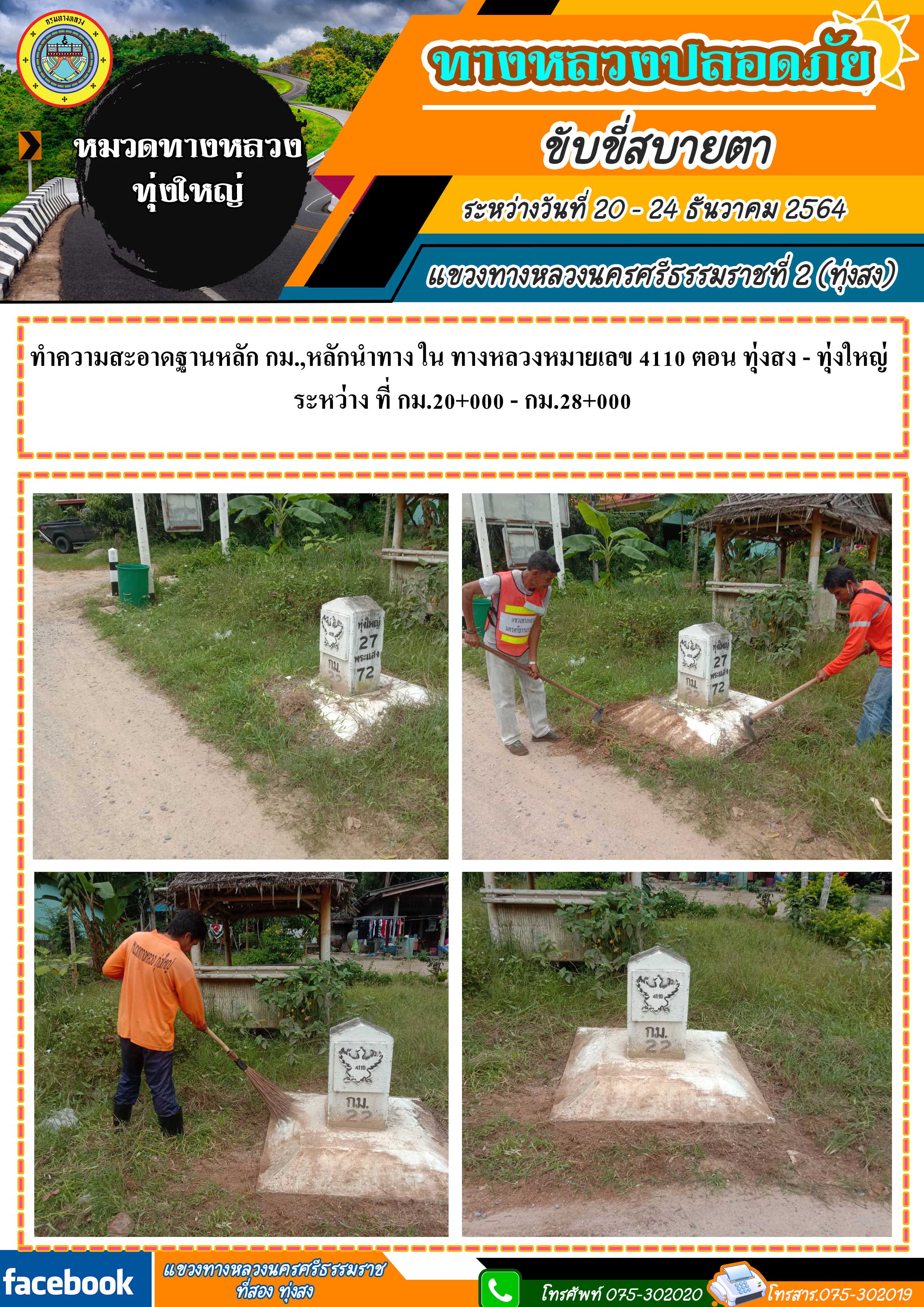 ทางหลวงปลอดภัย ขับขี่สบายตา ผลการปฏิบัติงานประจำสัปดาห์ของแขวงทางหลวงนครศรีธรรมราชที่ 2 (ทุ่งสง) ระหว่างวันที่ 20 - 24 ธันวาคม 2564 โดยหมวดทางหลวงและหน่วยงานในสังกัด