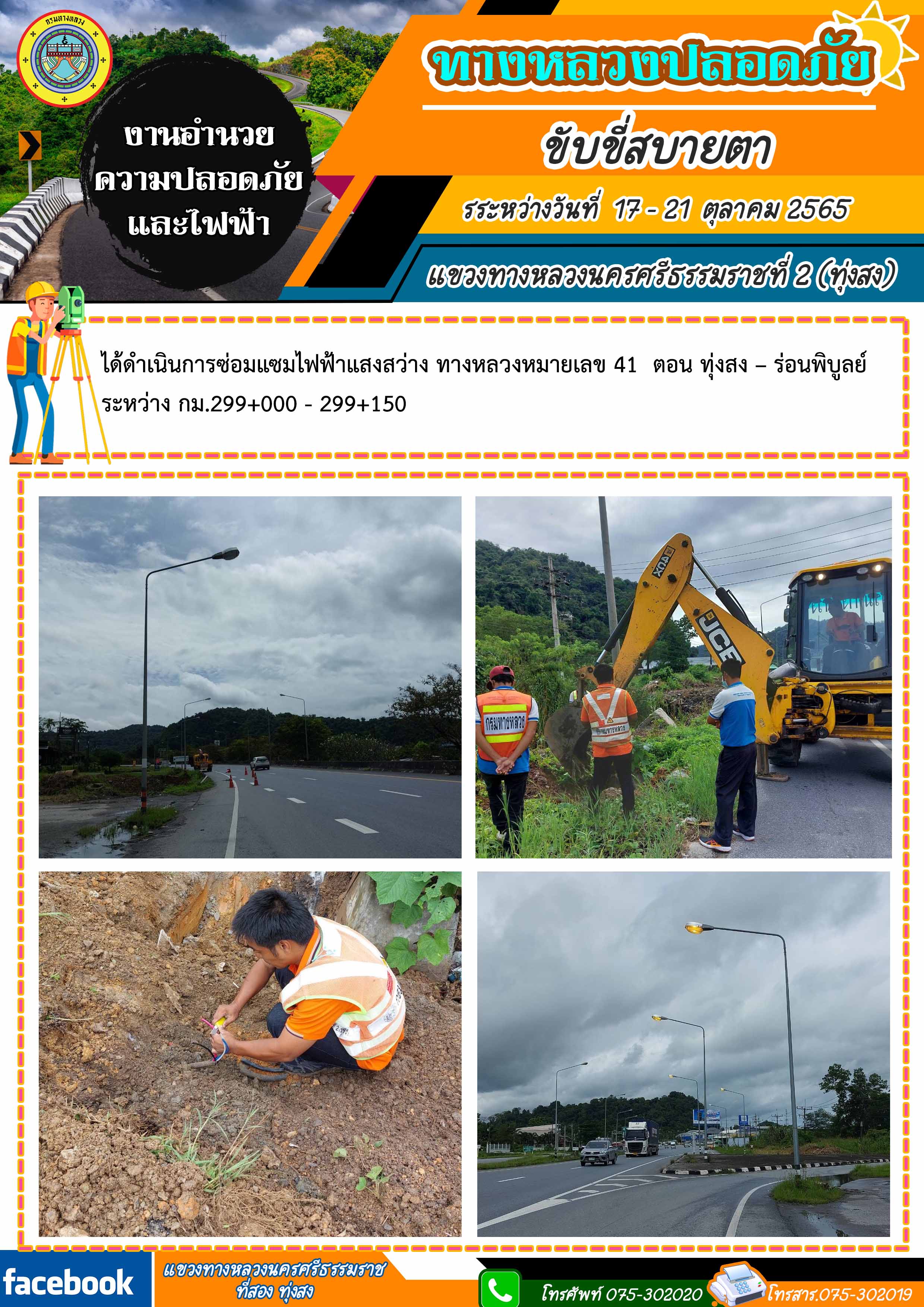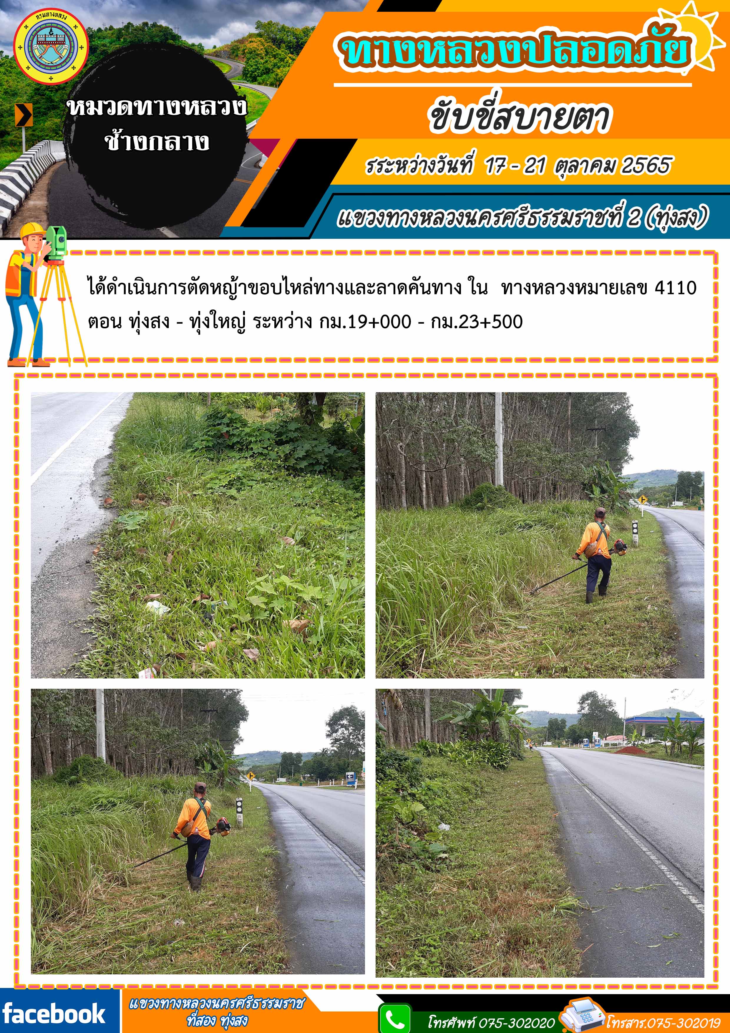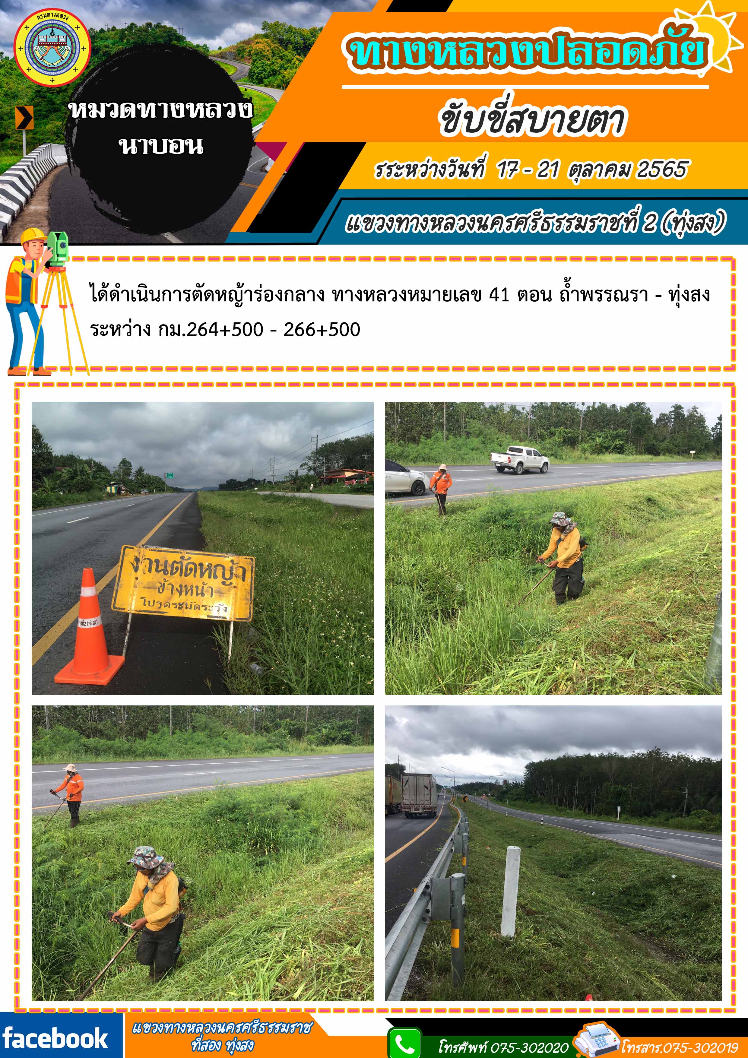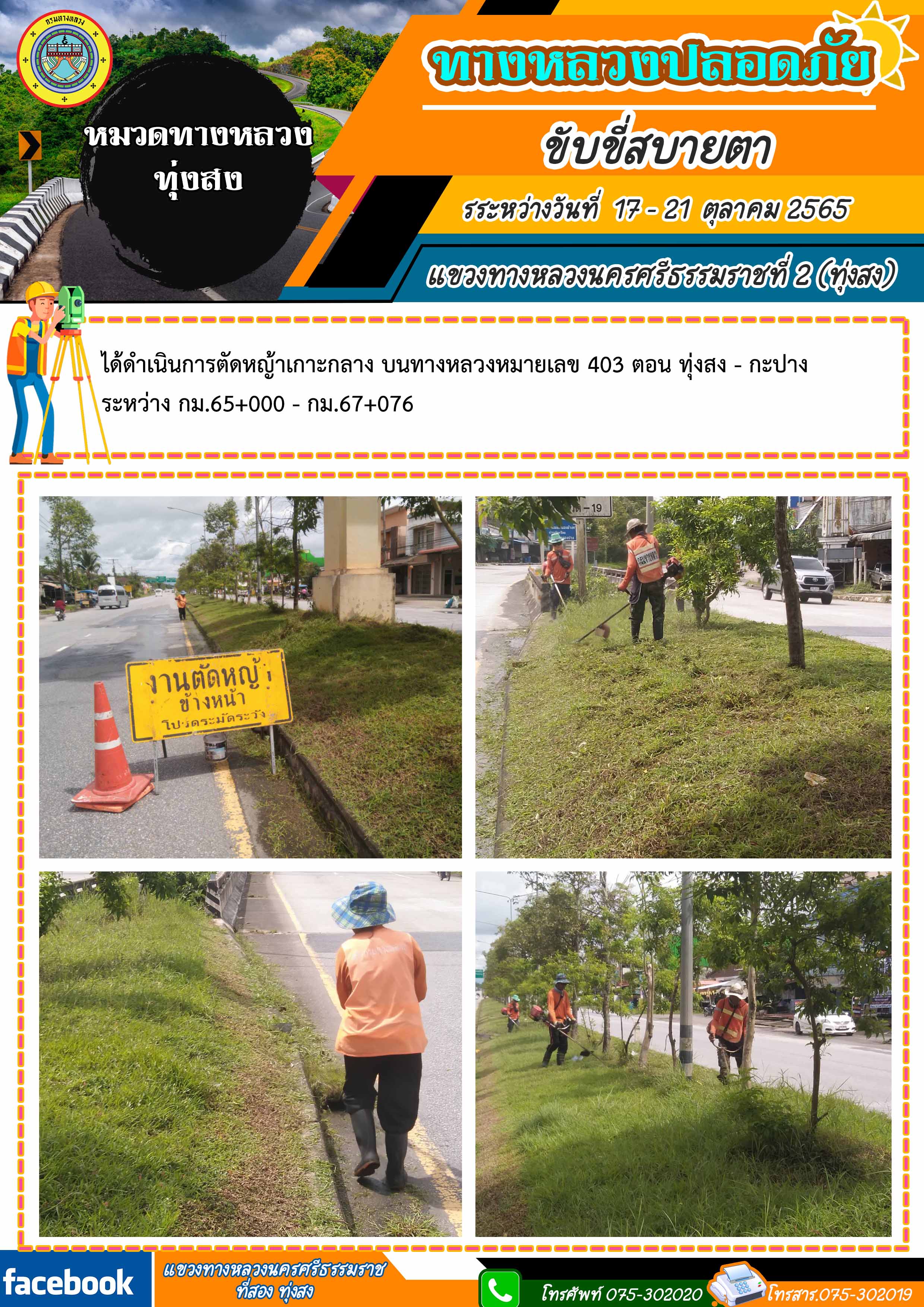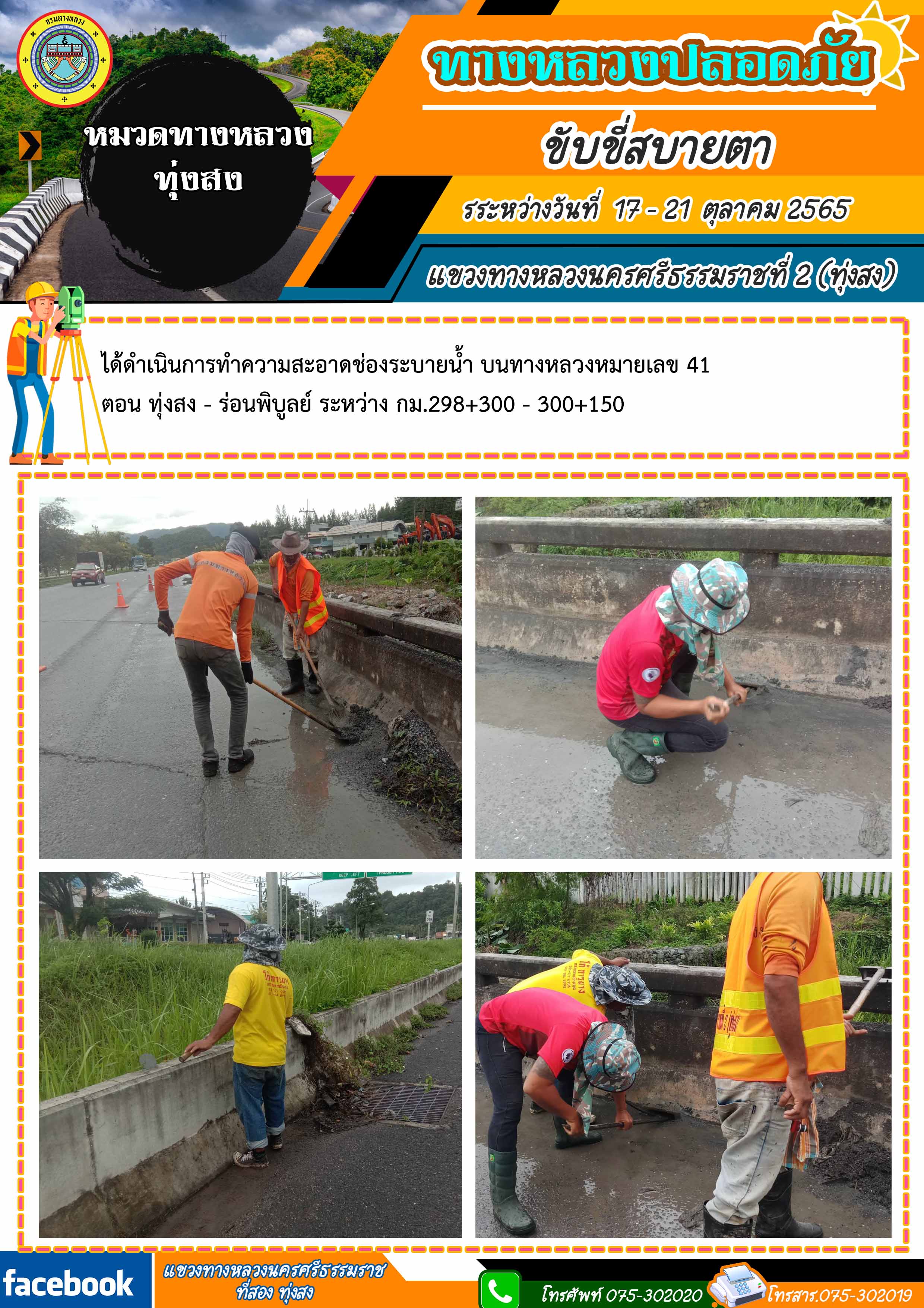 ทางหลวงปลอดภัย ขับขี่สบายตา ผลการปฏิบัติงานประจำสัปดาห์ของแขวงทางหลวงนครศรีธรรมราชที่ 2 (ทุ่งสง) ระหว่างวันที่ 17 -21 ตุลาคม 2565 โดยหมวดทางหลวงและหน่วยงานในสังกัด