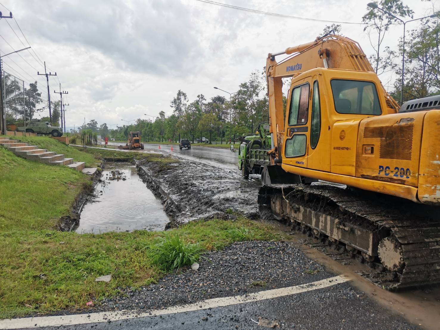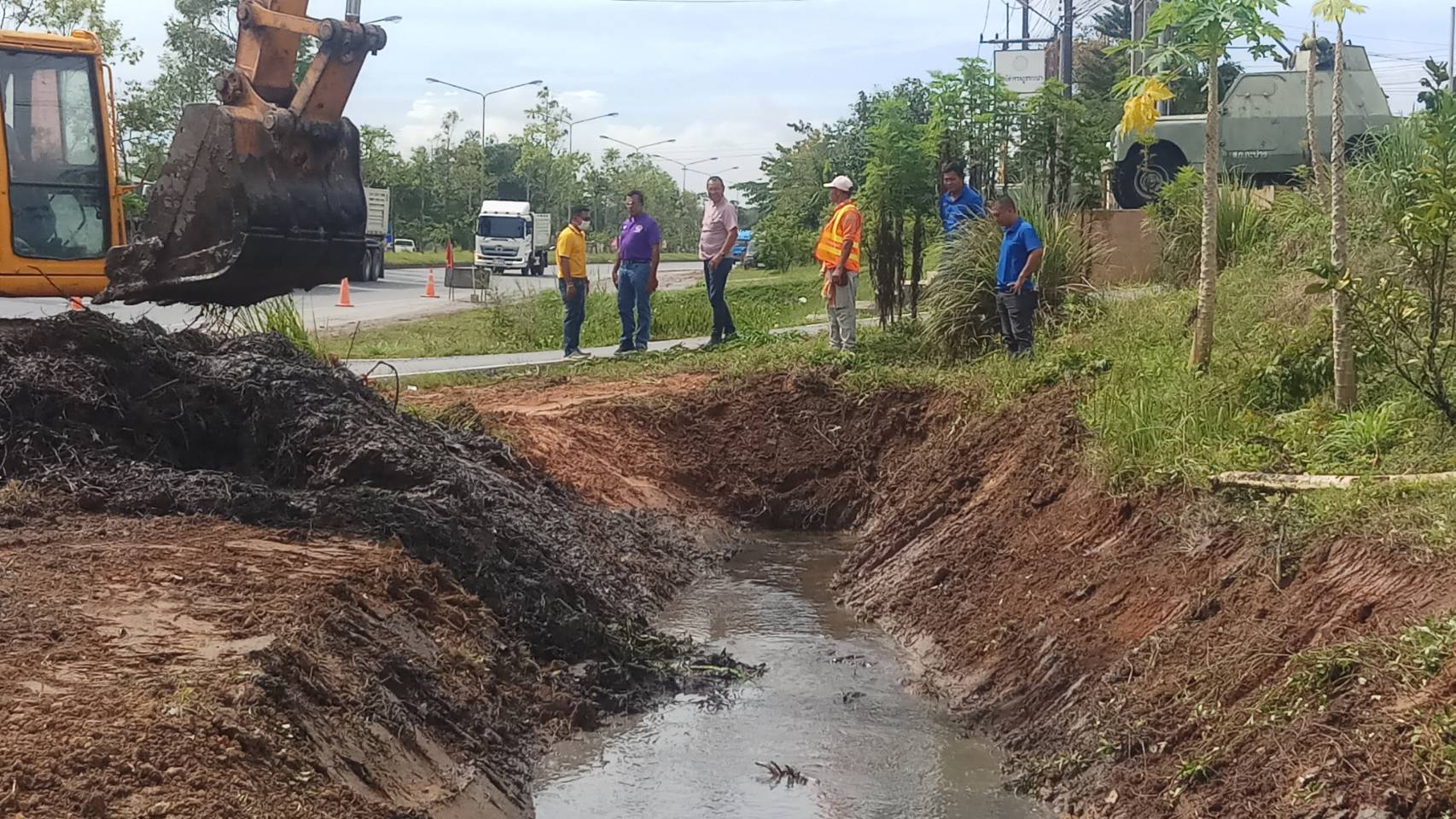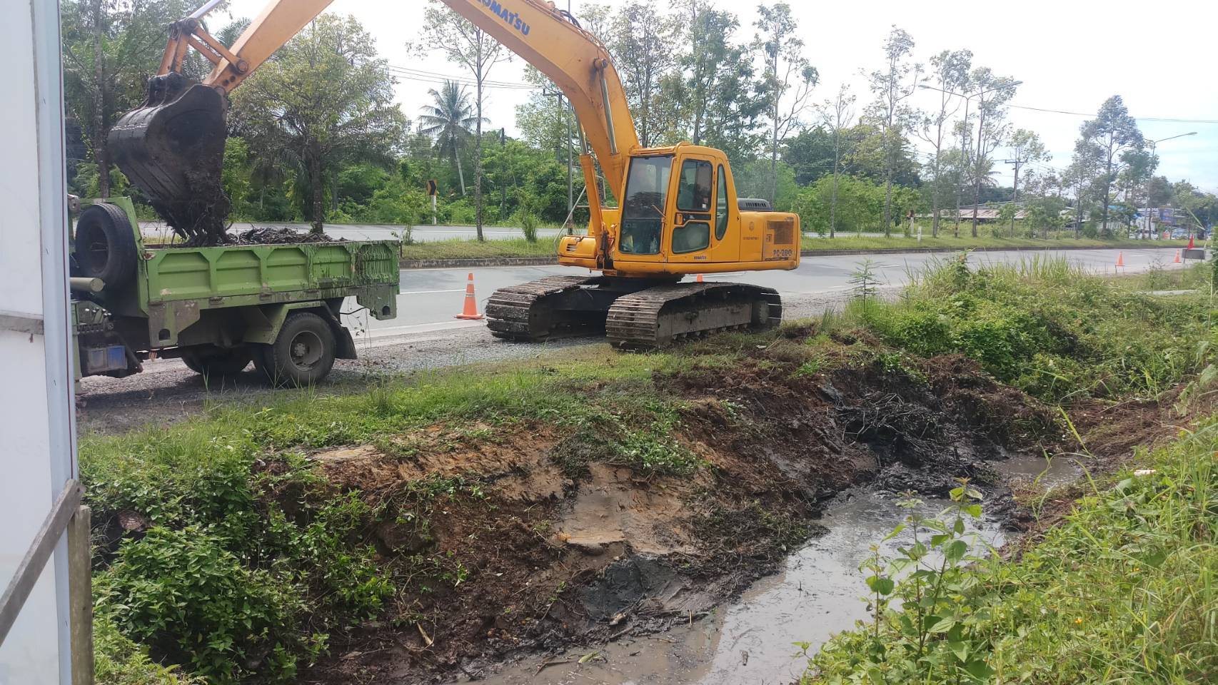 หมวดทางหลวงทุ่งสง ร่วมกับ องค์การบริหารส่วนจังหวัดนครศรีธรรมราช และเทศบาลตำบลกะปาง ร่วมกันแก้ปัญหาระบบระบายน้ำ, กวาดเกลี่ยไหลทาง, คันทาง และขุดลอกทางระบายน้ำ ในทางหลวงหมายเลข 403 ตอน ทุ่งสง - กะปาง ระหว่าง กม.63+ 300 - 63+600 ด้านขวาทาง