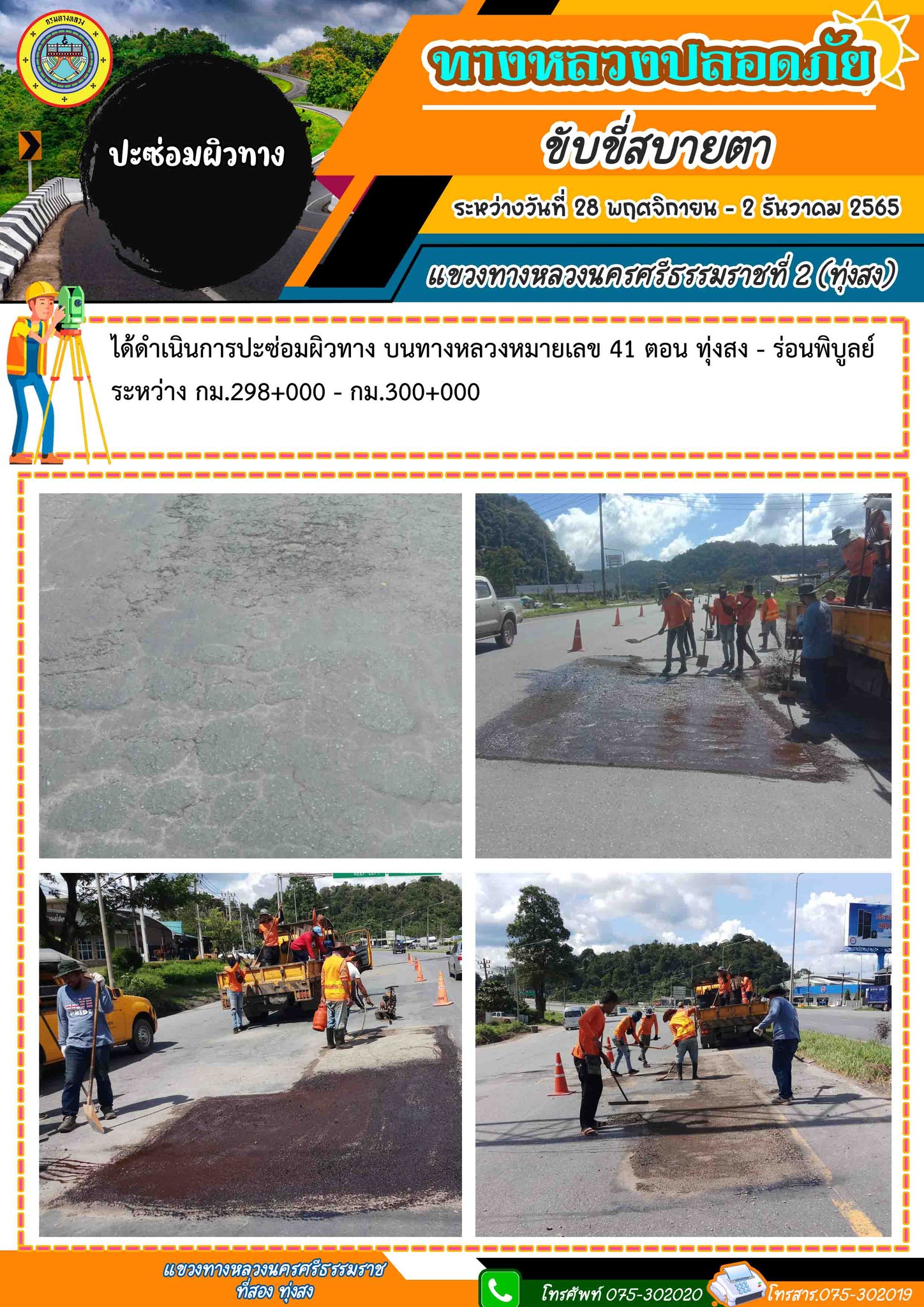 ผลการปฏิบัติงานของหมวดทางหลวงในสังกัด และหน่วยงานของแขวงทางหลวงนครศรีธรรมราชที่ 2 (ทุ่งสง) ระหว่าง วันที่ 28 พฤศจิกายน - 2 ธันวาคม 2565