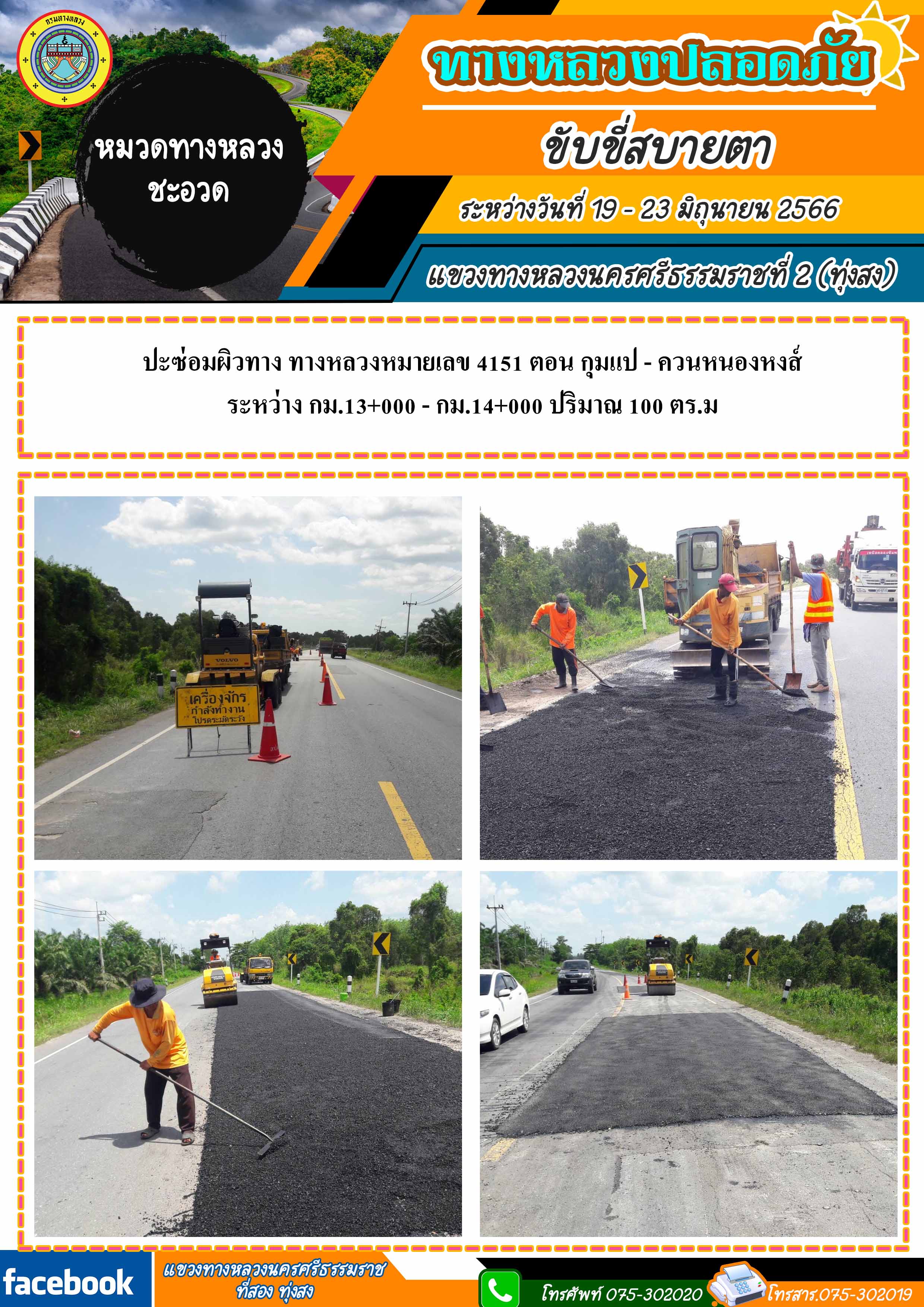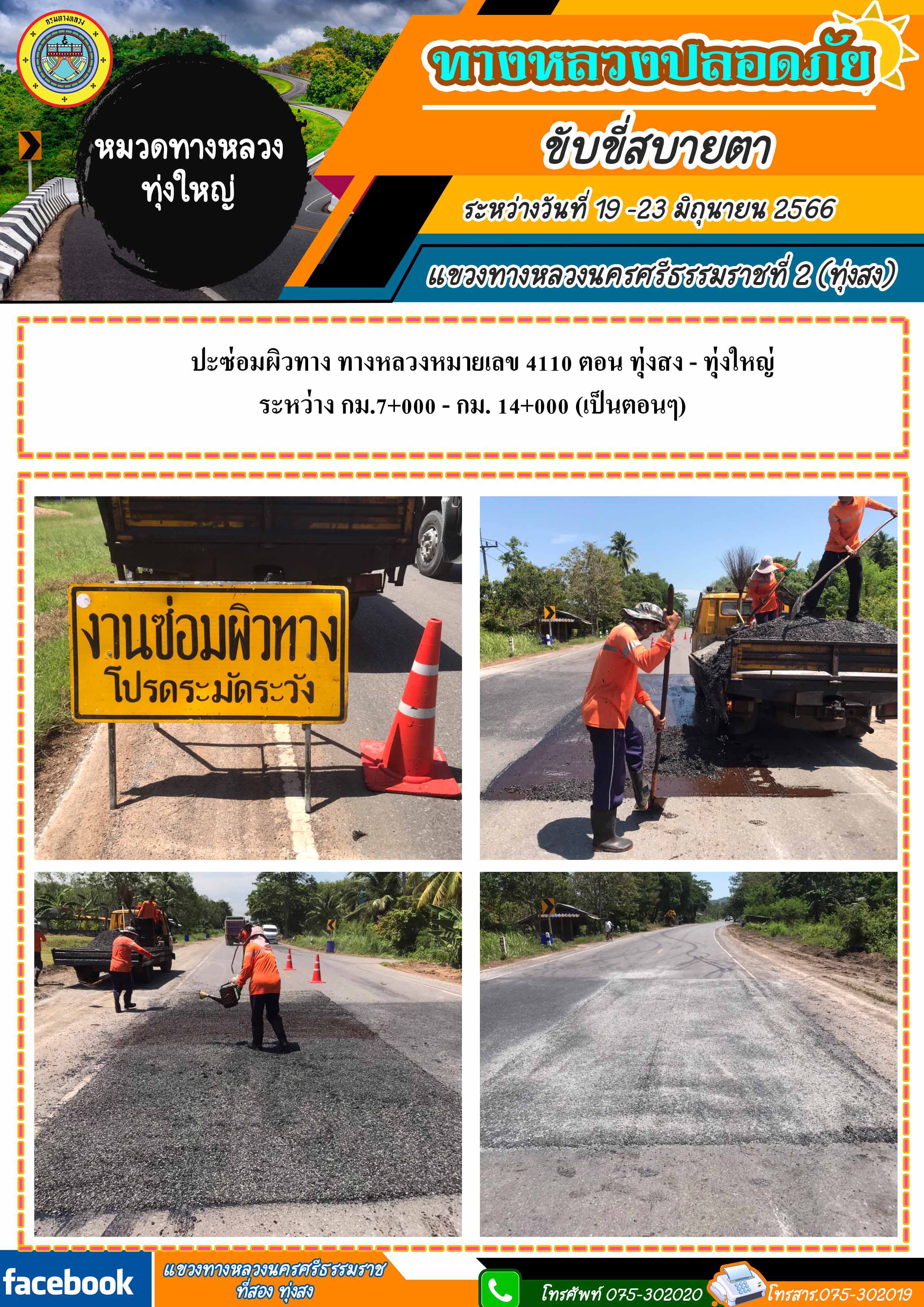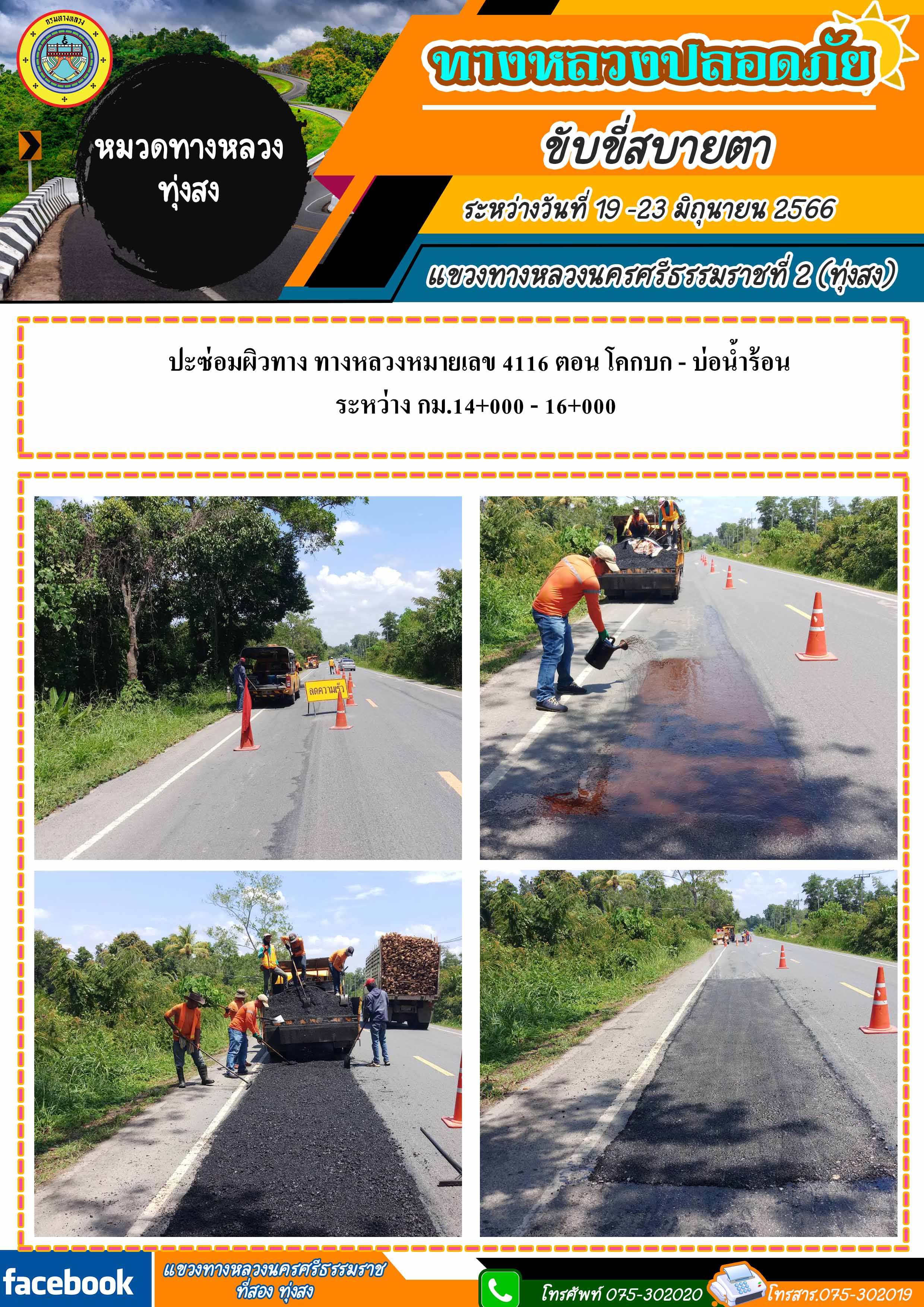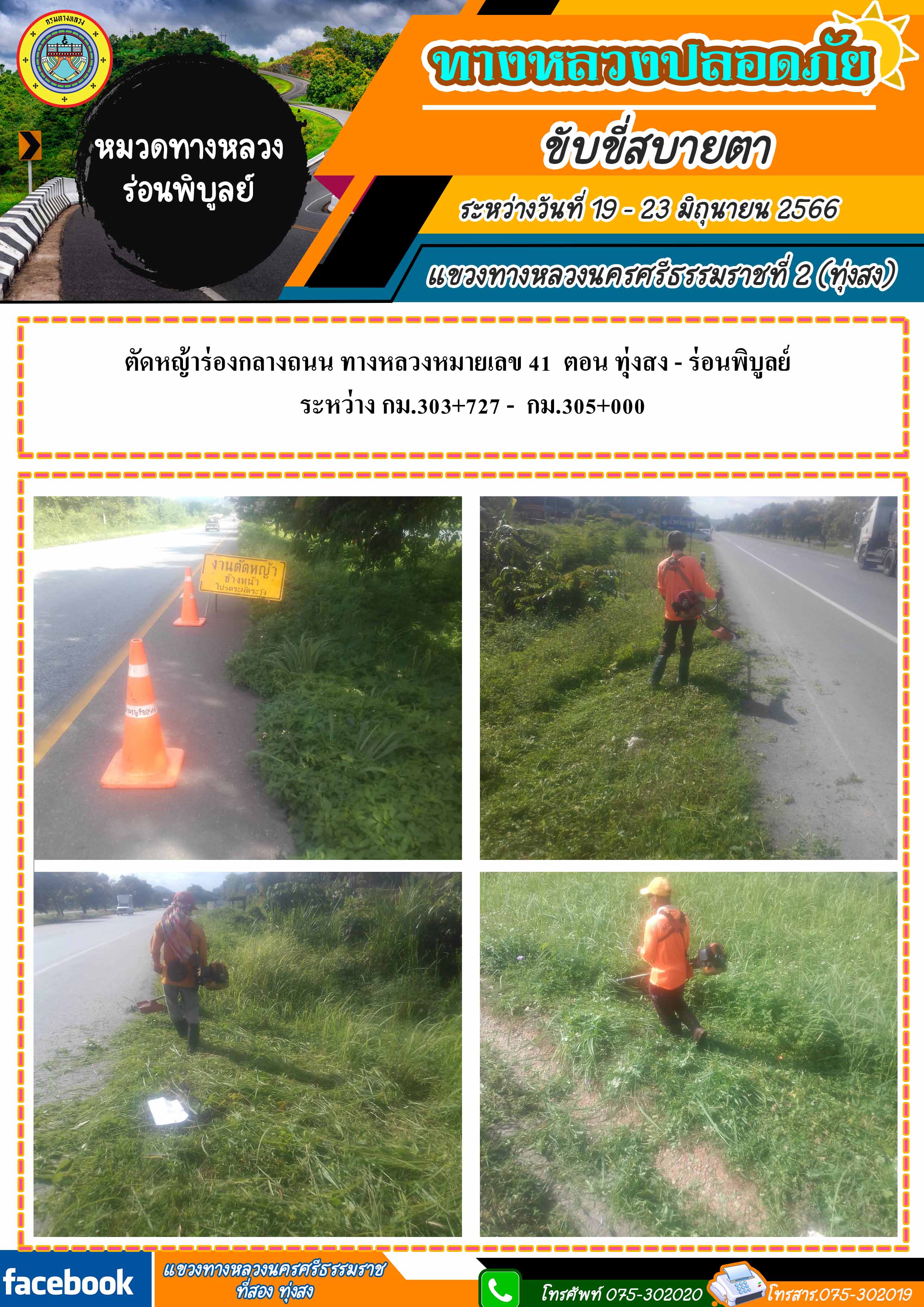 ทางหลวงปลอดภัย ขับขี่สบายตา ผลการปฏิบัติงานประจำสัปดาห์ของแขวงทางหลวงนครศรีธรรมราชที่ 2 (ทุ่งสง) ระหว่างวันที่ 19 - 23 มิถุนายน 2566 โดยหมวดทางหลวงและหน่วยงานในสังกัด