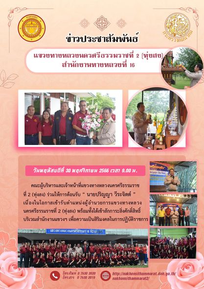 คณะผู้บริหารและเจ้าหน้าที่แขวงทางหลวงนครศรีธรรมราชที่ 2 (ทุ่งสง) ร่วมให้การต้อนรับ “ นายปริญญา วีระจิตต์ ” เนื่องในโอกาสเข้ารับตำแหน่งผู้อำนวยการแขวงทางหลวงนครศรีธรรมราชที่ 2 (ทุ่งสง) พร้อมทั้งได้เข้าสักการะสิ่งศักดิ์สิทธิ์บริเวณสำนักงานแขวงฯ เพื่อความเป็นสิริมงคลในการปฏิบัติราชการ