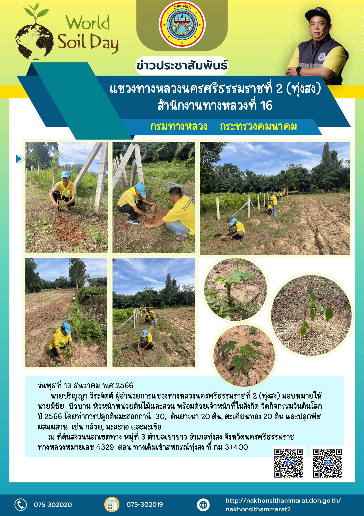 วันพุธที่ 13 ธันวาคม พ.ศ.2566 นายปริญญา วีระจิตต์ ผู้อำนวยการแขวงทางหลวงนครศรีธรรมราชที่ 2 (ทุ่งสง) มอบหมายให้ นายมีชัย บัวบาน หัวหน้าหน่วยต้นไม้และสวน พร้อมด้วยเจ้าหน้าที่ในสังกัด จัดกิจกรรมวันดินโลกปี 2566 โดยทำการปลูกต้นมะฮอกกานี 30, ต้นยางนา 20 ต้น, ตะเคียนทอง 20 ต้น และปลูกพืช ผสมผสาน เช่น กล้วย, มะละกอ และมะเขือ ณ ที่ดินสงวนนอกเขตทาง หมู่ที่ 3 ตำบลเขาขาว อำเภอทุ่งสง จังหวัดนครศรีธรรมราช ทางหลวงหมายเลข 4329 ตอน ทางเดิมเข้าสหกรณ์ทุ่งสง ที่ กม 3+400