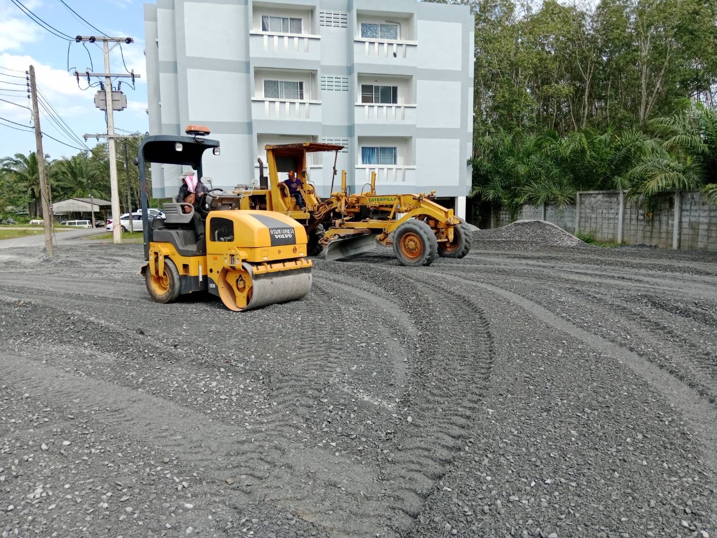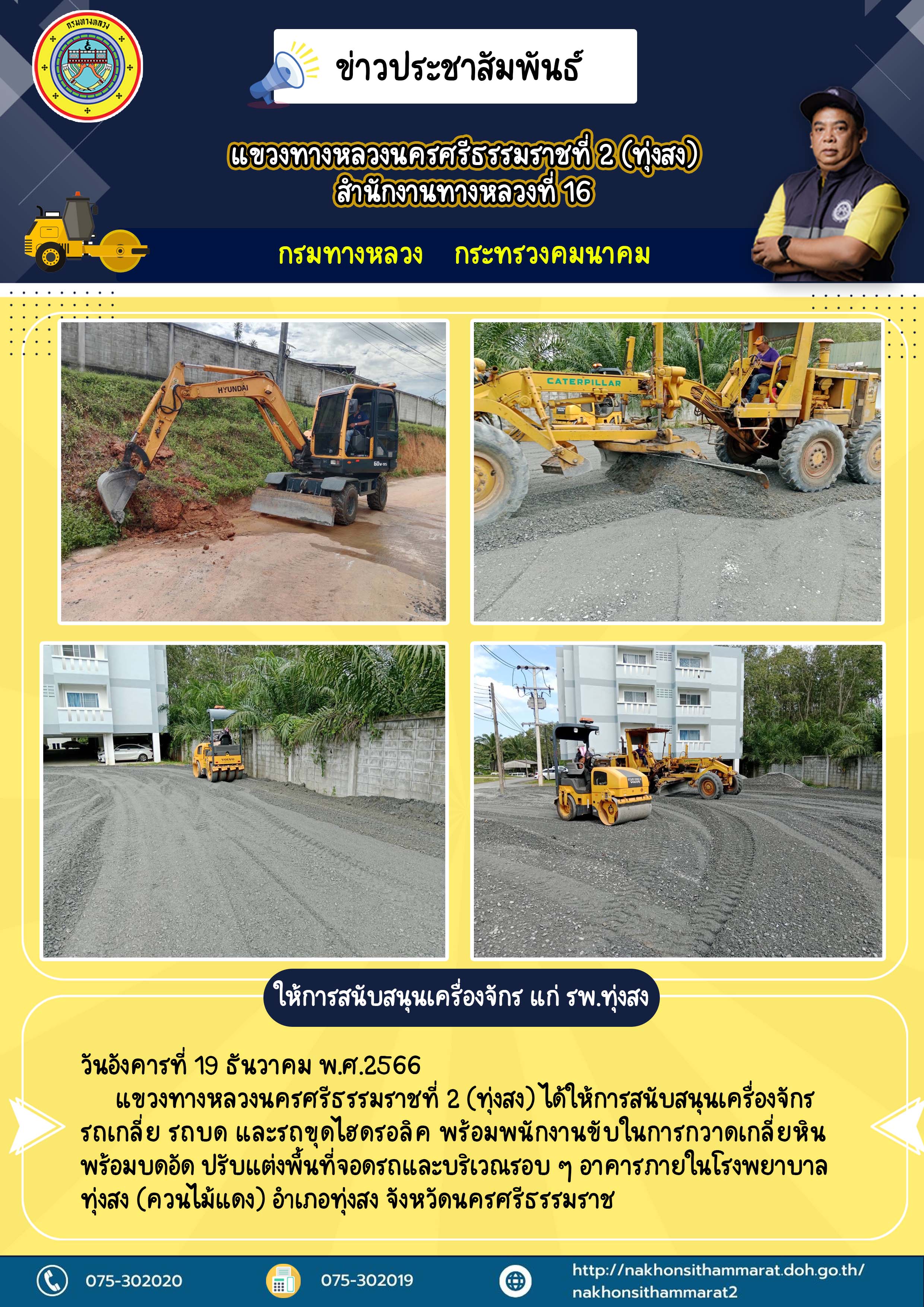 แขวงทางหลวงนครศรีธรรมราชที่ 2 (ทุ่งสง) ได้ให้การสนับสนุนเครื่องจักร รถเกลี่ย รถบด และรถขุดไฮดรอลิค พร้อมพนักงานขับในการกวาดเกลี่ยหิน พร้อมบดอัดปรับแต่งพื้นที่จอดรถและบริเวณรอบๆอาคาร ภายในโรงพยาบาลทุ่งสง (ควนไม้แดง) อ. ทุ่งสง จ. นครศรีธรรมราช