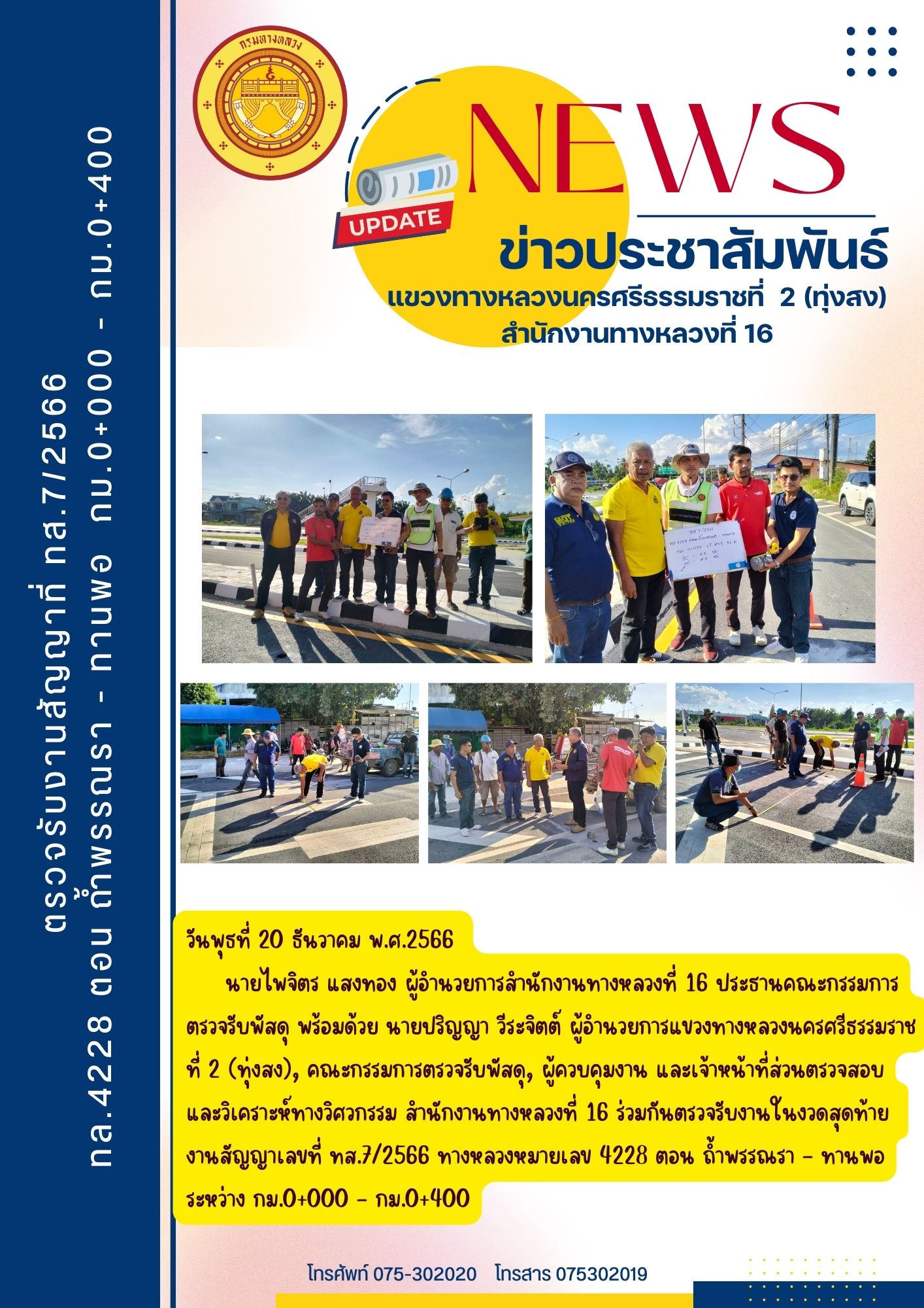 นายไพจิตร แสงทอง ผู้อำนวยการสำนักงานทางหลวงที่ 16 ประธานคณะกรรมการตรวจรับพัสดุ พร้อมด้วย นายปริญญา วีระจิตต์ ผู้อำนวยการแขวงทางหลวงนครศรีธรรมราชที่2(ทุ่งสง), คณะกรรมการตรวจรับพัสดุ, ผู้ควบคุมงาน และเจ้าหน้าที่ส่วนวิเคราะห์ สำนักงานทางหลวงที่ 16 ร่วมตรวจรับงานในงวดสุดท้าย งานสัญญาที่ ทส.7/2566 ทางหลวงหมายเลข 4228 ตอน ถ้ำพรรณรา - ทานพอ ระหว่าง กม.0+000 - กม.0+400