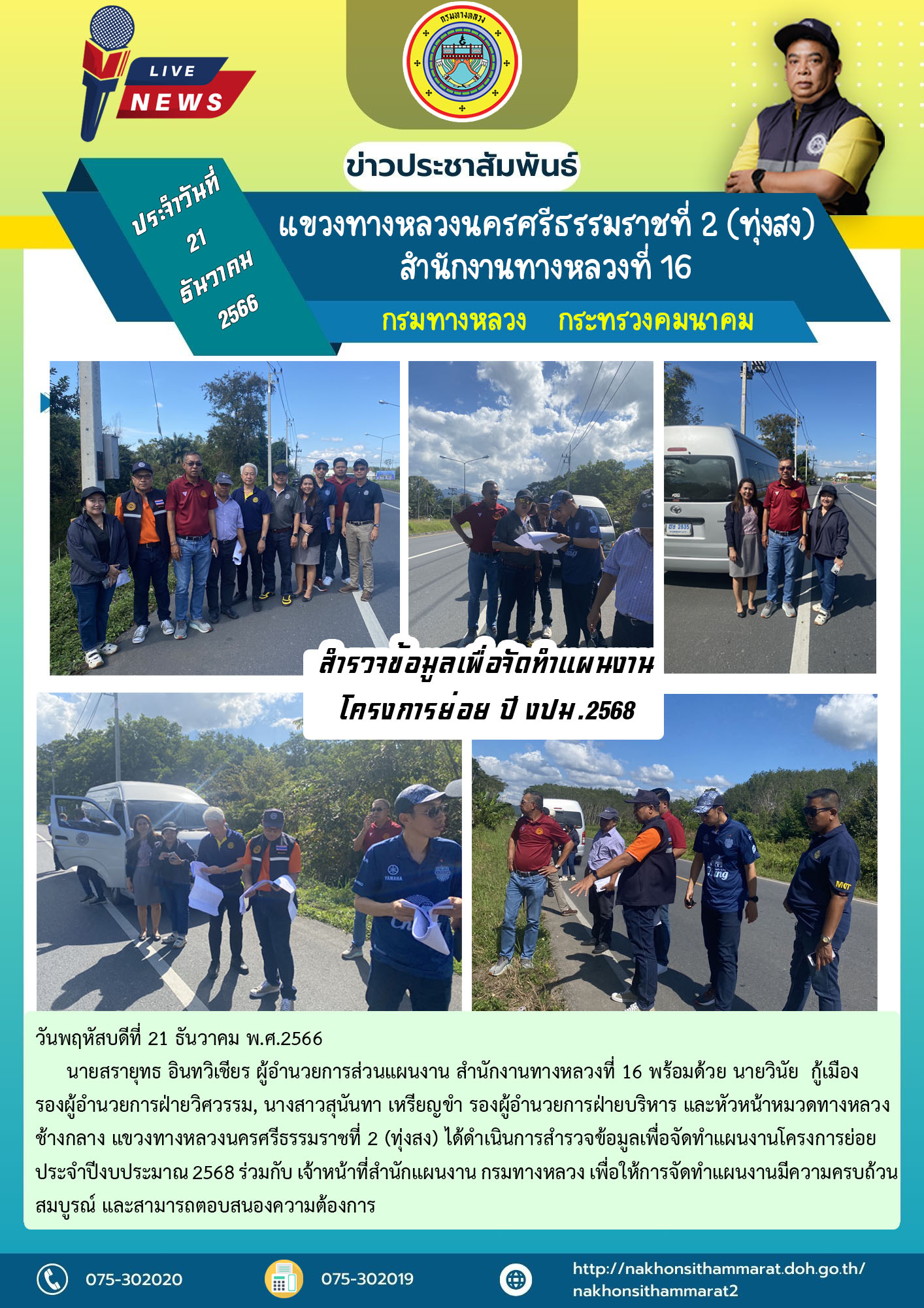 นายสรายุทธ อินทวิเชียร ผู้อำนวยการส่วนแผนงาน สำนักงานทางหลวงที่ 16 พร้อมด้วย นายวินัย กู้เมือง รองผู้อำนวยการฝ่ายวิศวรรม, นางสาวสุนันทา เหรียญขำ รองผู้อำนวยการฝ่ายบริหารงานทั่วไป และหัวหน้าหมวดทางหลวงช้างกลาง แขวงทางหลวงนครศรีธรรมราชที่ 2 (ทุ่งสง) ได้ดำเนินการสำรวจข้อมูลเพื่อจัดทำแผนงานโครงการย่อย ประจำปีงบประมาณ 2568 ร่วมกับ เจ้าหน้าที่สำนักแผนงาน กรมทางหลวง เพื่อให้การจัดทำแผนงานมีความครบถ้วนสมบูรณ์ และสามารถตอบสนองความต้องการของประชาชนในพื้นที่ได้อย่างเหมาะสม