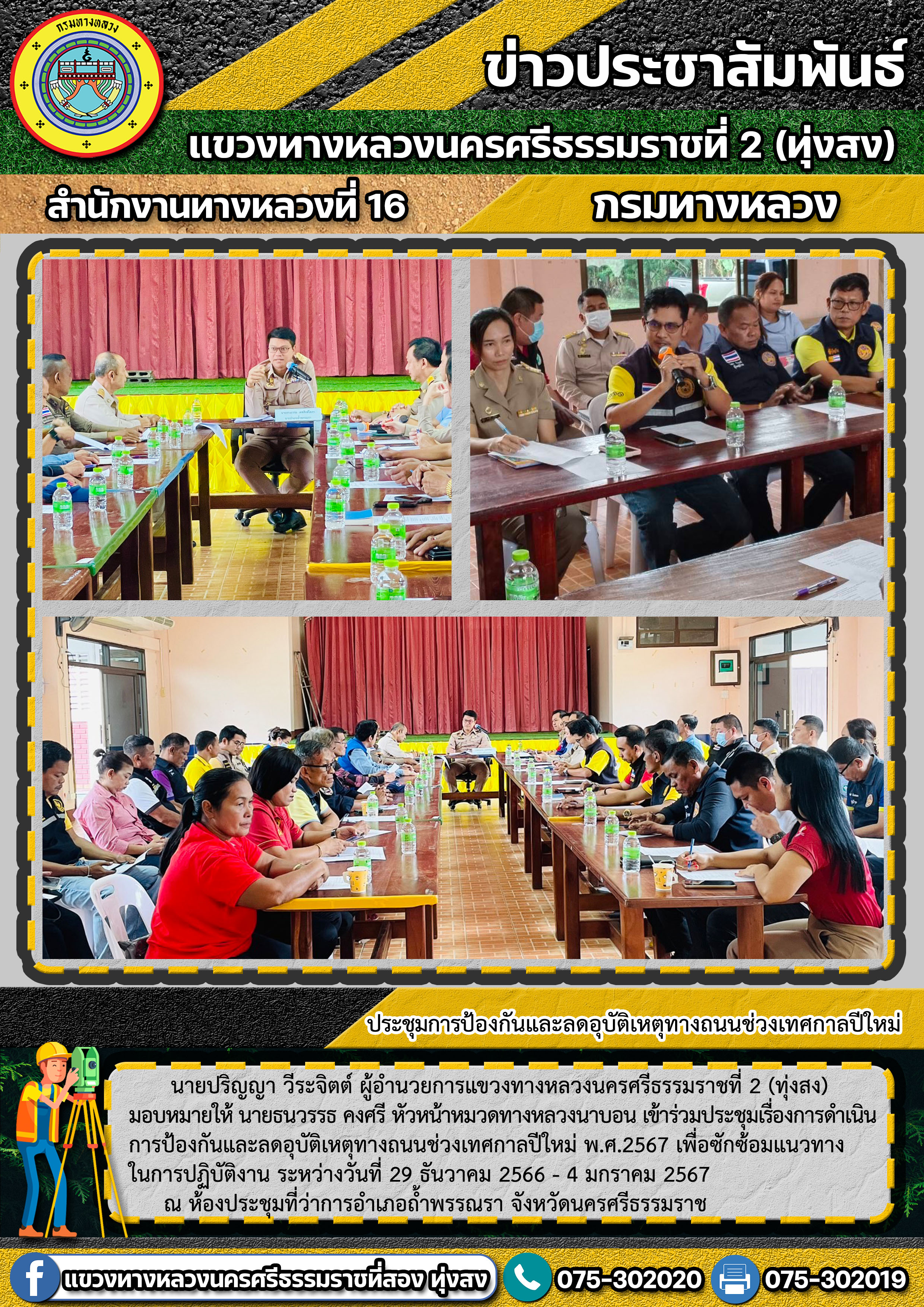 นายปริญญา วีระจิตต์ ผู้อำนวยการแขวงทางหลวงนครศรีธรรมราชที่ 2 (ทุ่งสง) มอบหมายให้ นายธนวรรธ คงศรี หัวหน้าหมวดทางหลวงนาบอน เข้าร่วมประชุมเรื่องการดำเนินการป้องกันและลดอุบัติเหตุทางถนนช่วงเทศกาลปีใหม่ พ.ศ.2567 เพื่อซักซ้อมแนวทางในการปฏิบัติงาน ระหว่างวันที่ 29 ธันวาคม 2566 - 4 มกราคม 2567