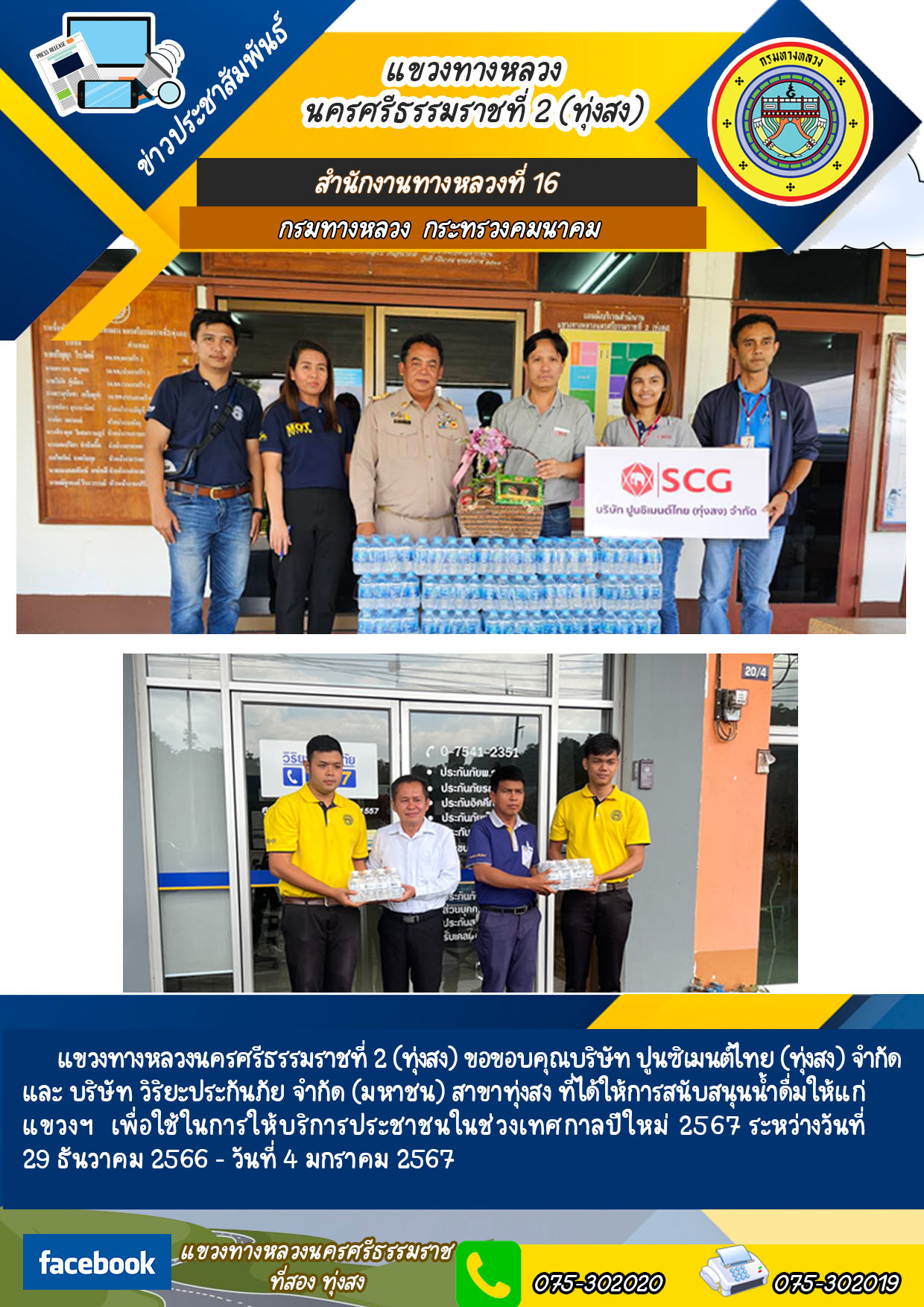 แขวงทางหลวงนครศรีธรรมราชที่ 2 (ทุ่งสง) ขอขอบคุณบริษัท ปูนซิเมนต์ไทย (ทุ่งสง) จำกัด และ บริษัท วิริยะประกันภัย จำกัด (มหาชน) สาขาทุ่งสง ที่ได้ให้การสนับสนุนน้ำดื่มให้แก่ แขวงฯ เพื่อใช้ในการให้บริการประชาชนในช่วงเทศกาลปีใหม่ 2567 ระหว่างวันที่ 29 ธันวาคม 2566 - วันที่ 4 มกราคม 2567