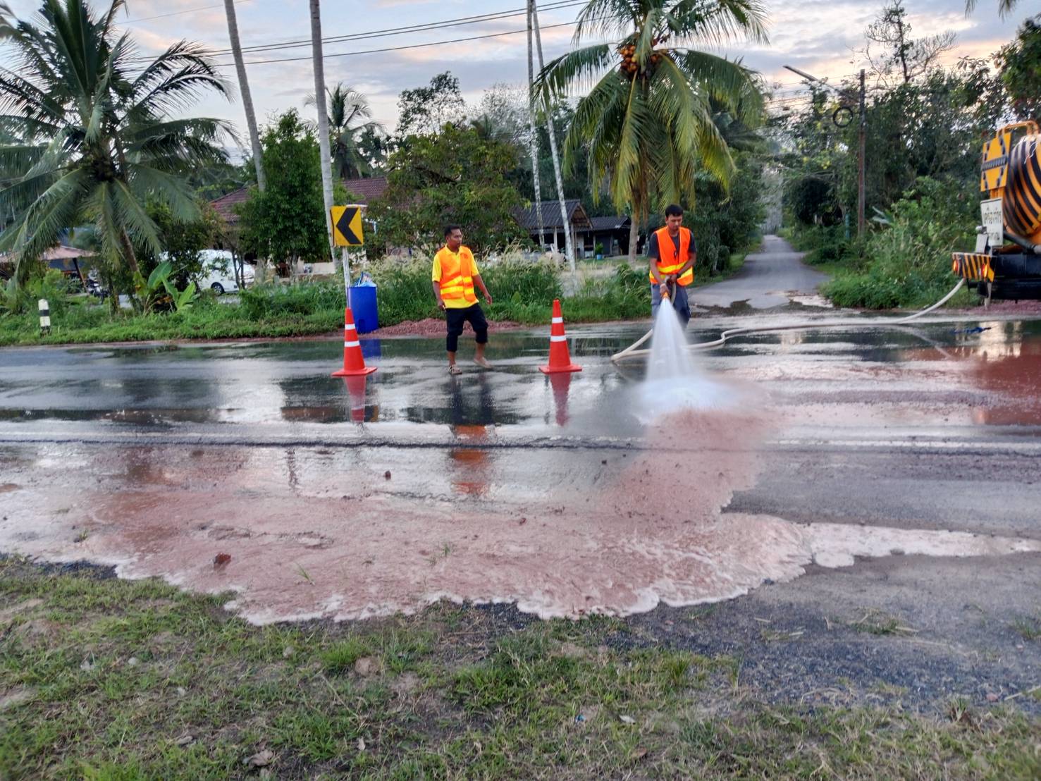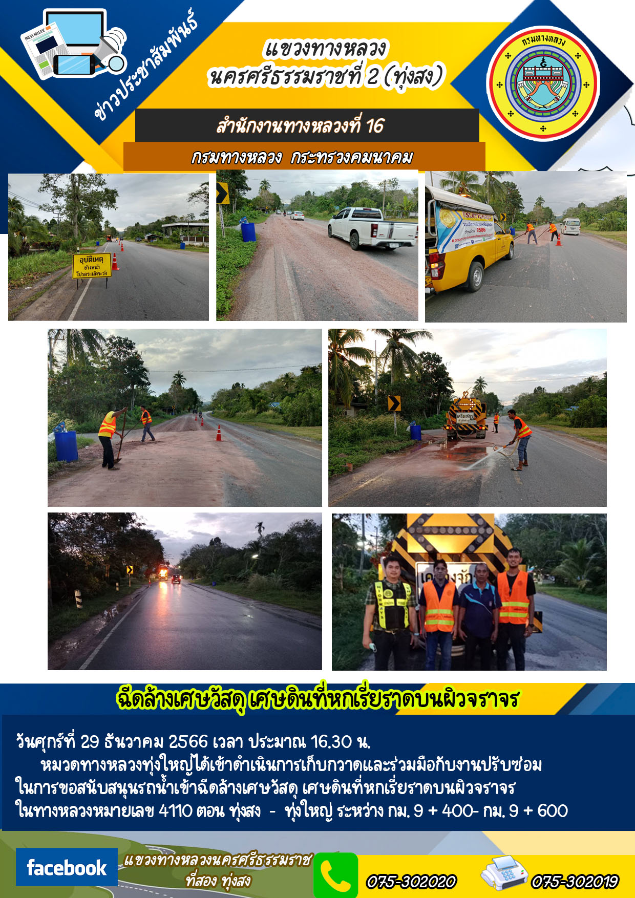 หมวดทางหลวงทุ่งใหญ่ได้เข้าดำเนินการเก็บกวาดและร่วมมือกับงานปรับซ่อม ในการขอสนับสนุนรถน้ำเข้าฉีดล้างเศษวัสดุ เศษดินที่หกเรี่ยราดบนผิวจราจรในทางหลวงหมายเลข 4110 ตอน ทุ่งสง - ทุ่งใหญ่ ระหว่าง กม. 9 + 400- กม. 9 + 600