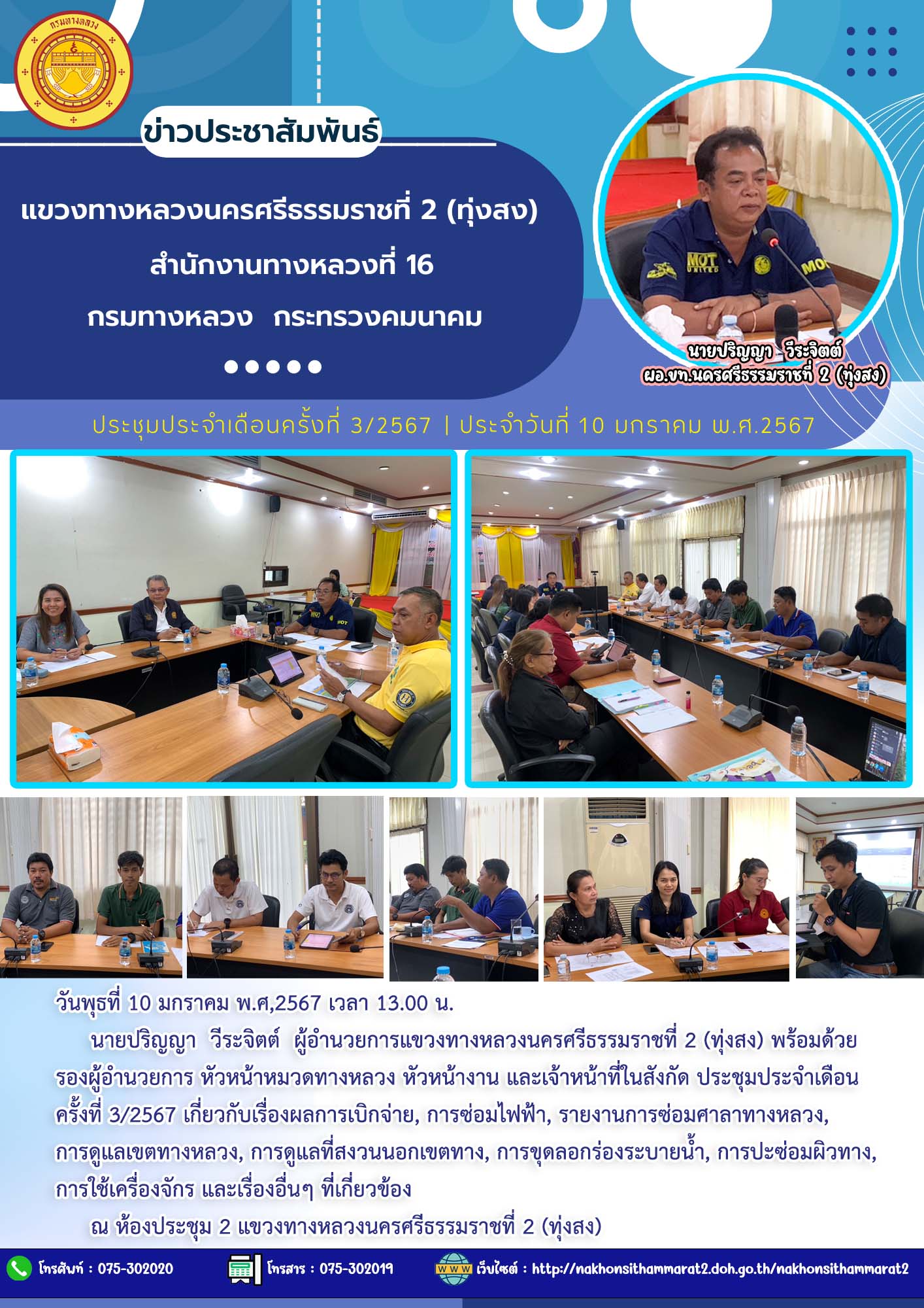 นายปริญญา วีระจิตต์ ผู้อำนวยการแขวงทางหลวงนครศรีธรรมราชที่่ 2 (ทุ่งสง) พร้อมด้วย รองผู้อำนวยการ หัวหน้าหมวดทางหลวง หัวหน้างาน และเจ้าหน้าที่ในสังกัด ประชุมประจำเดือนครั้งที่ 3/2567 เกี่ยวกับเรื่องผลการเบิกจ่าย, การซ่อมไฟฟ้า, รายงานการซ่อมศาลาทางหลวง, การดูแลเขตทางหลวง, การดูแลที่สงวนนอกเขตทาง, การขุดลอกร่องระบายน้ำ, การปะซ่อมผิวทาง, การใช้เครื่องจักร, การเตรียมความพร้อมในการดำเนินงบประมาณปี 2567 และเรื่องอื่นๆ ที่เกี่ยวข้อง