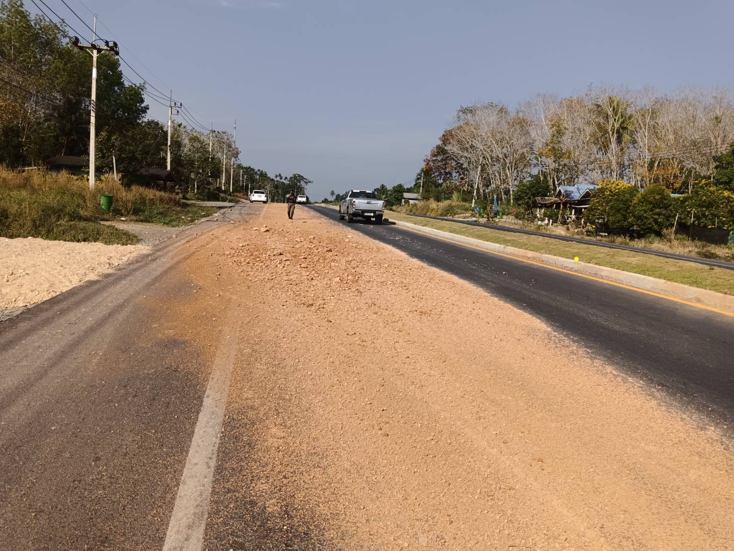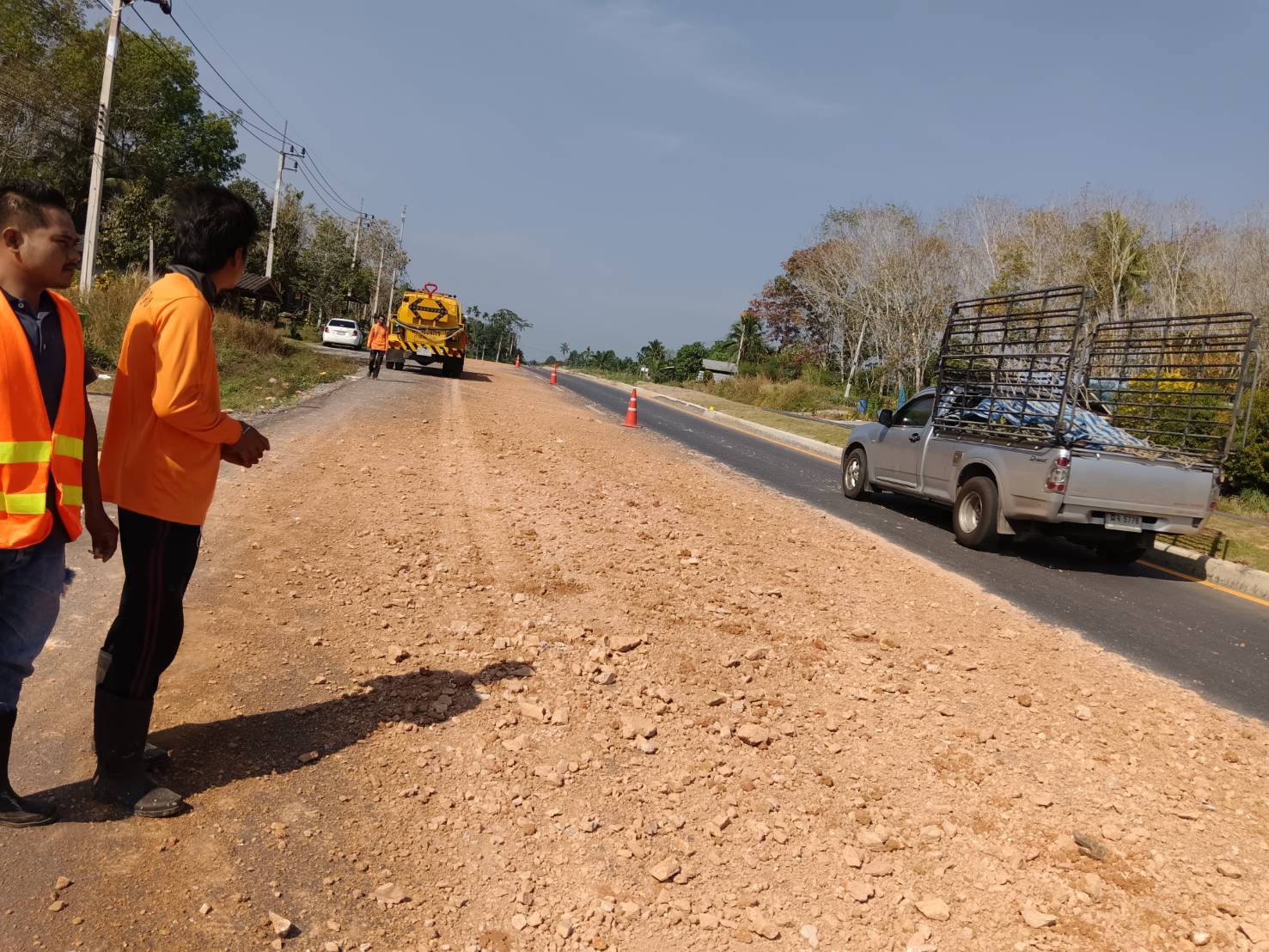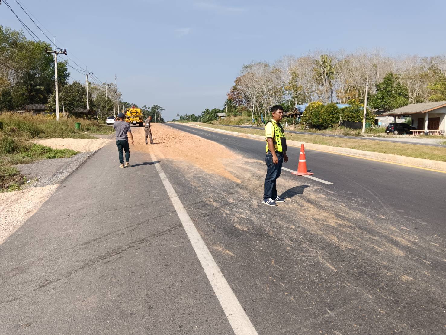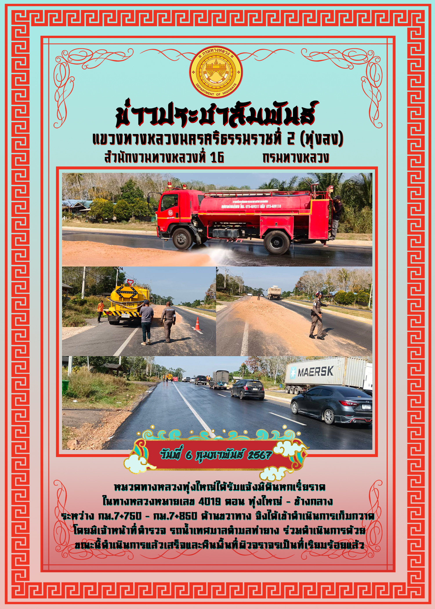 หมวดทางหลวงทุ่งใหญ่ได้รับแจ้งมีดินหกเรี่ยราด ในทางหลวงหมายเลข 4019 ตอน ทุ่งใหญ่ - ช้างกลาง ระหว่าง กม.7+750 - กม.7+850 ด้านขวาทาง