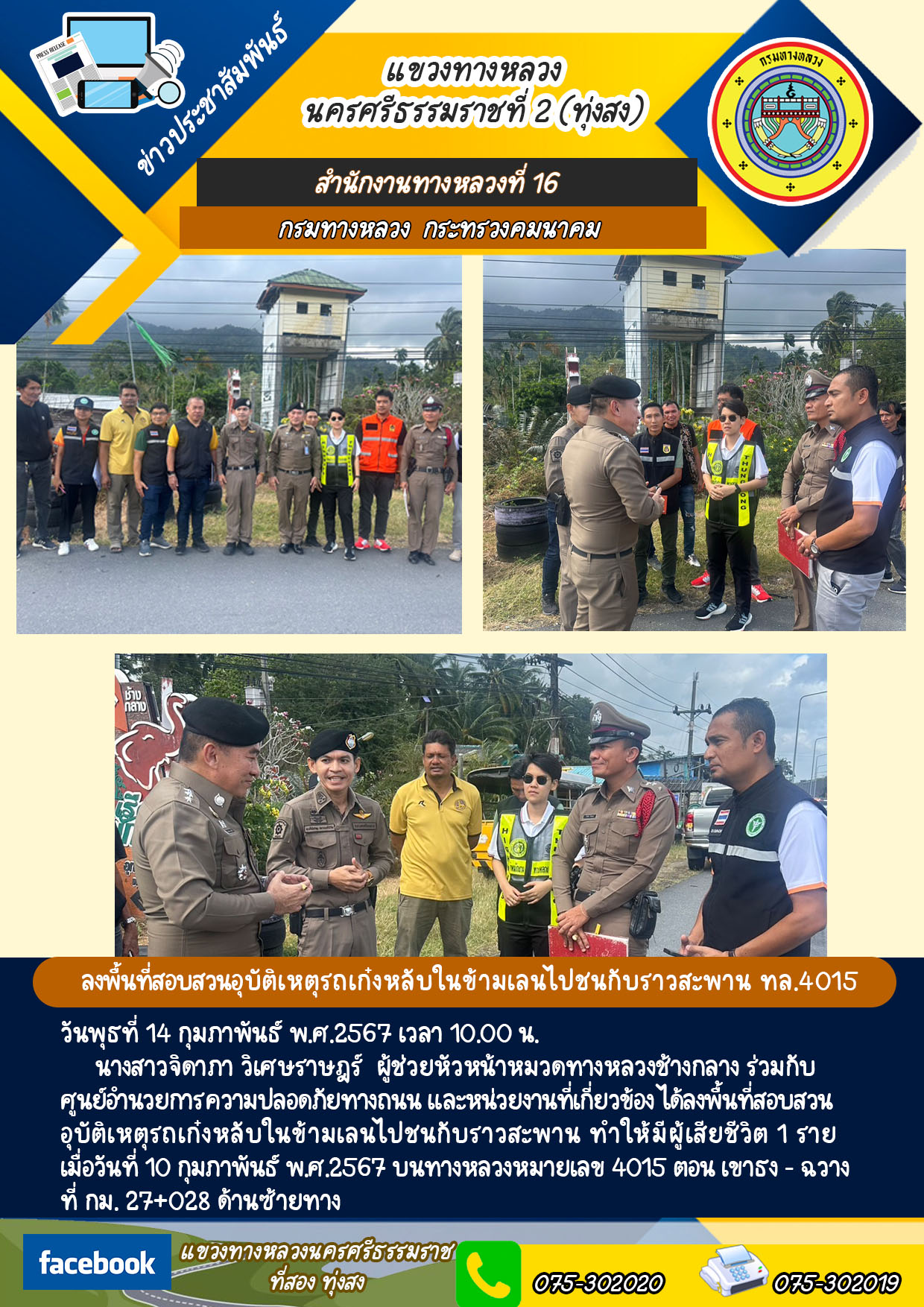 ลงพื้นที่ตรวจสอบสาเหตุการเกิดอุบัติเหตุ ใน ทล.4015 ตอน เขาธง - ฉวาง ที่ กม. 27+028 ด้านซ้ายทาง