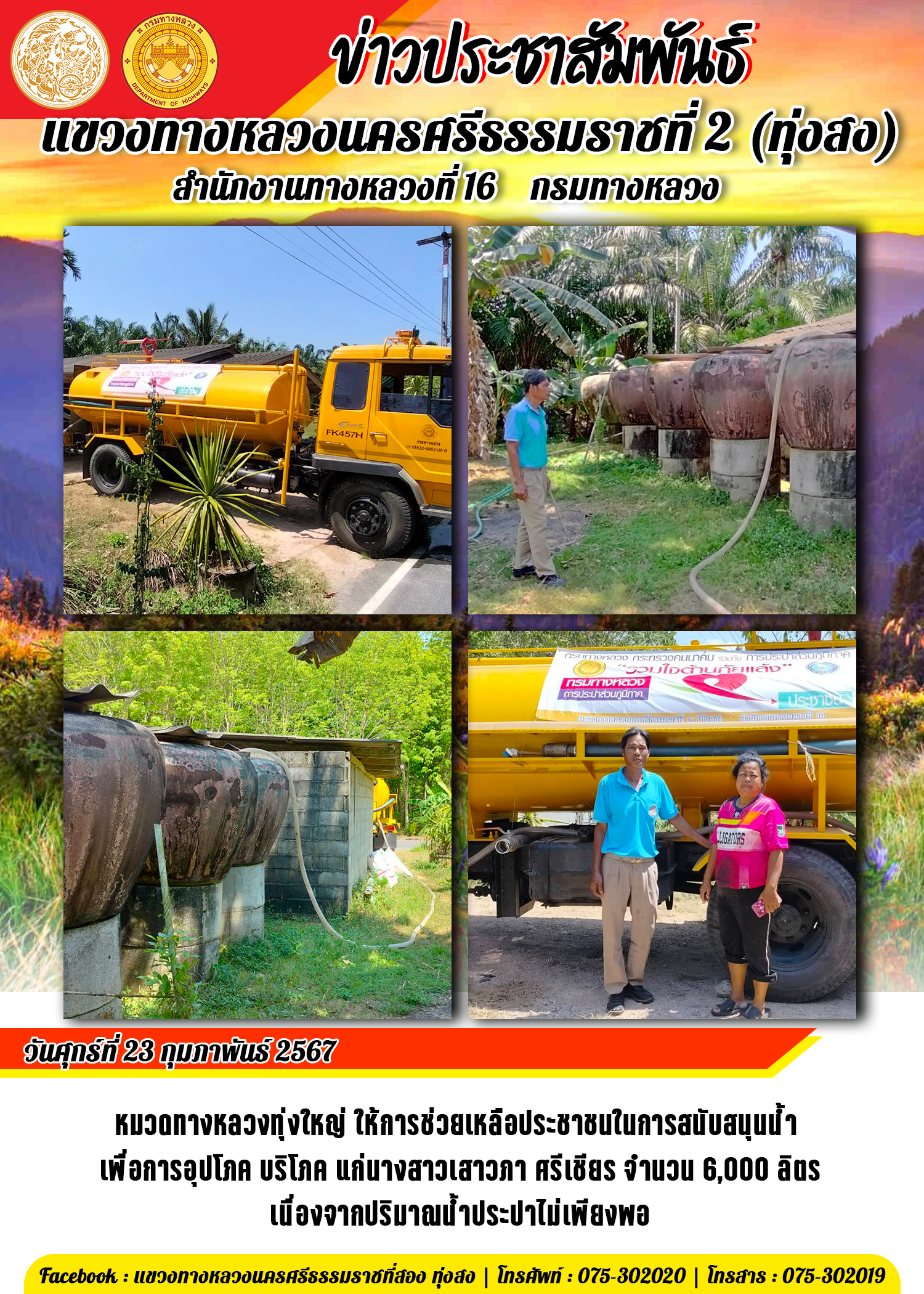 หมวดทางหลวงทุ่งใหญ่ ให้การช่วยเหลือประชาชนในการสนับสนุนน้ำ