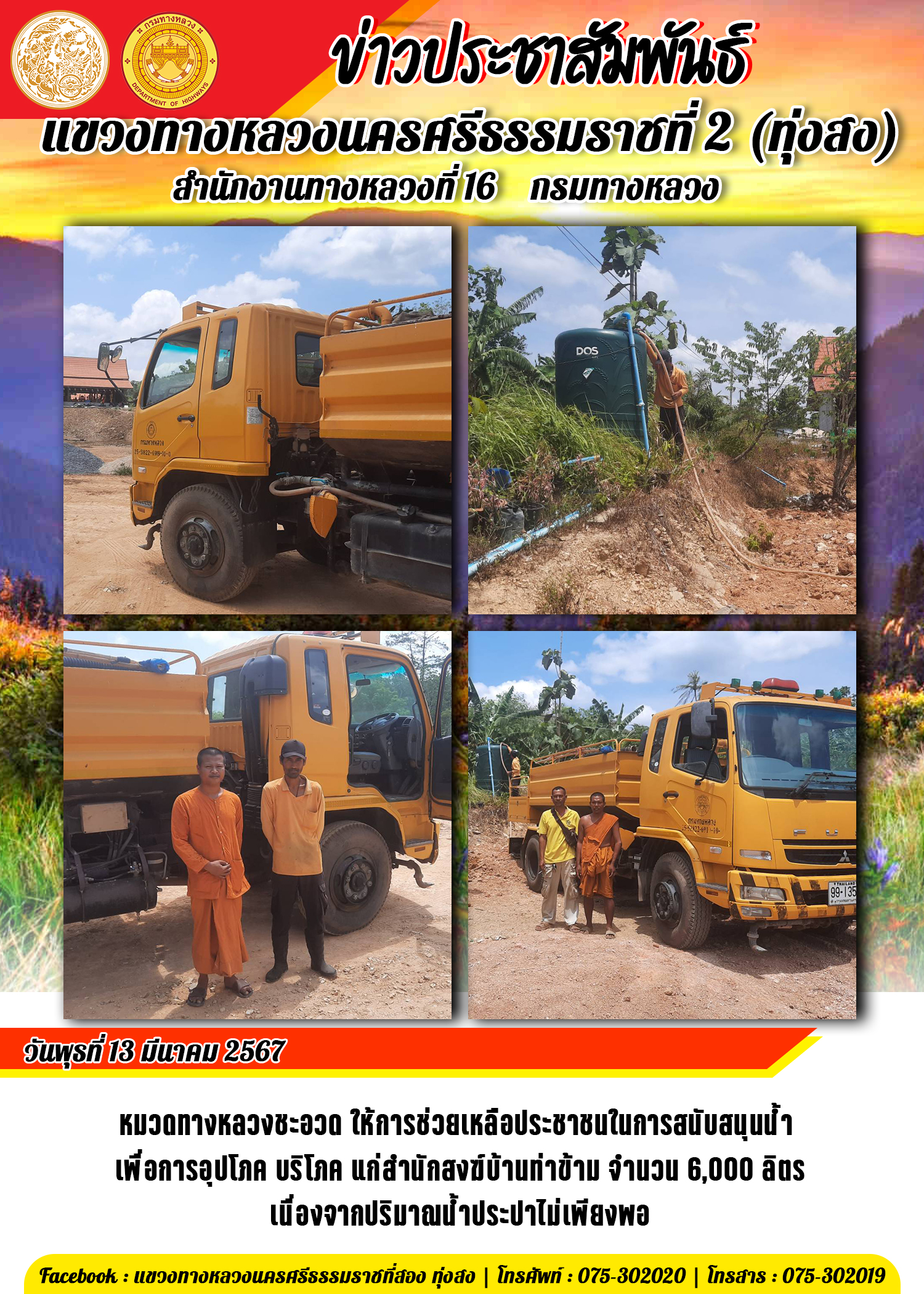 หมวดทางหลวงชะอวด ให้การช่วยเหลือประชาชนในการสนับสนุนน้ำ หมวดทางหลวงชะอวด ให้การช่วยเหลือประชาชนในการสนับสนุนน้ำ เพื่อการอุปโภค บริโภค แก่สำนักสงฆ์บ้านท่าข้าม จำนวน 6,000 ลิตรเนื่องจากปริมาณน้ำประปาไม่เพียงพอ