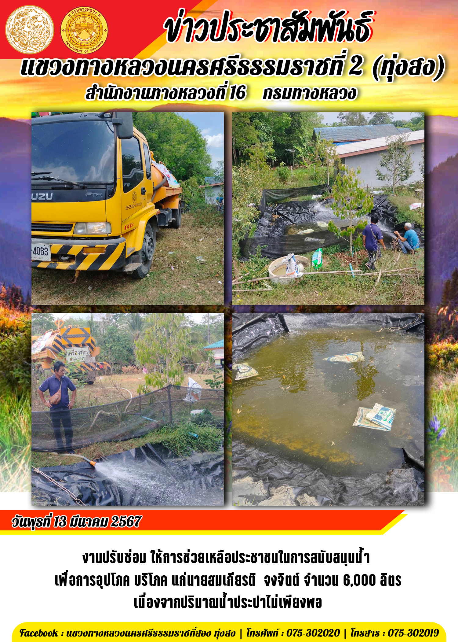 งานปรับซ่อม ให้การช่วยเหลือประชาชนในการสนับสนุนน้ำ เพื่อการอุปโภค บริโภค แก่นายสมเกียรติ จงจิตต์ จำนวน 6,000 ลิตร เนื่องจากปริมาณน้ำประปาไม่เพียงพอ