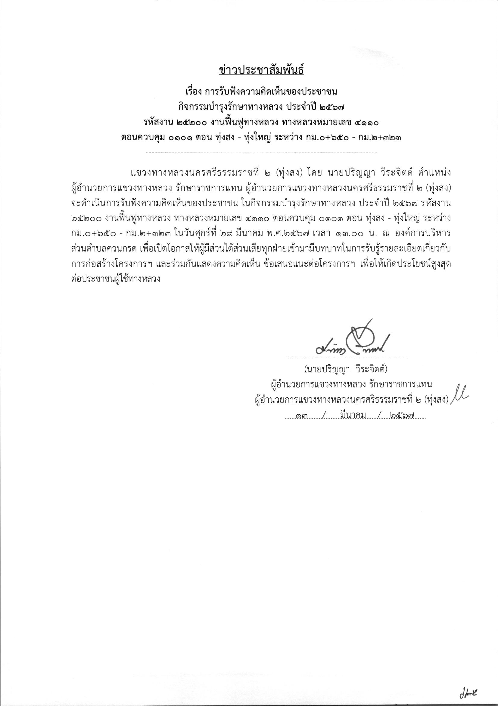 จะดำเนินการรับฟังความคิดเห็นของประชาชนในกิจกรรมบำรุงรักษาทางหลวง ประจำปี 2567 รหัสงาน 25200 งานฟื้นฟูทางหลวง ทางหลวงหมายเลข 4110 ตอนควบคุม 0101 ตอน ทุ่งสง - ทุ่งใหญ่ ระหว่าง กม.0+650 - กม.2+323 ในวันศุกร์ที่ 29 มีนาคม พ.ศ.2567 เวลา 13.00 น. ณ องค์การบริหารส่วนตำบลควนกรด เพื่อเปิดโอกาสให้ผู้มีส่วนได้ส่วนเสียทุกฝ่ายเข้ามามีบทบาทในการรับรู้รายละเอียดเกี่ยวกับการก่อสร้างโครงการฯ และร่วมกันแสดงความคิดเห็น ข้อเสนอแนะต่อโครงการฯ เพื่อให้เกิดประโยชน์สูงสุดต่อประชาชนผู้ใช้ทางหลวง