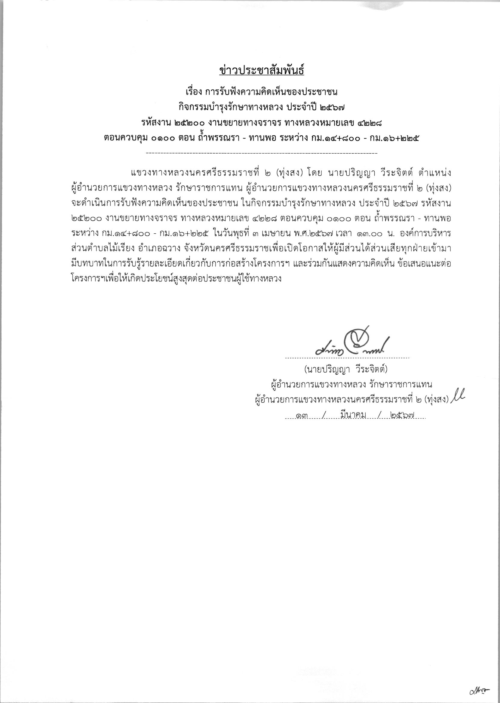 จะดำเนินการรับฟังความคิดเห็นของประชาชน ในกิจกรรมบำรุงรักษาทางหลวง ประจำปี 2567 รหัสงาน 25200 งานขยายทางจราจร ทางหลวงหมายเลข 4228 ตอนควบคุม 0100 ตอน ถ้ำพรรณรา - ทานพอ ระหว่าง กม.14+800 - กม.16+225 ในวันพุธที่ 3 เมษายน พ.ศ.2567 เวลา 13.00 น. องค์การบริหารส่วนตำบลไม้เรียง อำเภอฉวาง จังหวัดนครศรีธรรมราชเพื่อเปิดโอกาสให้ผู้มีส่วนได้ส่วนเสียทุกฝ่ายเข้ามามีบทบาทในการรับรู้รายละเอียดเกี่ยวกับการก่อสร้างโครงการฯ และร่วมกันแสดงความคิดเห็น ข้อเสนอแนะต่อโครงการฯเพื่อให้เกิดประโยชน์สูงสุดต่อประชาชนผู้ใช้ทางหลวง