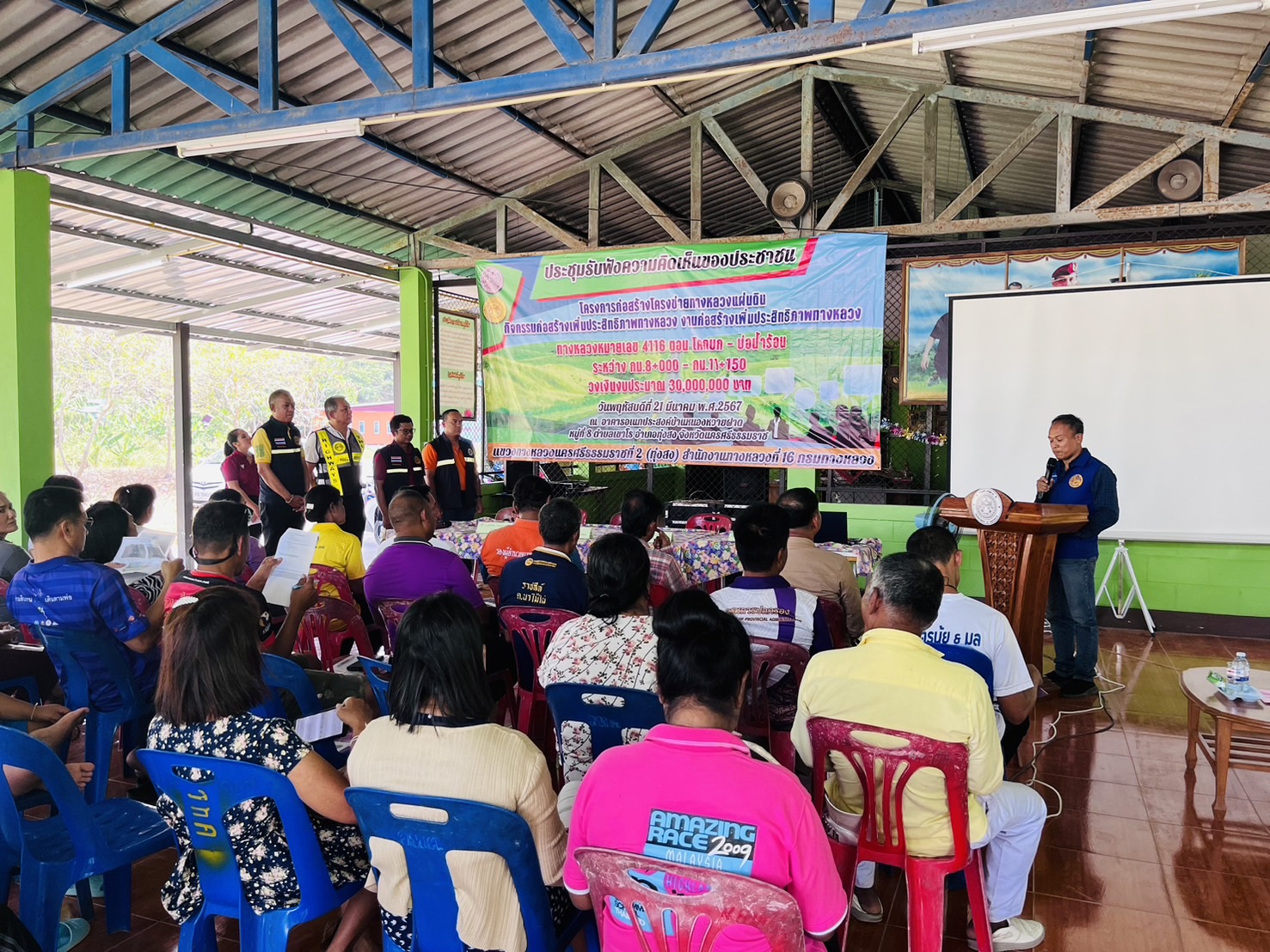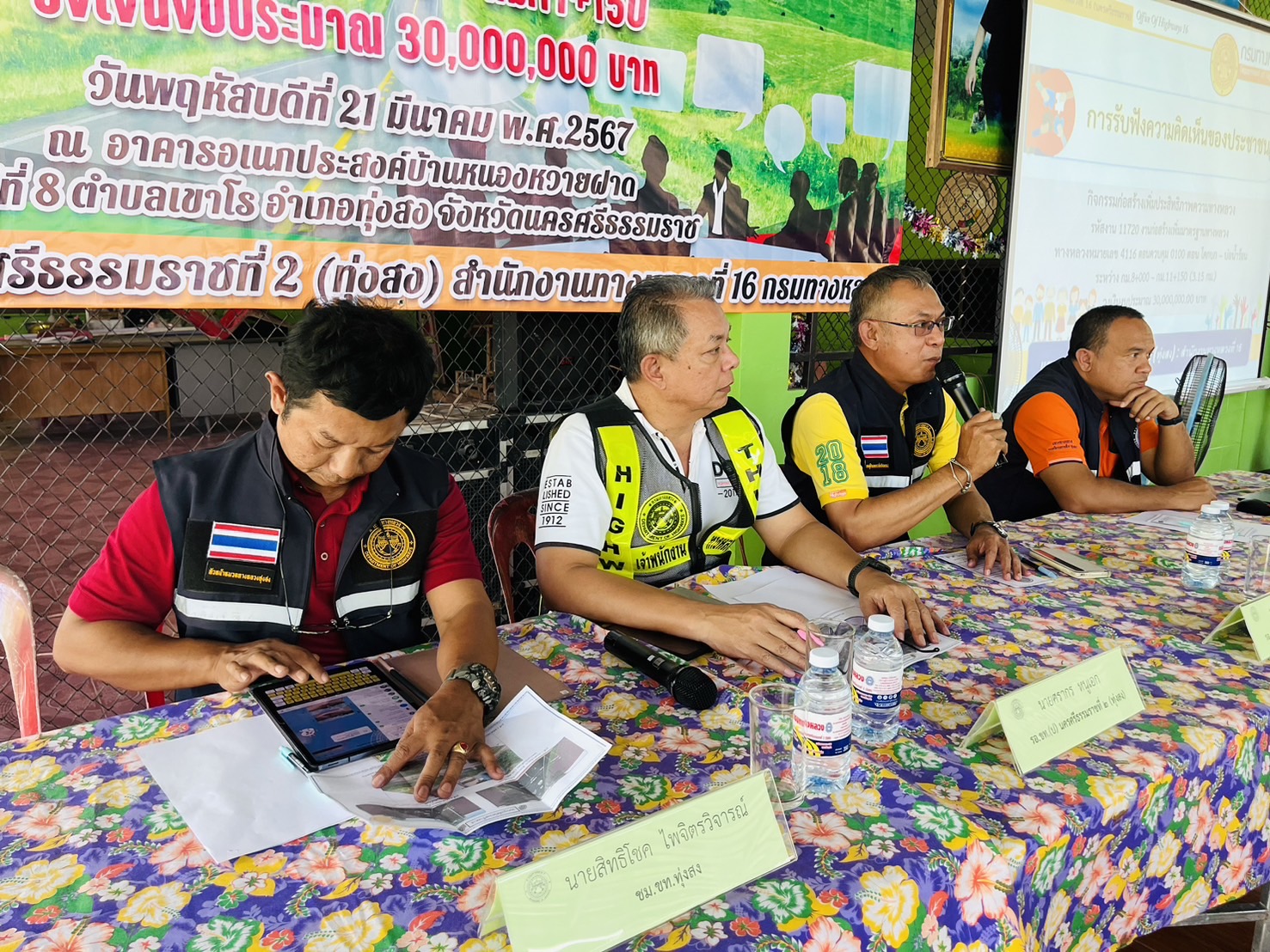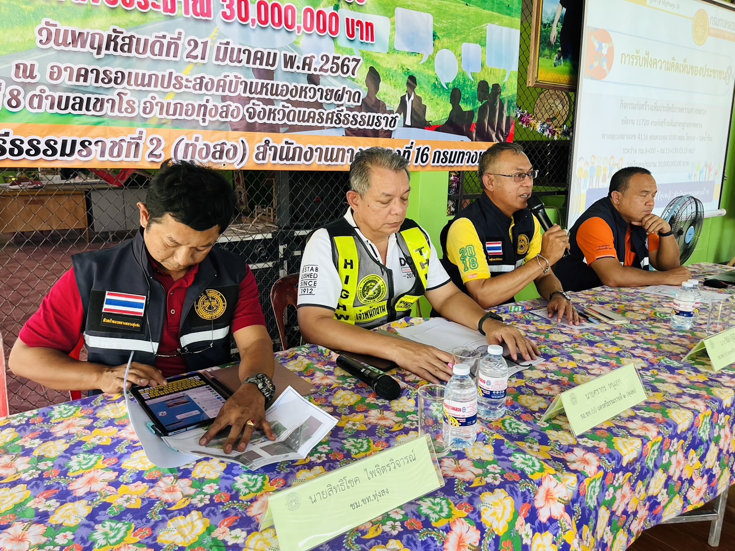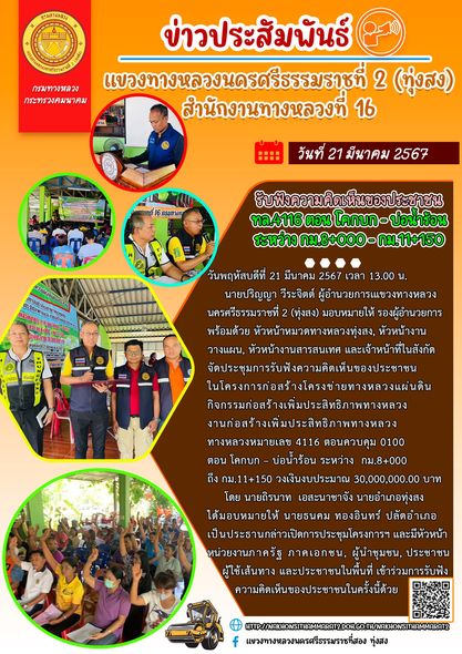 นายปริญญา วีระจิตต์ ผู้อำนวยการเแขวงทางหลวงนครศรีธรรมราชที่ 2 (ทุ่งสง) มอบหมายให้ รองผู้อำนวยการพร้อมด้วย หัวหน้าหมวดทางหลวงทุ่งสง, หัวหน้างานวางแผน, หัวหน้างานสารสนเทศ และเจ้าหน้าที่ในสังกัด จัดประชุมการรับฟังความคิดเห็นของประชาชน ในโครงการก่อสร้างโครงข่ายทางหลวงแผ่นดิน กิจกรรมก่อสร้างเพิ่มประสิทธิภาพทางหลวงงานก่อสร้างเพิ่มประสิทธิภาพทางหลวง ทางหลวงหมายเลข 4116 ตอนควบคุม 0100 ตอน โคกบก – บ่อน้ำร้อน ระหว่าง กม.8+000 ถึง กม.11+150 วงเงินงบประมาณ 30,000,000.00 บาท