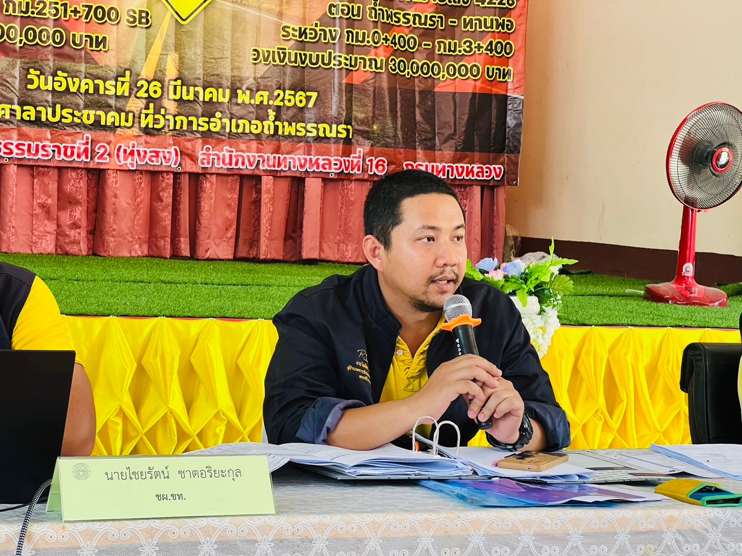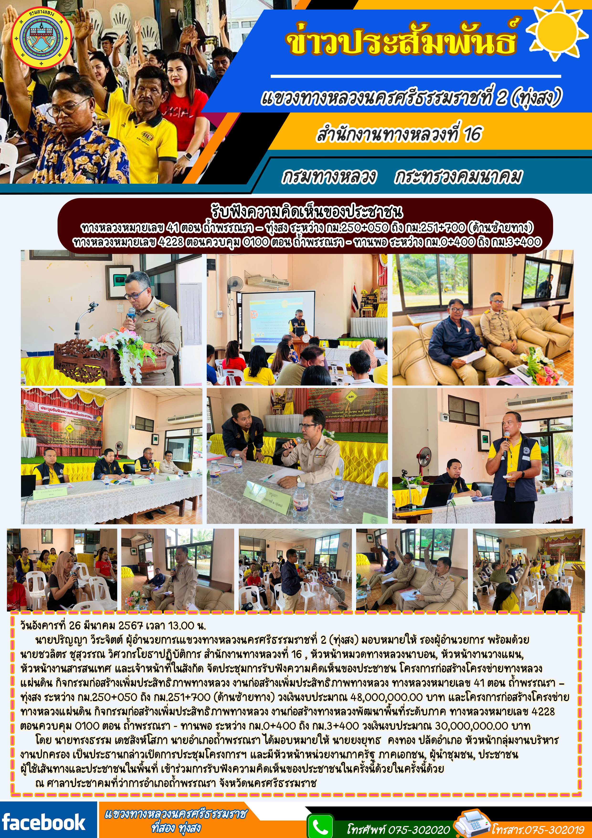 จัดประชุมการรับฟังความคิดเห็นของประชาชน ทางหลวงหมายเลข 41 ตอน ถ้ำพรรณรา – ทุ่งสง ระหว่าง กม.250+050 ถึง กม.251+700 (ด้านซ้ายทาง) และทางหลวงหมายเลข 4228 ตอนควบคุม 0100 ตอน ถ้ำพรรณรา - ทานพอ ระหว่าง กม.0+400 ถึง กม.3+400