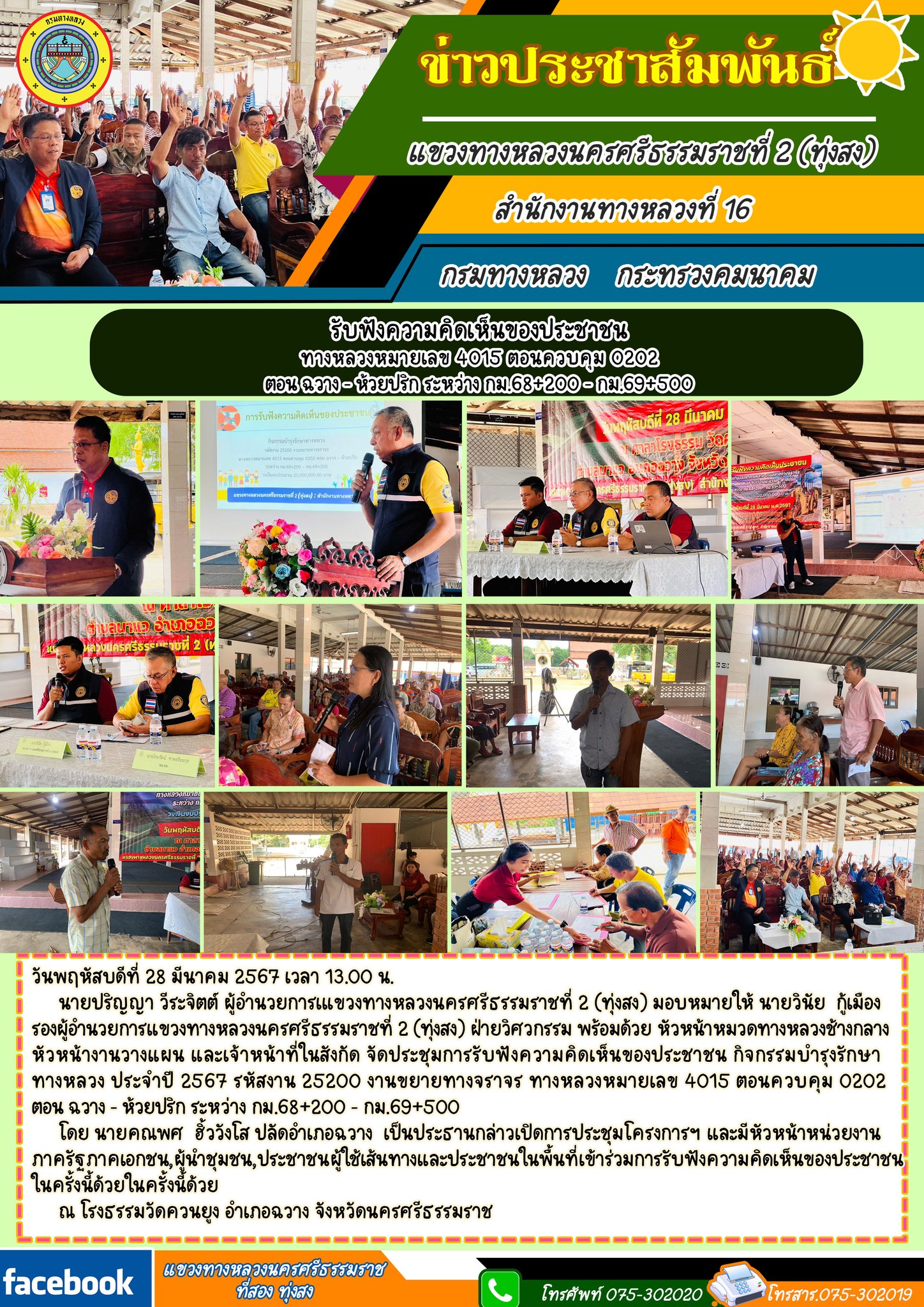 นายปริญญา วีระจิตต์ ผู้อำนวยการเแขวงทางหลวงนครศรีธรรมราชที่ 2 (ทุ่งสง) มอบหมายให้ นายวินัย กู้เมืองรองผู้อำนวยการแขวงทางหลวงนครศรีธรรมราชที่ 2 (ทุ่งสง) ฝ่ายวิศวกรรม พร้อมด้วย หัวหน้าหมวดทางหลวงช้างกลาง หัวหน้างานวางแผน และเจ้าหน้าที่ในสังกัด จัดประชุมการรับฟังความคิดเห็นของประชาชน กิจกรรมบำรุงรักษาทางหลวง ประจำปี 2567 รหัสงาน 25200 งานขยายทางจราจร ทางหลวงหมายเลข 4015 ตอนควบคุม 0202 ตอน ฉวาง - ห้วยปริก ระหว่าง กม.68+200 - กม.69+500 โดย นายคณพศ ฮิ้ววังโส ปลัดอำเภอฉวาง เป็นประธานกล่าวเปิดการประชุมโครงการฯ และมีหัวหน้าหน่วยงานภาครัฐ ภาคเอกชน, ผู้นำชุมชน, ประชาชน ผู้ใช้เส้นทางและประชาชนในพื้นที่ เข้าร่วมการรับฟังความคิดเห็นของประชาชนในครั้งนี้ด้วยในครั้งนี้ด้วย