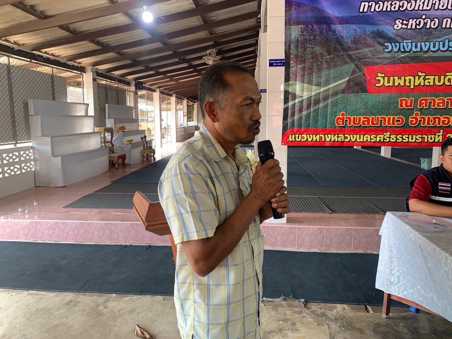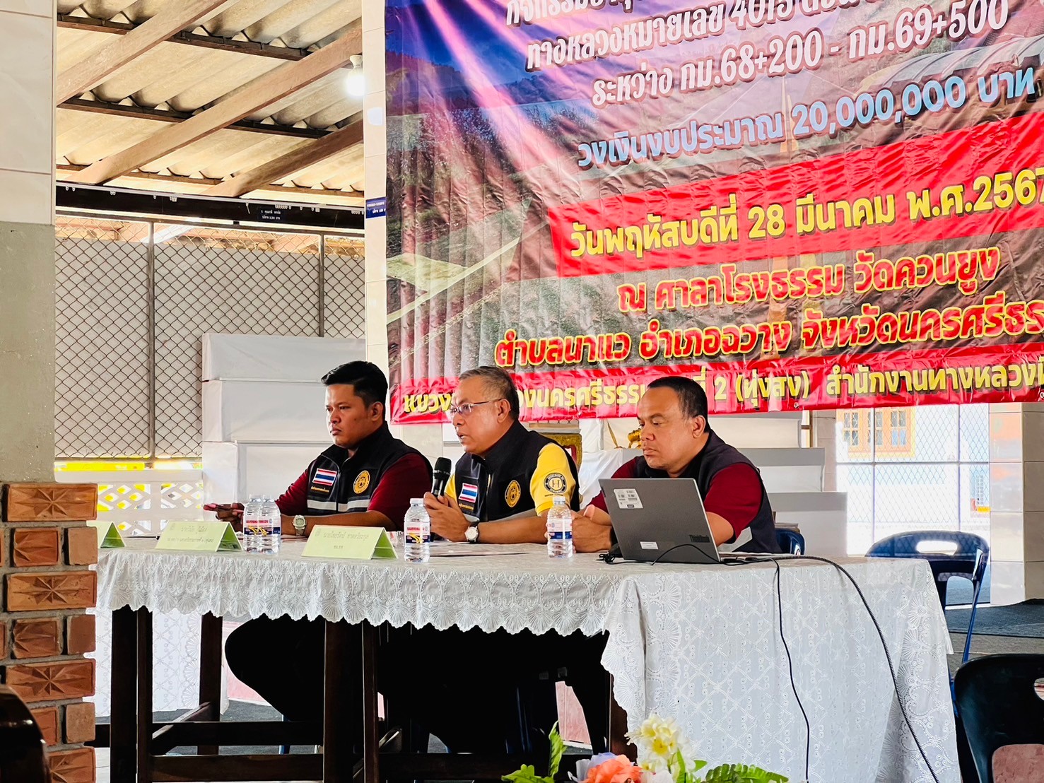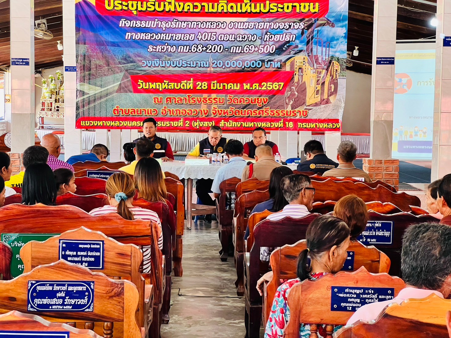 จัดประชุมการรับฟังความคิดเห็นของประชาชน กิจกรรมบำรุงรักษาทางหลวง ประจำปี 2567 รหัสงาน 25200 งานขยายทางจราจร ทางหลวงหมายเลข 4015 ตอนควบคุม 0202 ตอน ฉวาง - ห้วยปริก ระหว่าง กม.68+200 - กม.69+500