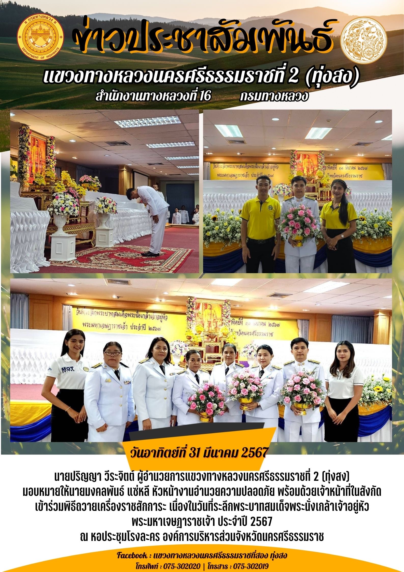 นายปริญญา วีระจิตต์ ผู้อำนวยการแขวงทางหลวงนครศรีธรรมราชที่ 2 (ทุ่งสง) มอบหมายให้นายมงคลพันธ์ แซ่หลี หัวหน้างานอำนวยความปลอดภัย และเจ้าหน้าที่ในสังกัด