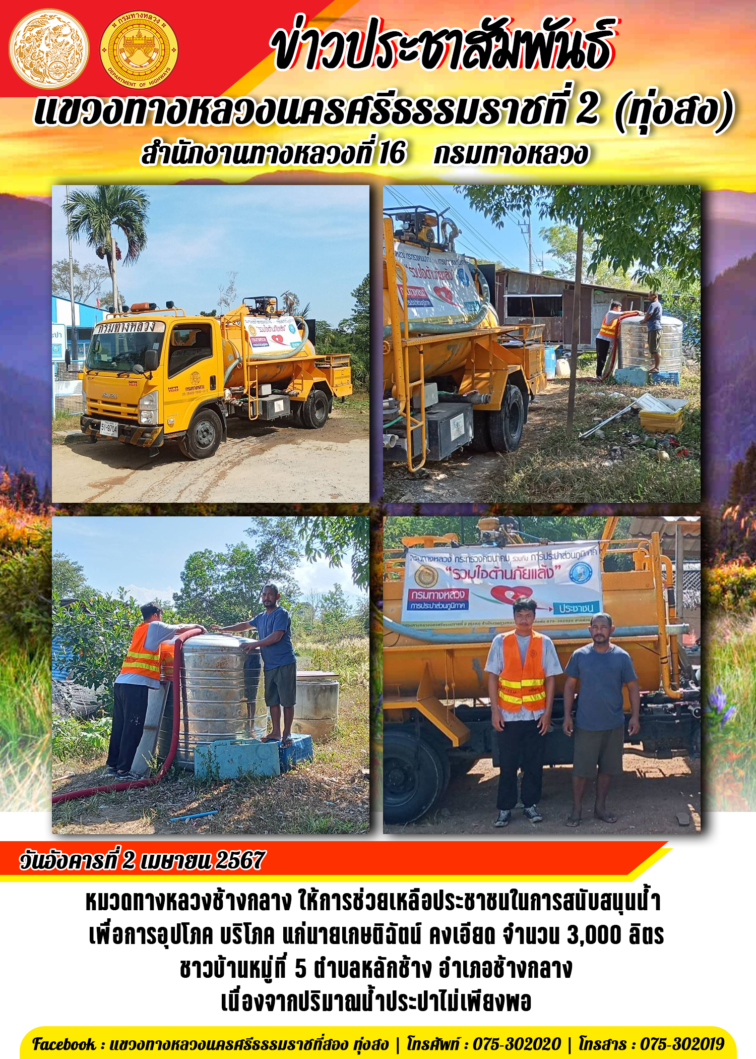 หมวดทางหลวงช้างกลาง ให้การช่วยเหลือประชาชนในการสนับสนุนน้ำ เพื่อการอุปโภค บริโภค