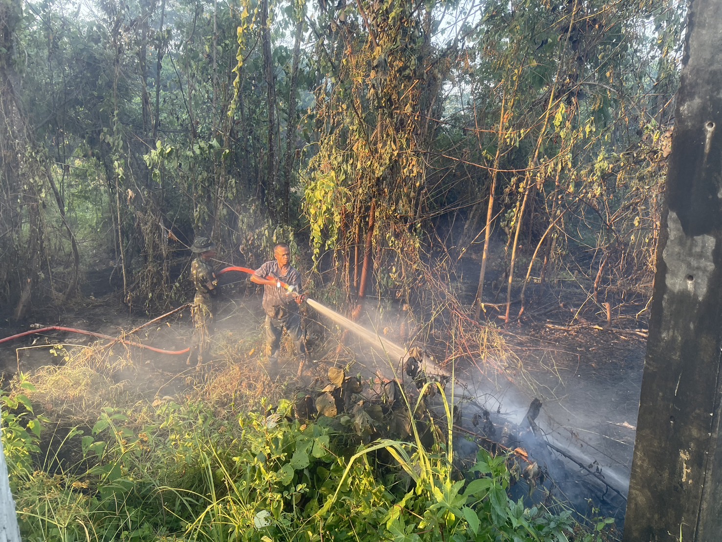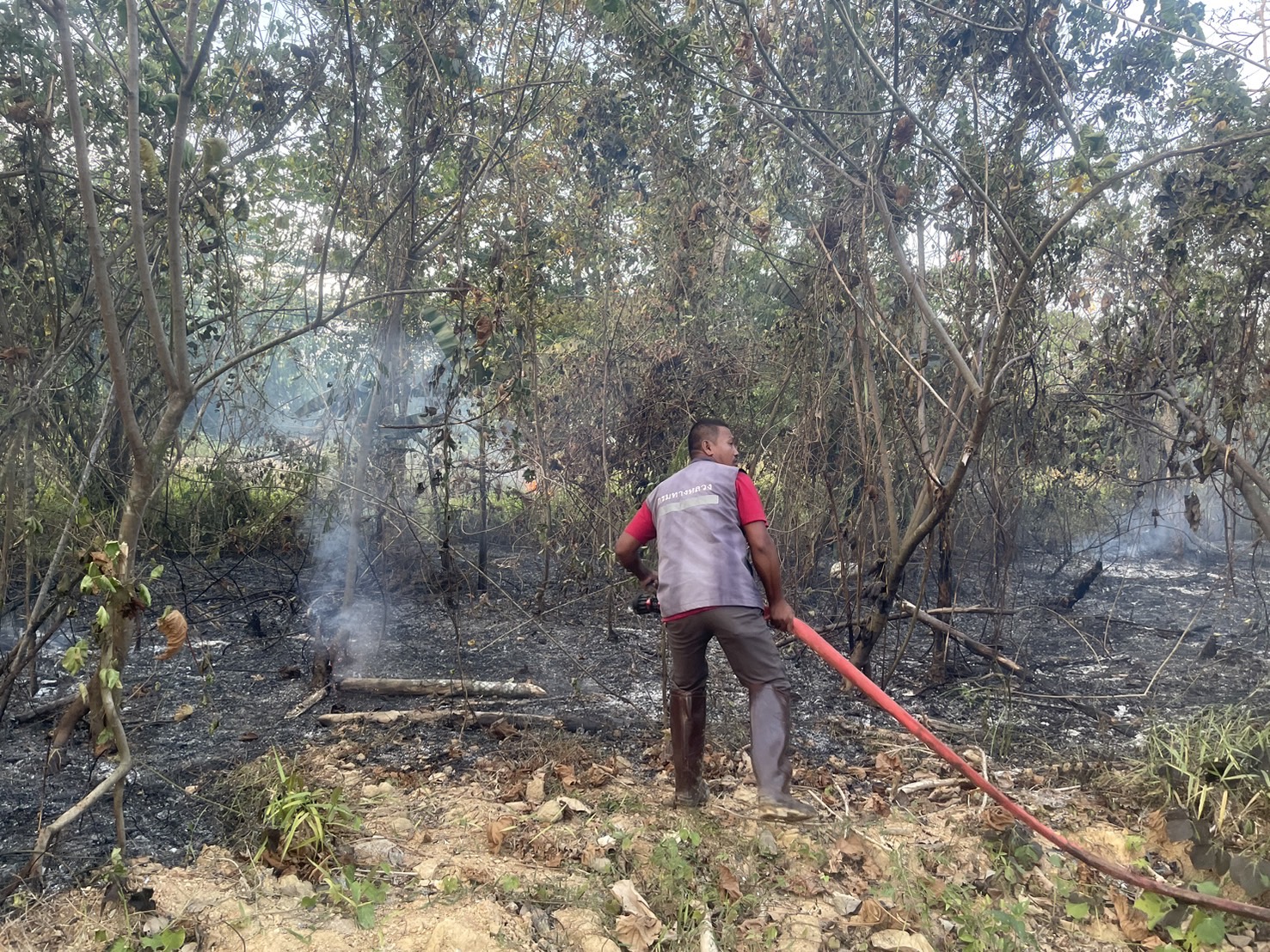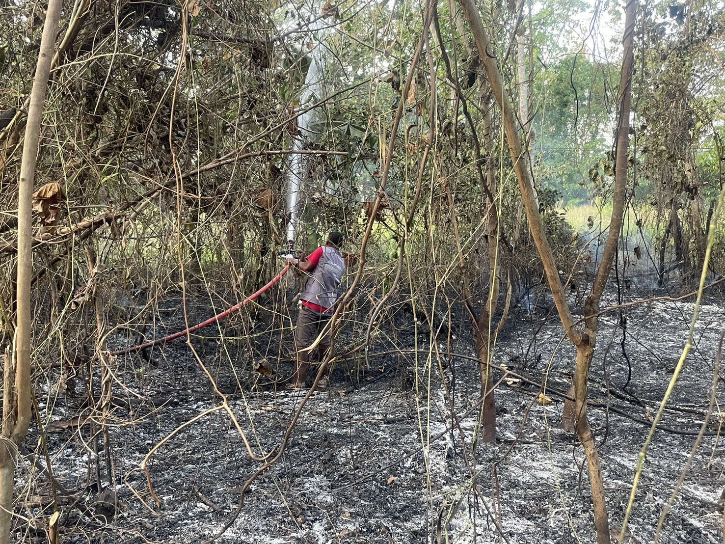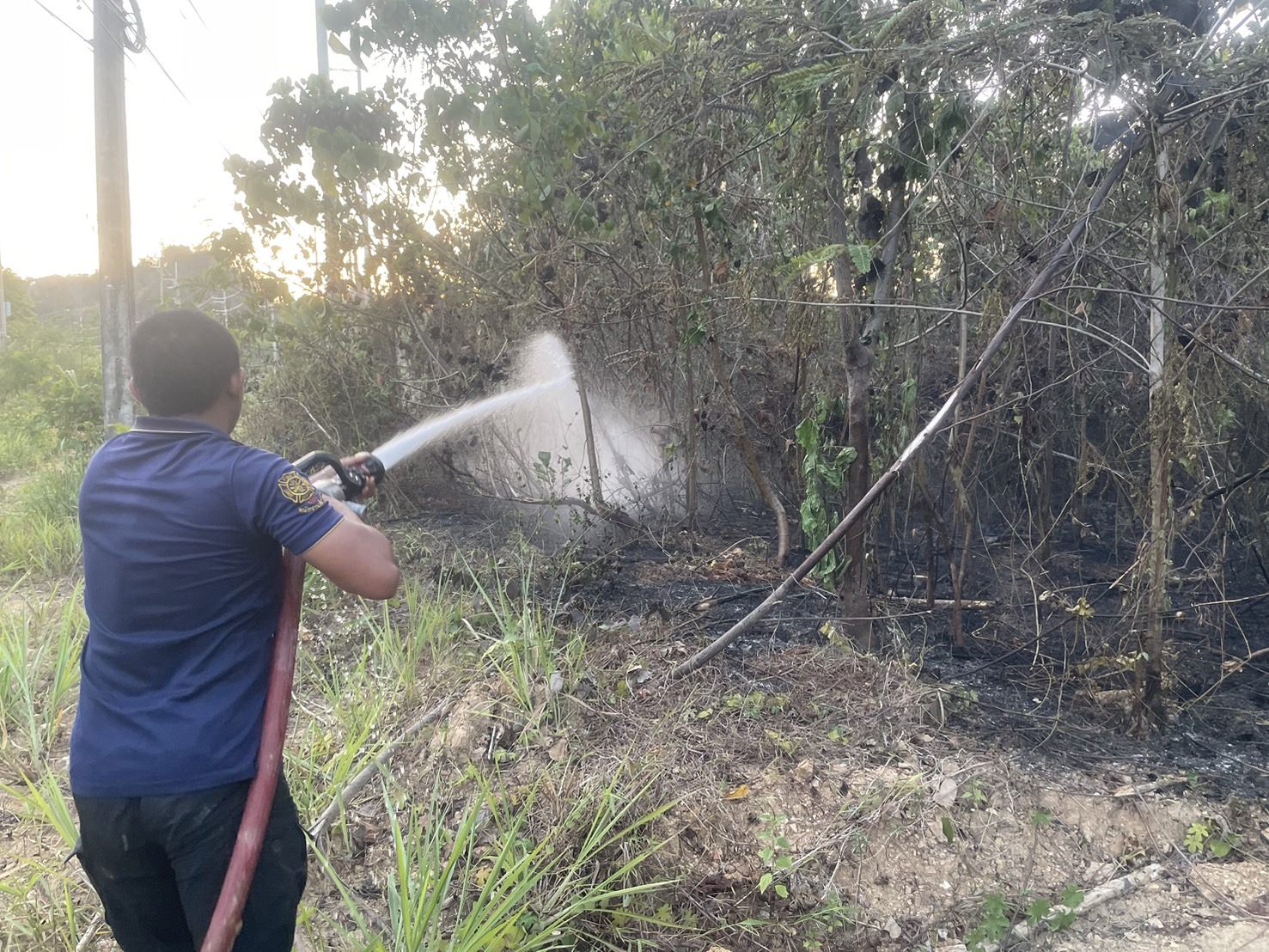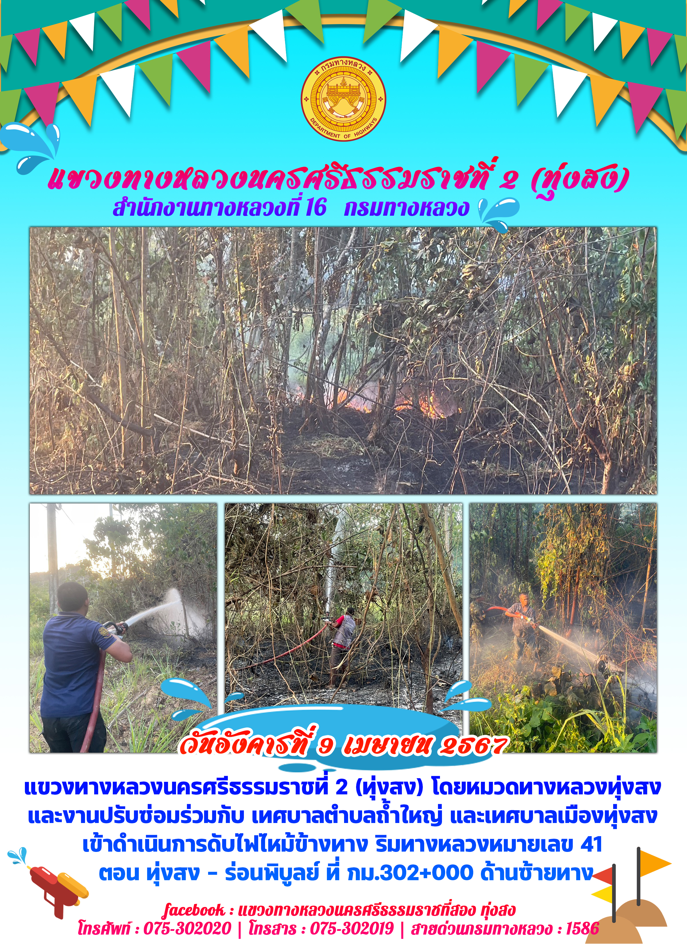 ร่วมกับเทศบาลตำบลถ้ำใหญ่ และเทศบาลเมืองทุ่งสง เข้าดำเนินการดับไฟไหม้ข้างทาง ริมทางหลวงหมายเลข 41 ตอน ทุ่งสง - ร่อนพิบูลย์ ที่ กม.302+000 ด้านซ้ายทาง