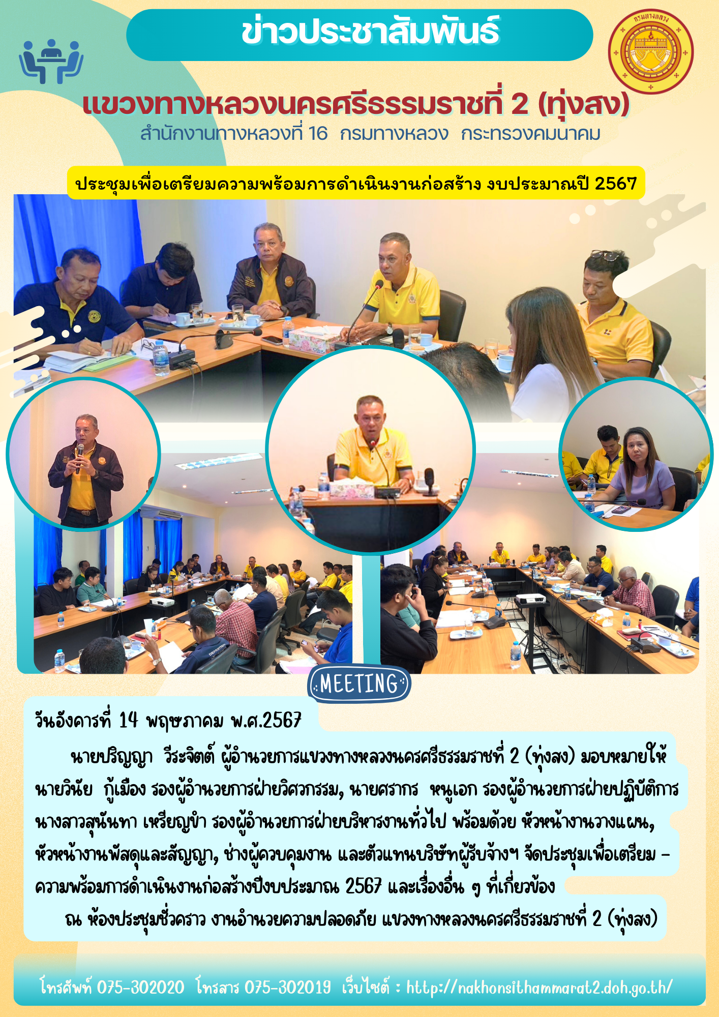 นายปริญญา วีระจิตต์ ผู้อำนวยการแขวงทางหลวงนครศรีธรรมราชที่ 2 (ทุ่งสง) มอบหมายให้ นายวินัย กู้เมือง รองผู้อำนวยการฝ่ายวิศวกรรม, นายศรากร หนูเอก รองผู้อำนวยการฝ่ายปฏิบัติการม นางสาวสุนันทา เหรียญขำ รองผู้อำนวยการฝ่ายบริหารงานทั่วไป พร้อมด้วย หัวหน้างานวางแผน, หัวหน้างานพัสดุและสัญญา, ช่างผู้ควบคุมงาน และตัวแทนบริษัทผู้รับจ้างฯ จัดประชุมเพื่อเตรียมความพร้อมการดำเนินงานก่อสร้างปีงบประมาณ 2567 และเรื่องอื่น ๆ ที่เกี่ยวข้อง