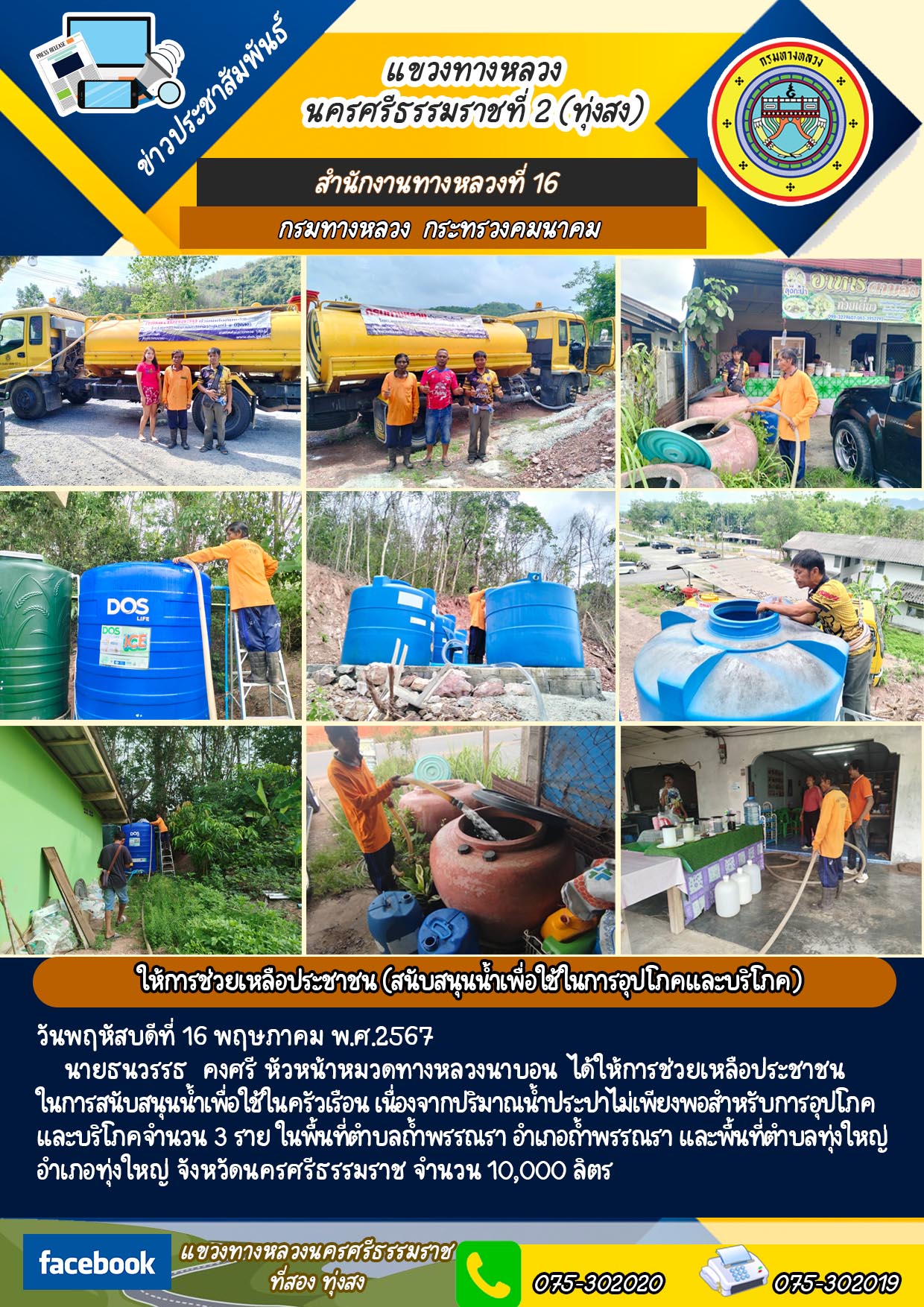 นายธนวรรธ คงศรี หัวหน้าหมวดทางหลวงนาบอน ได้ให้การช่วยเหลือประชาชนในการสนับสนุนน้ำเพื่อใช้ในครัวเรือน เนื่องจากปริมาณน้ำประปาไม่เพียงพอสำหรับการอุปโภคและบริโภคจำนวน 3 ราย ในพื้นที่ตำบลถ้ำพรรณรา อำเภอถ้ำพรรณรา และพื้นที่ตำบลทุ่งใหญ่ อำเภอทุ่งใหญ่ จังหวัดนครศรีธรรมราช จำนวน 10,000 ลิตร