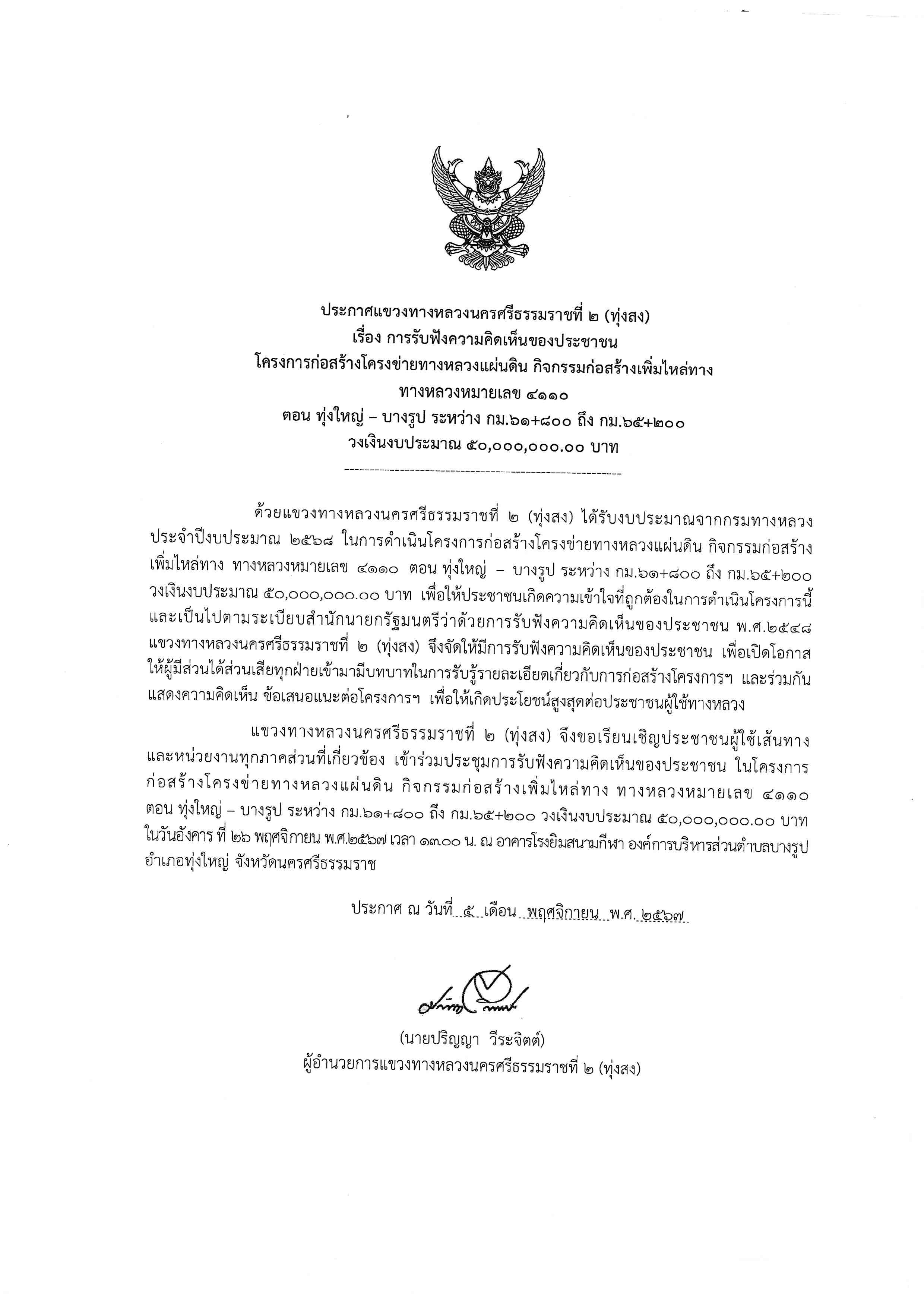 แขวงทางหลวงนครศรีธรรมราชที่ 2 (ทุ่งสง) โดยนายปริญญา วีระจิตต์ ตำแหน่งผู้อำนวยการแขวงทางหลวงนครศรีธรรมราชที่ 2 (ทุ่งสง) จะดำเนินการรับฟังความคิดเห็นของประชาชน โครงการก่อสร้างโครงข่ายทางหลวงแผ่นดิน กิจกรรมก่อสร้างเพิ่มไหล่ทาง ทางหลวงหมายเลข 4110 ตอนควบคุม 0102 ตอน ทุ่งใหญ่ - บางรูป ระหว่าง กม.61+800 ถึง กม.65+200 วงเงินงบประมาณ 50,000,000.00 บาท ในนวันจันทร์ที่ 26 พฤศจิกายน พ.ศ.2567 เวลา 13.30 น. ให้ผู้มีส่วนได้ส่วนเสียทุกฝ่ายเข้ามามีบทบาทในการรับรู้รายละเอียดเกี่ยวกับการก่อสร้างโครงการฯ และร่วมกันแสดงความคิดเห็น ข้อเสนอแนะต่อโครงการฯ เพื่อให้เกิดประโยชน์สูงสุดต่อประชาชนผู้ใช้ทางหลวง