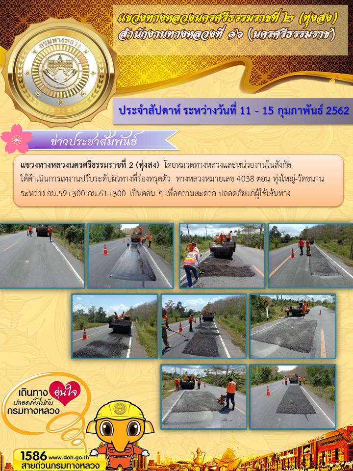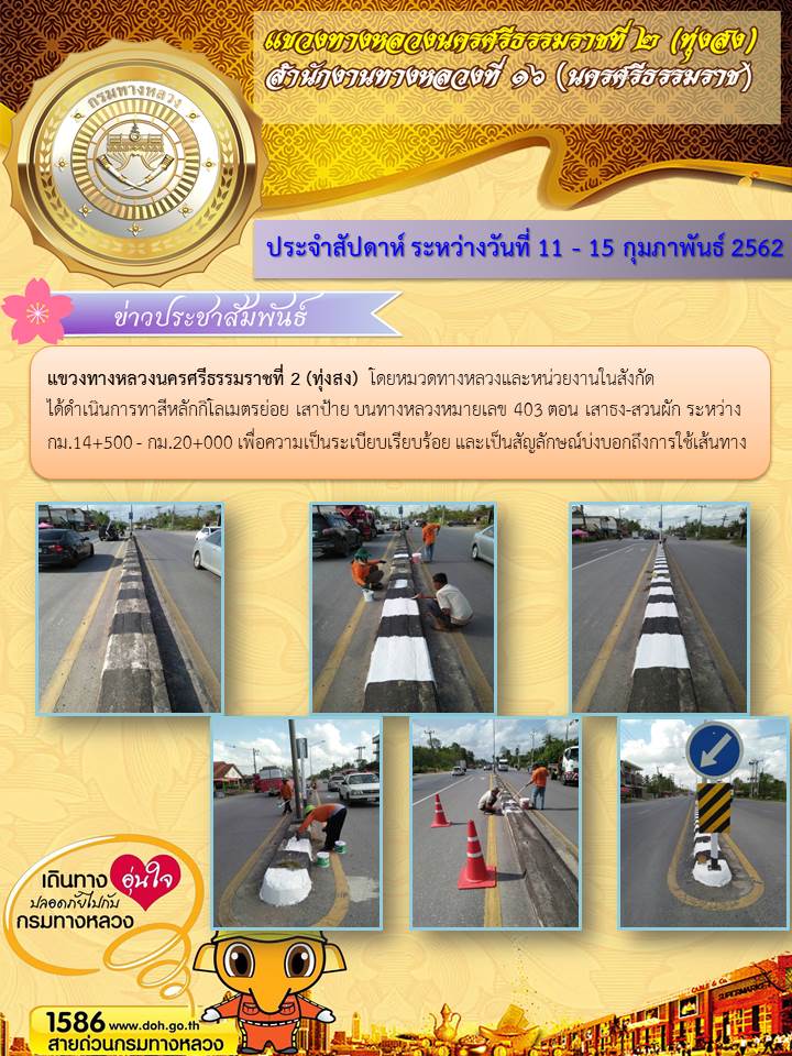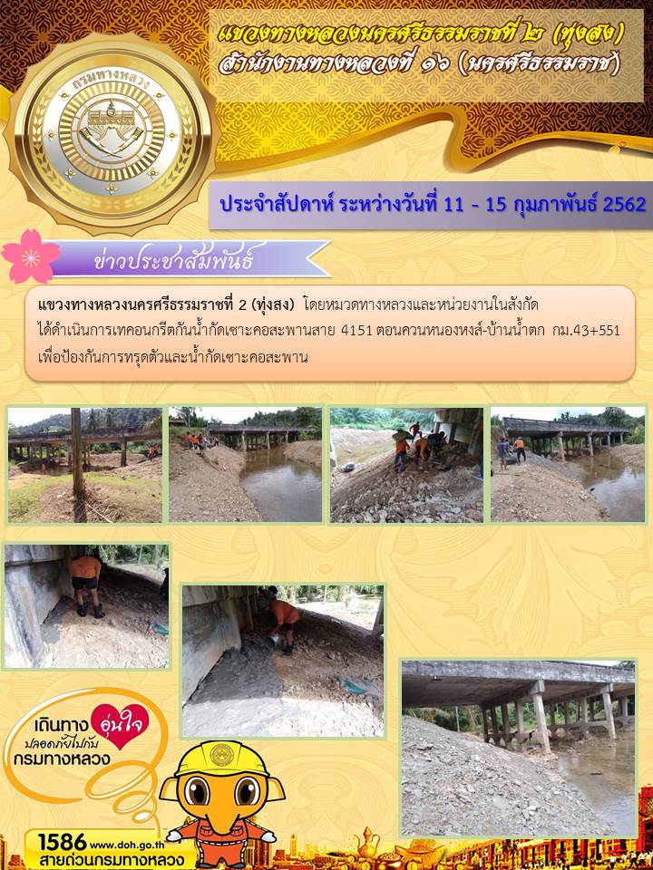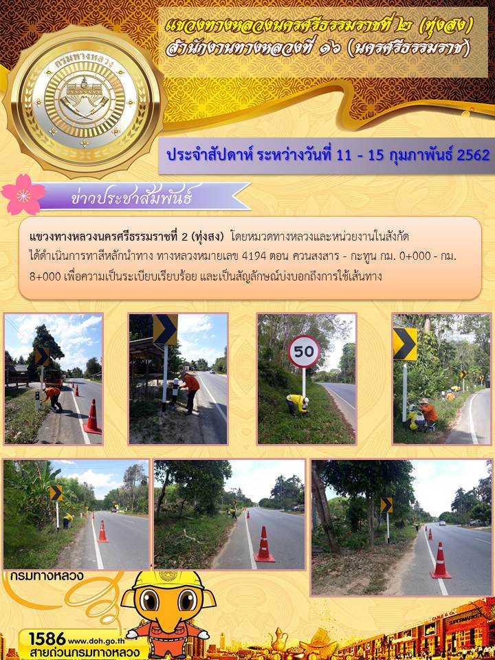 แขวงทางหลวงนครศรีธรรมราชที่ 2 (ทุ่งสง) โดยหมวดทางหลวงและหน่วยงานในสังกัด ได้ดำเนินการ รายงานผลการปฎิบัติงานวันที่ 11 กุมภาพันธ์ 2562-15 กุมภาพันธ์ 2562
