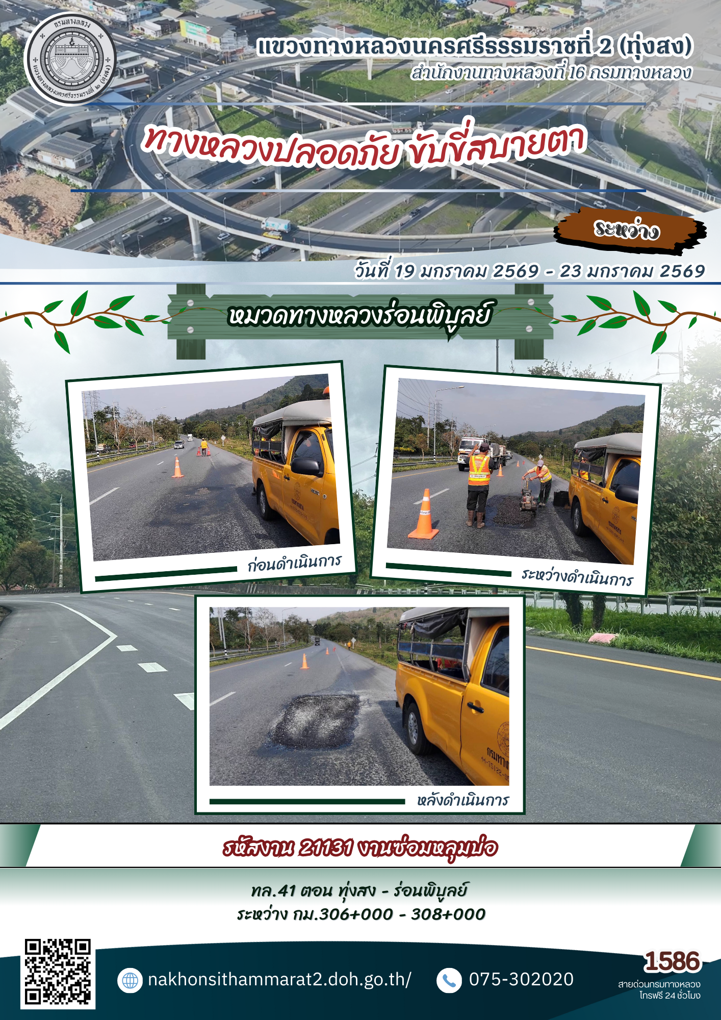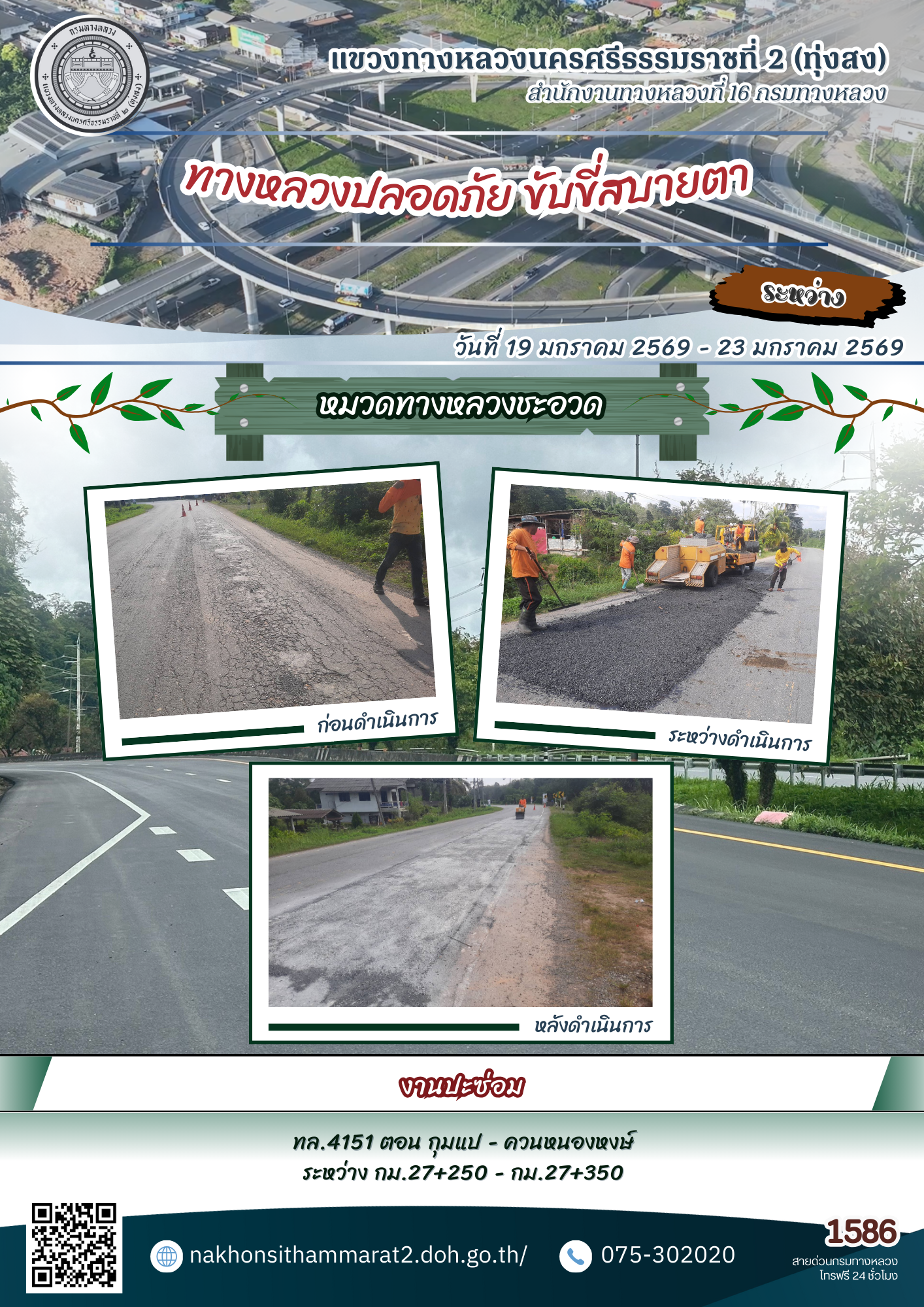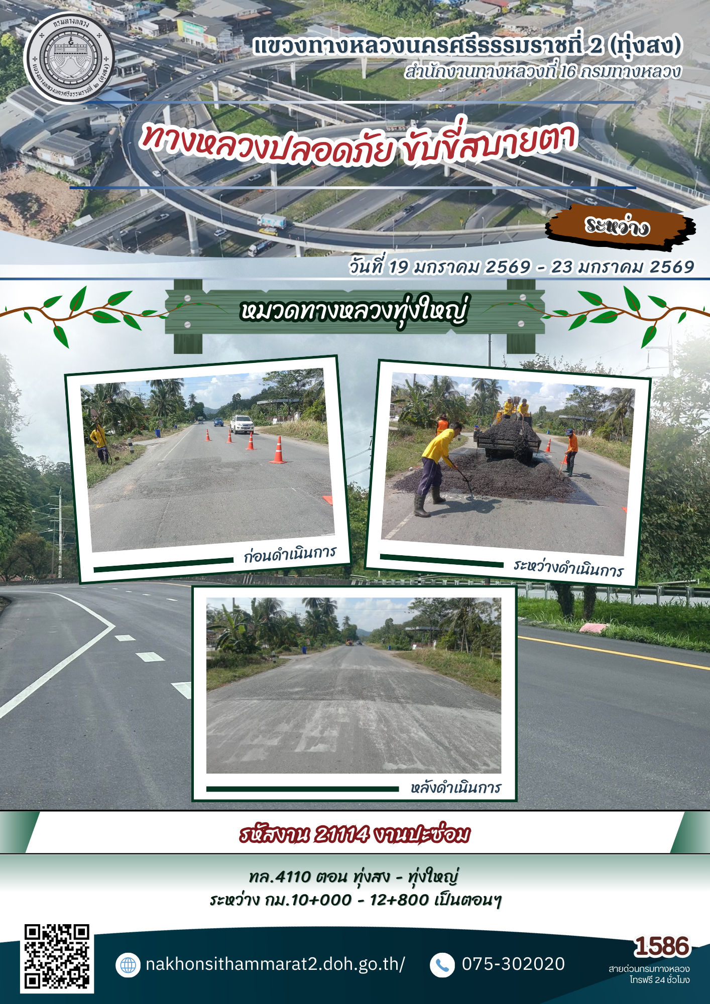 ผลการปฏิบัติงานของหมวดทางหลวงและหน่วยงานในสังกัด แขวงทางหลวงนครศรีธรรมราชที่ 2 (ทุ่งสง) ระหว่างวันที่ 19 - 23 มกราคม พ.ศ.2569