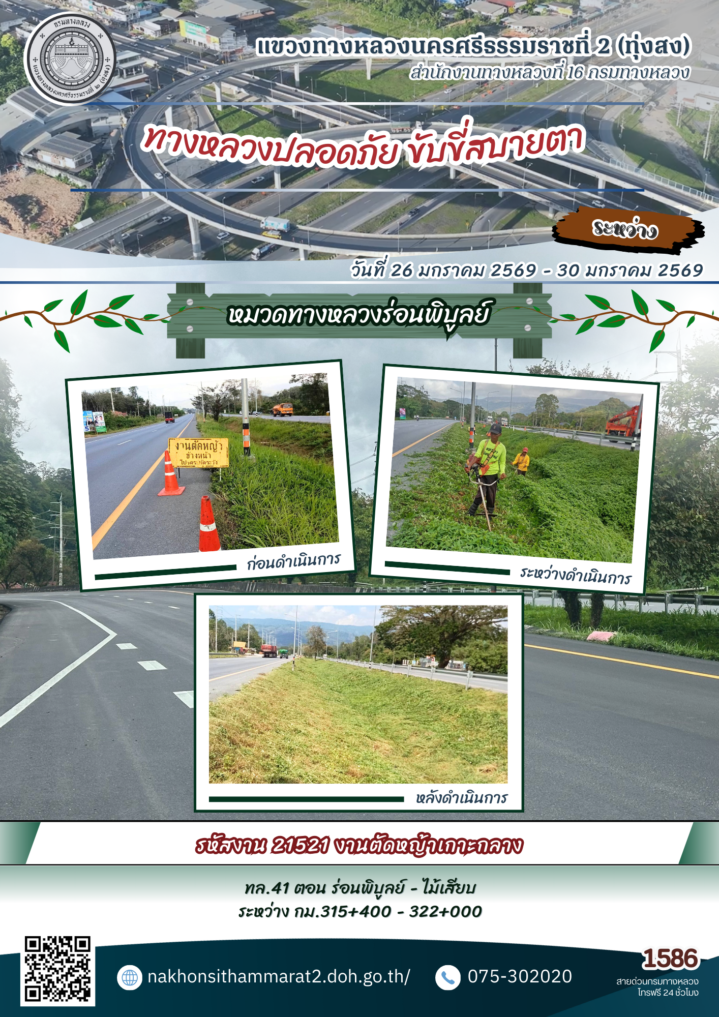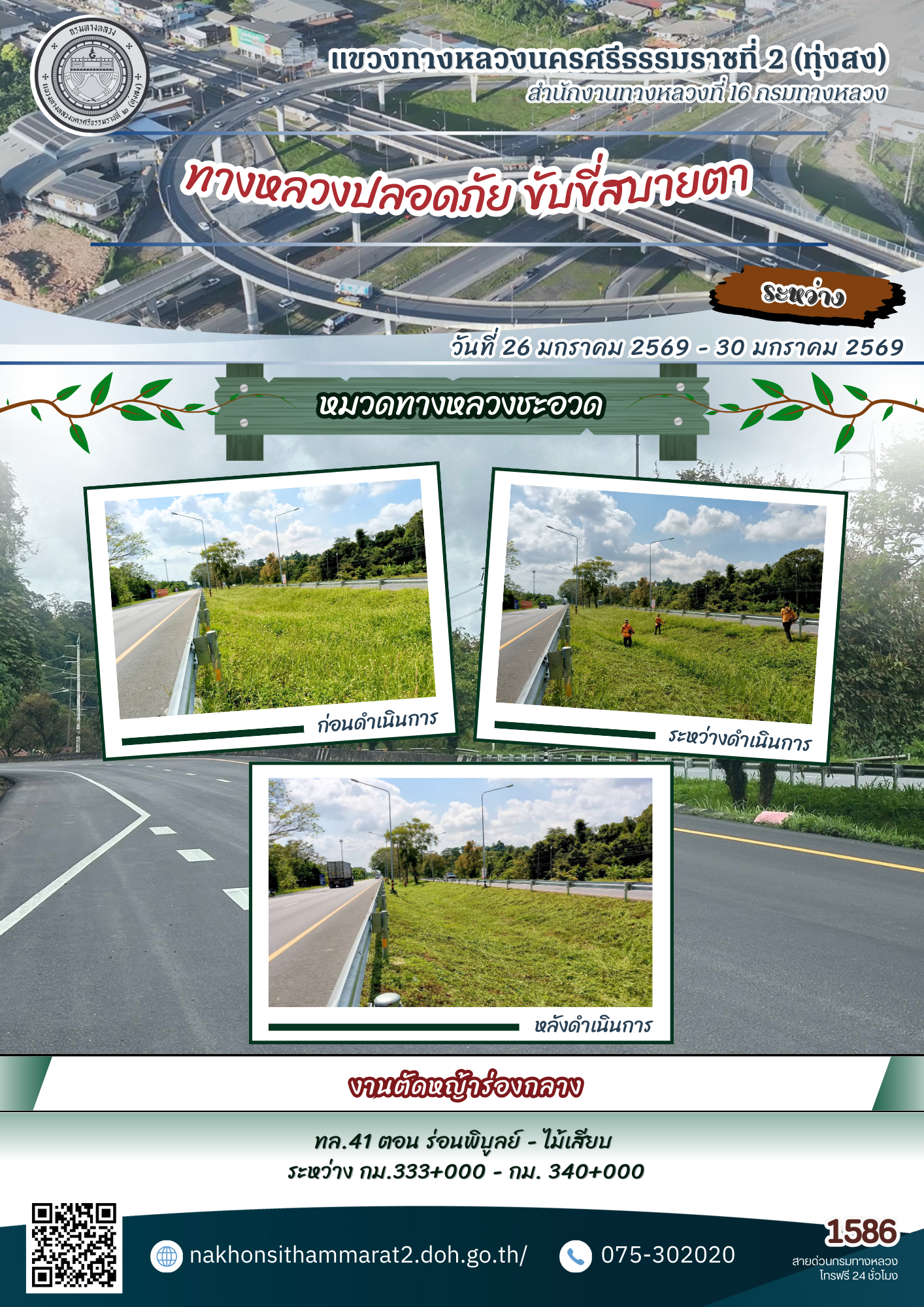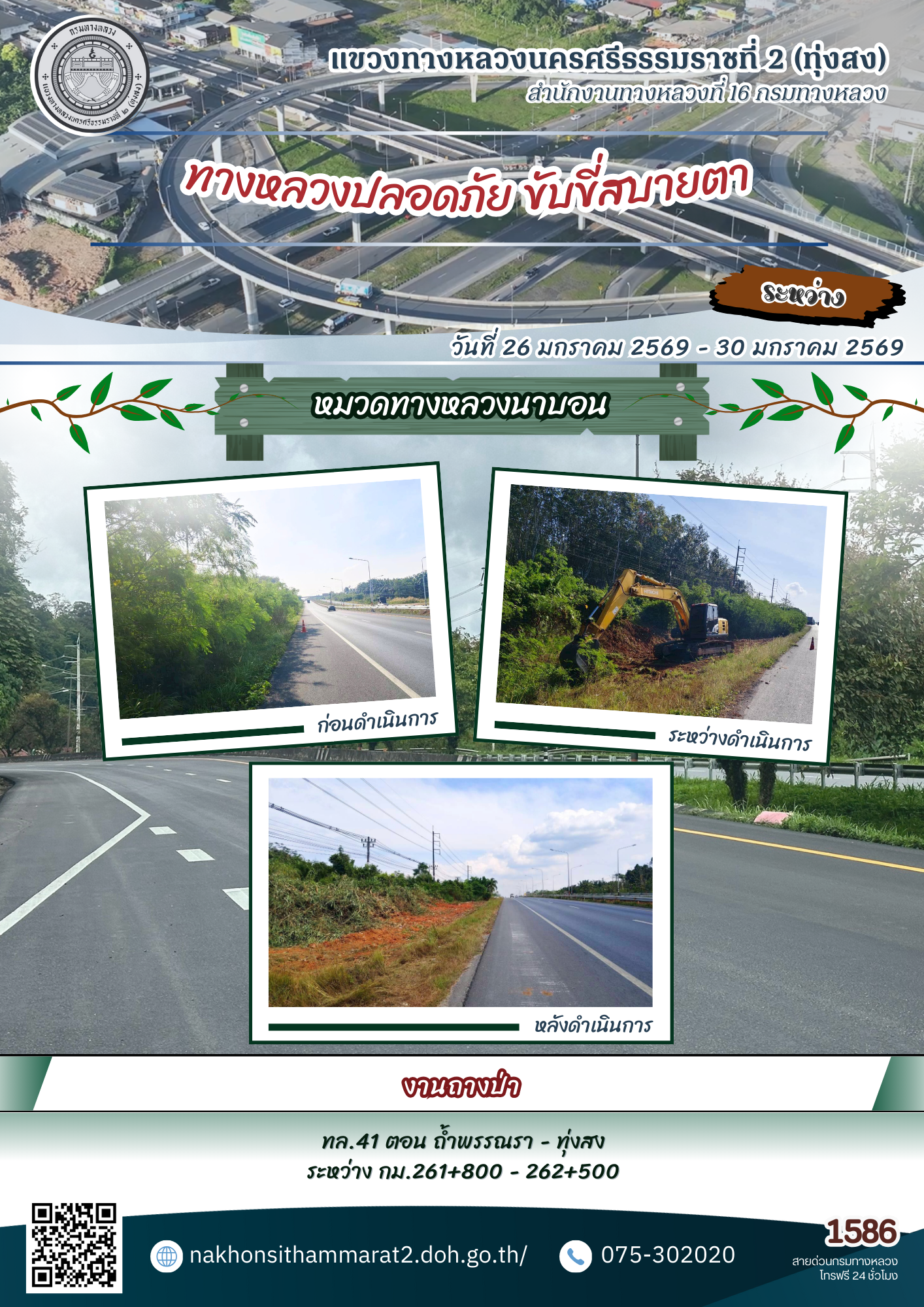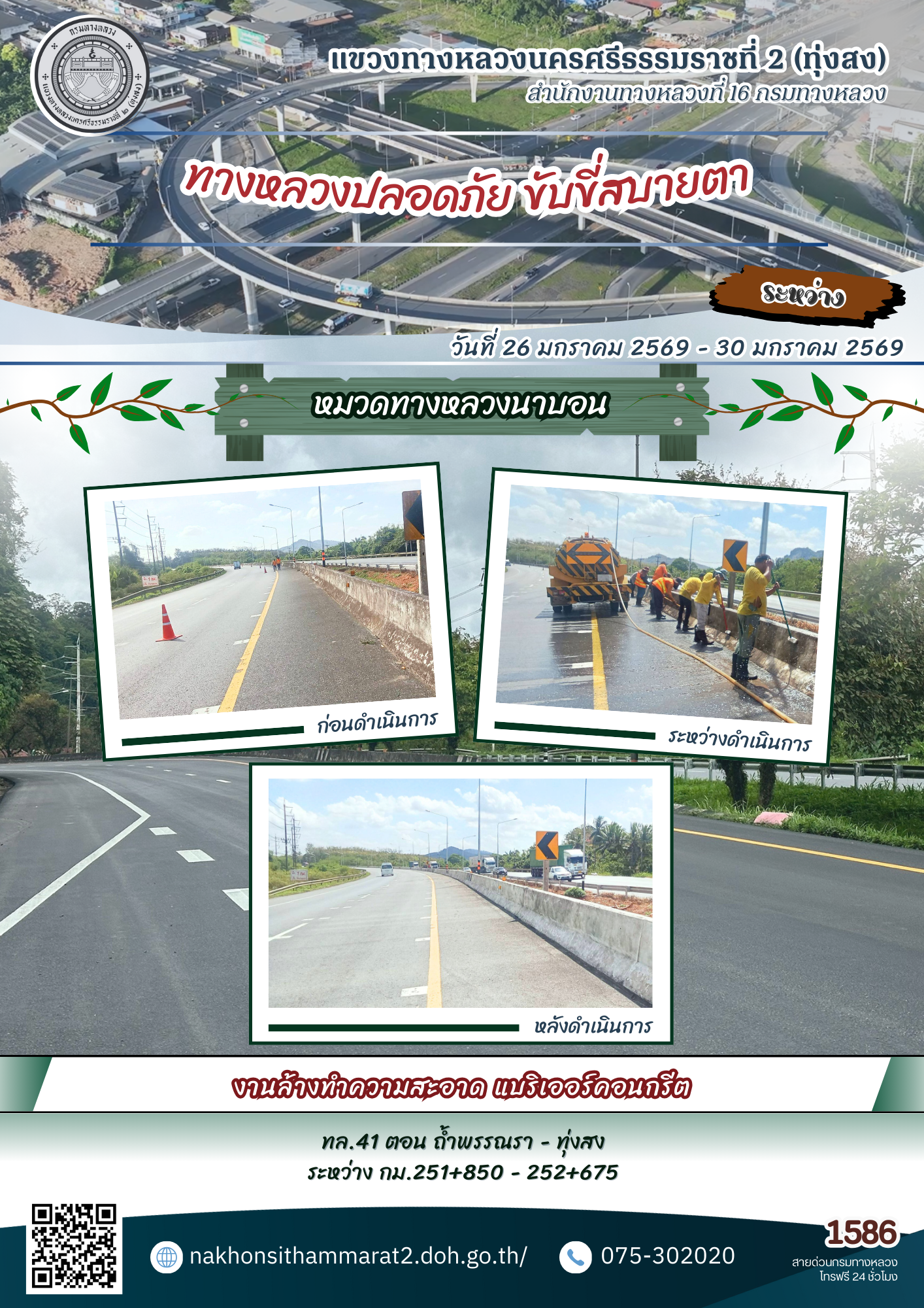 ผลการปฏิบัติงานของหมวดทางหลวงและหน่วยงานในสังกัด แขวงทางหลวงนครศรีธรรมราชที่ 2 (ทุ่งสง) ระหว่างวันที่ 26 - 30 มกราคม 2569